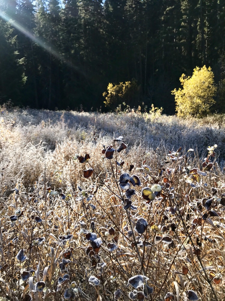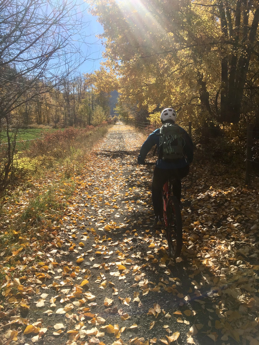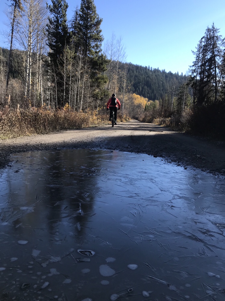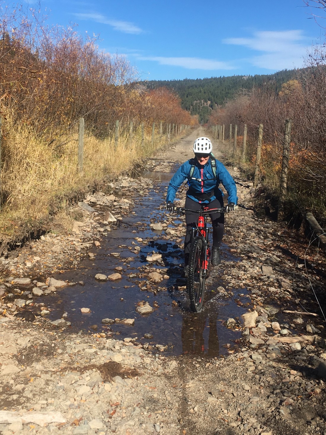 As we rounded a corner into the village of Brookmere (four houses?) the trail levelled off and we felt the sun on our backs and frozen fingers for the first time. The puddles – and cyclists – slowly thawed and the ride settled in to ranch lands and golden poplar groves.