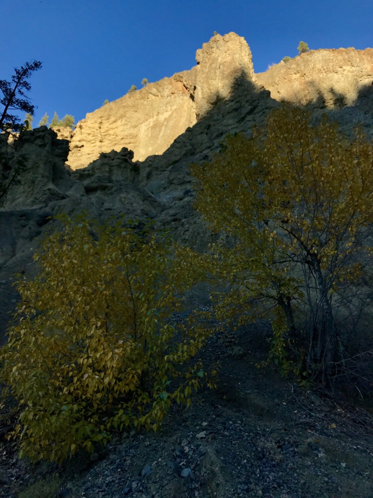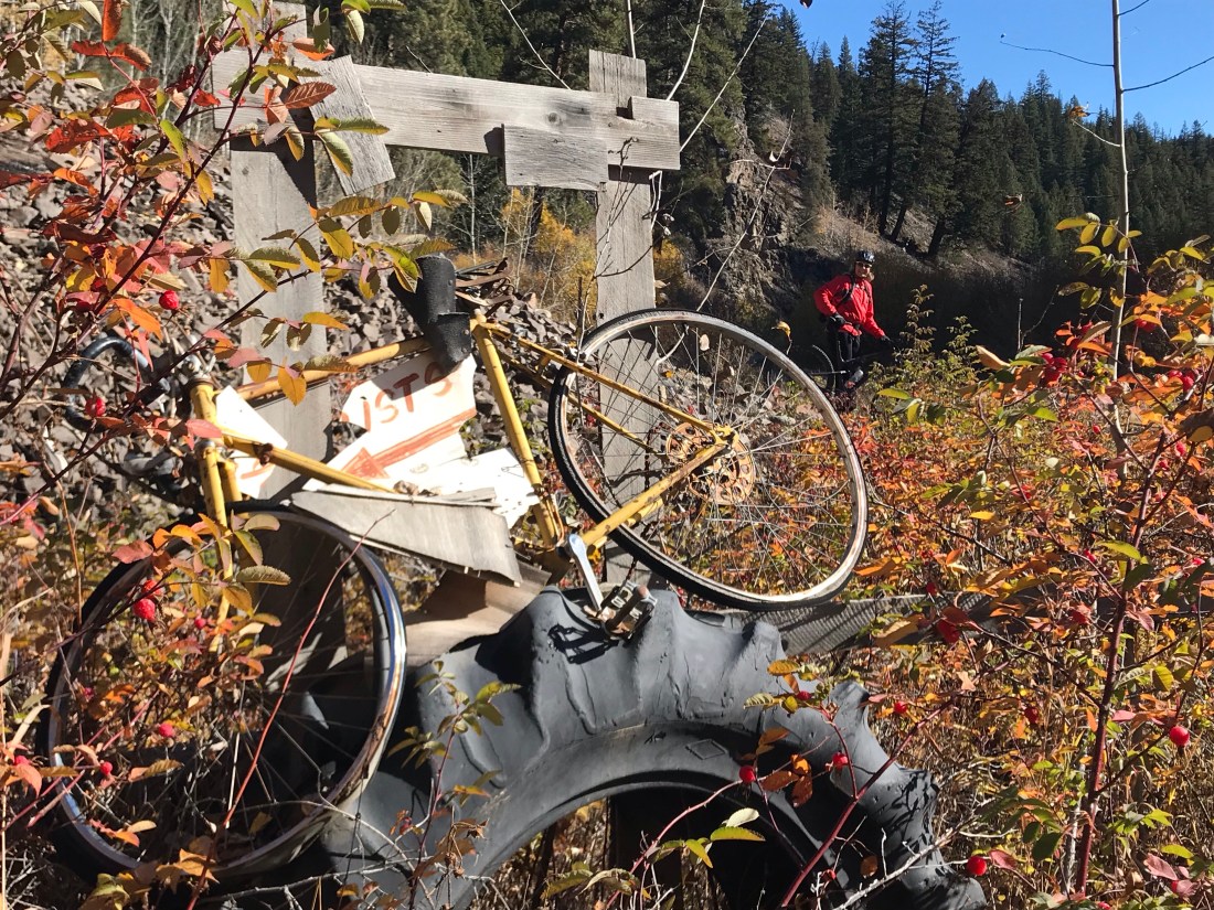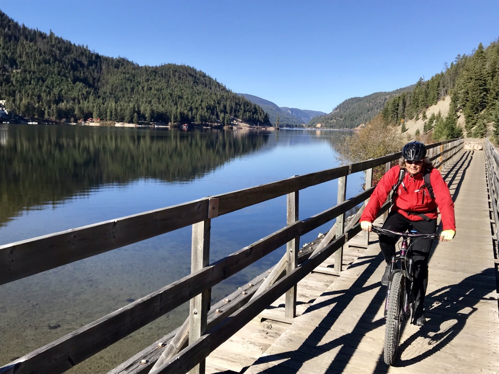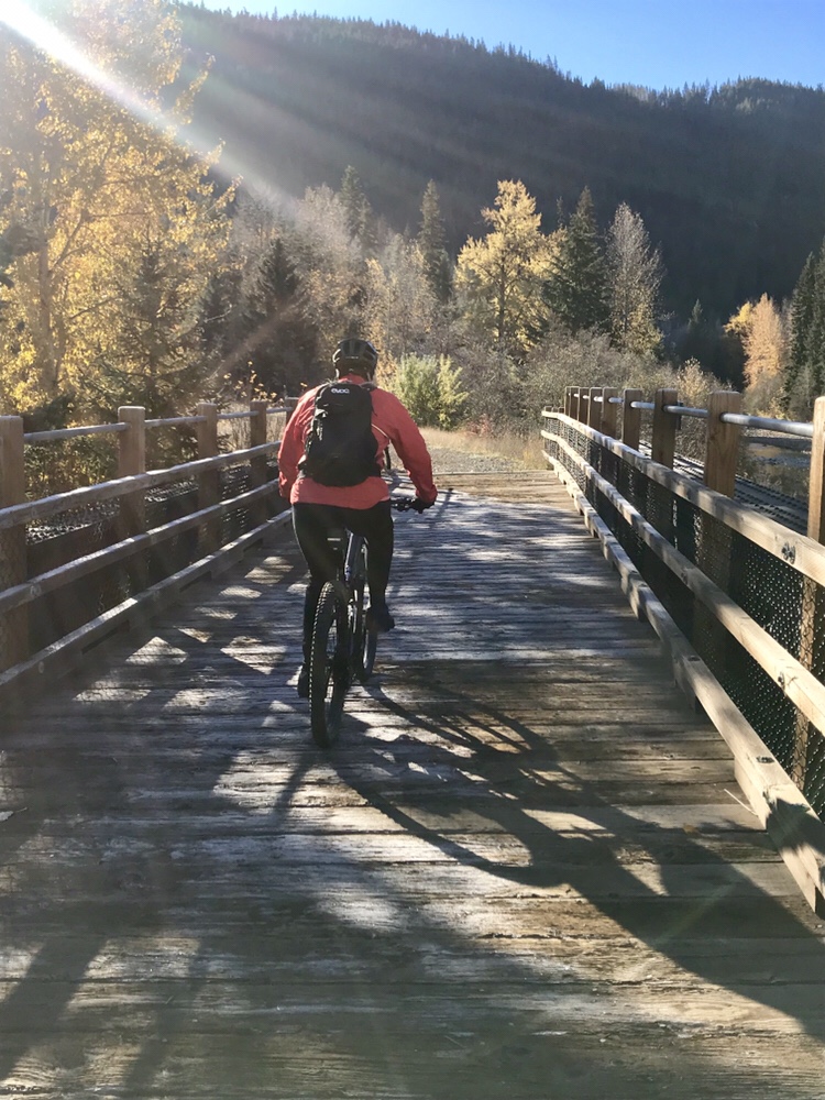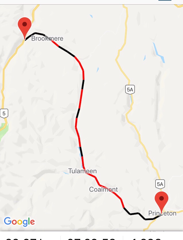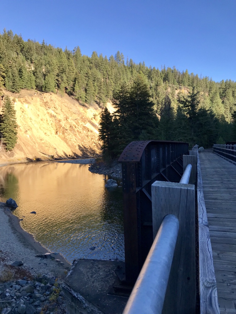 Lunch 43km in at the Trading Post in Tulameen came after a gorgeous few km along the Tulameen Lake. A few km further on along the Tulameen river lay the semi-ghost town of Coalmont. Then down the valley with towering cliffs, tunnels and bridges along the Similkameen River and in to Princeton. The last hour was in the cold late afternoon with gorgeous golden light.