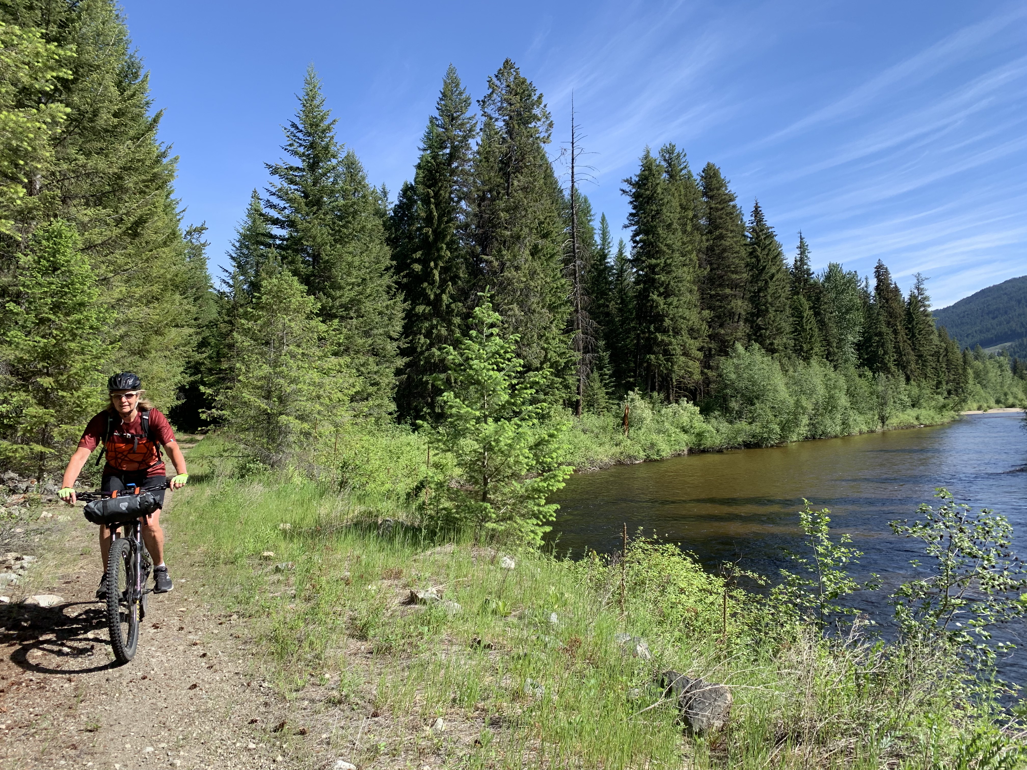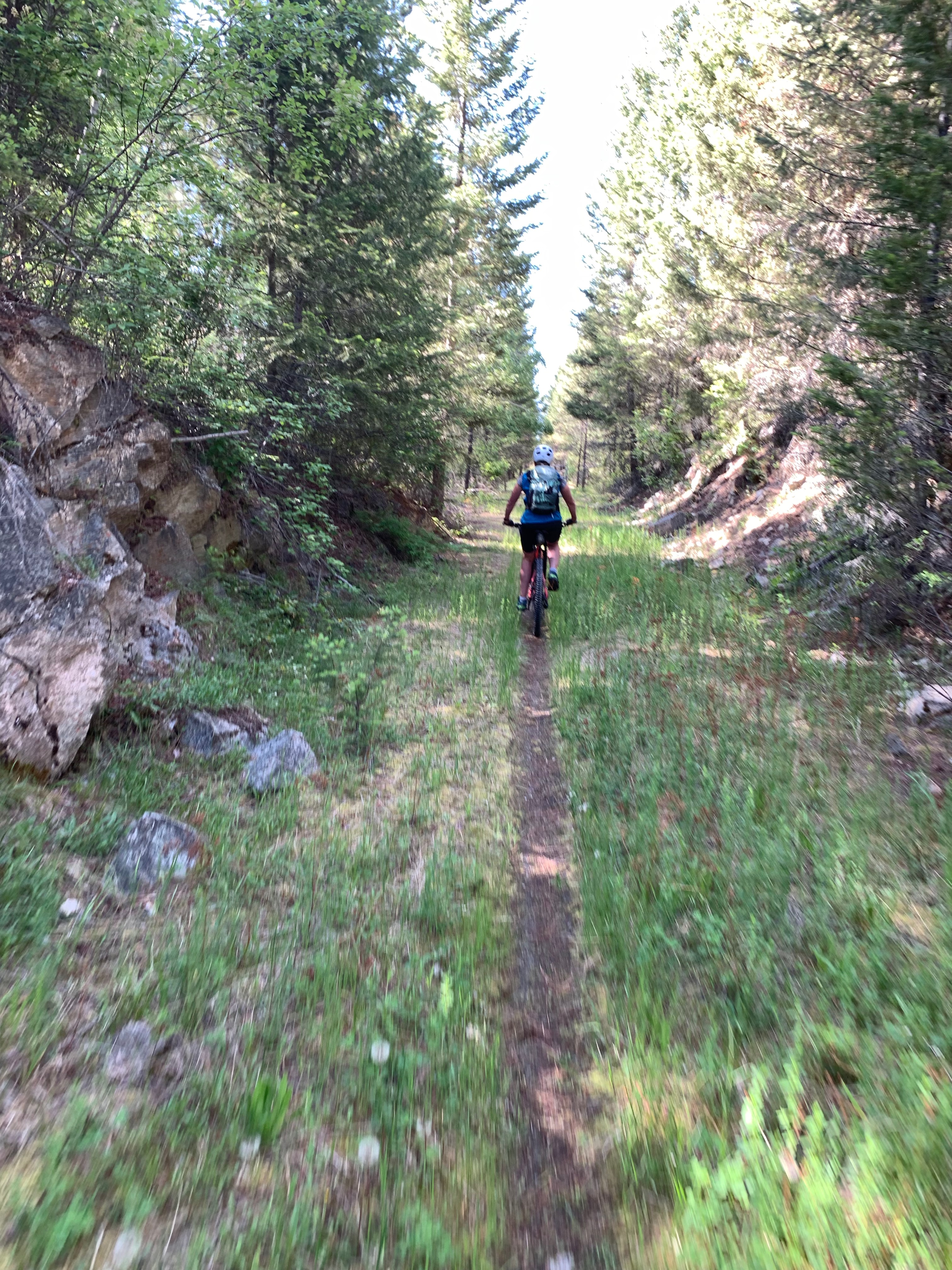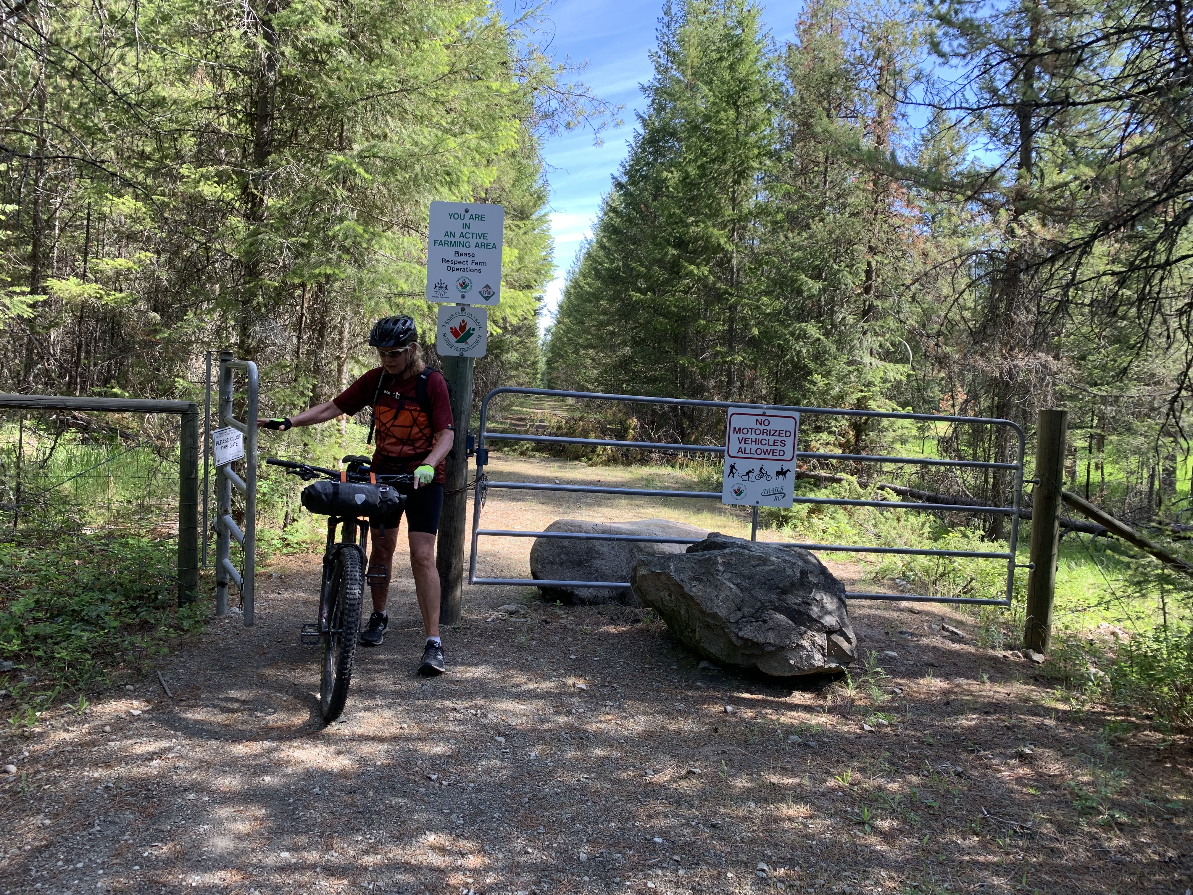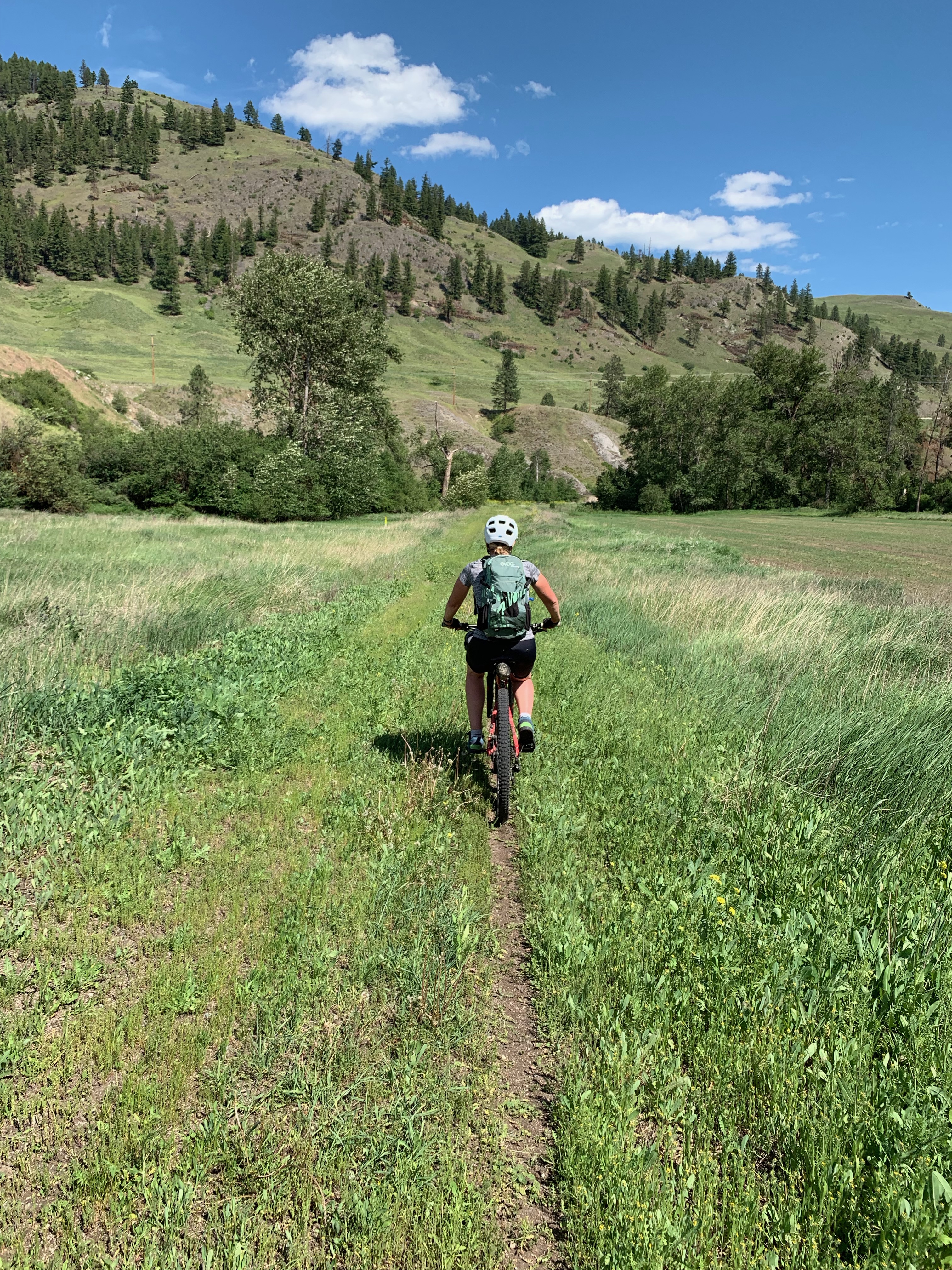 One thousand kilometres done – and much more fun today! Beautiful trail along the West Kettle River through pine groves and bright farm meadows with enough diversity to alleviate boredom.