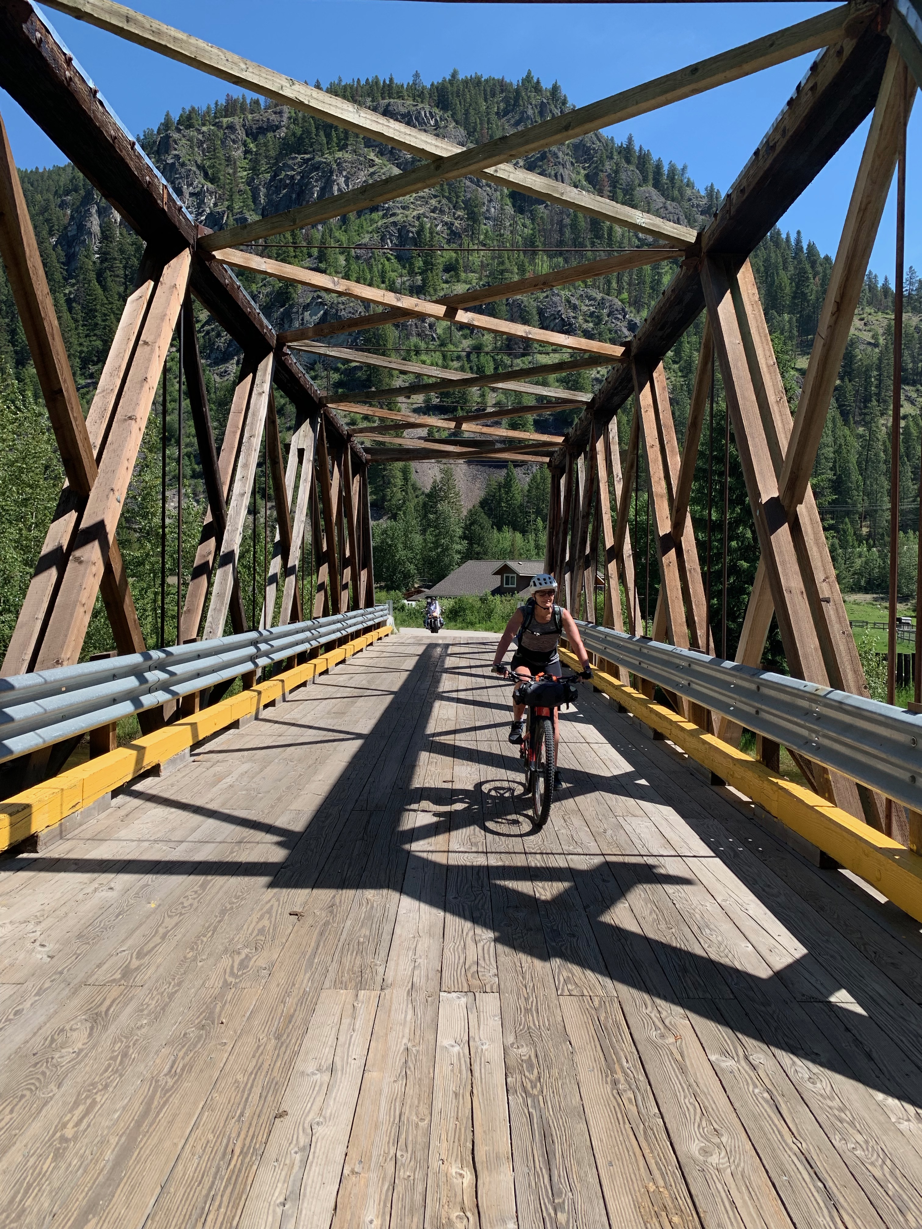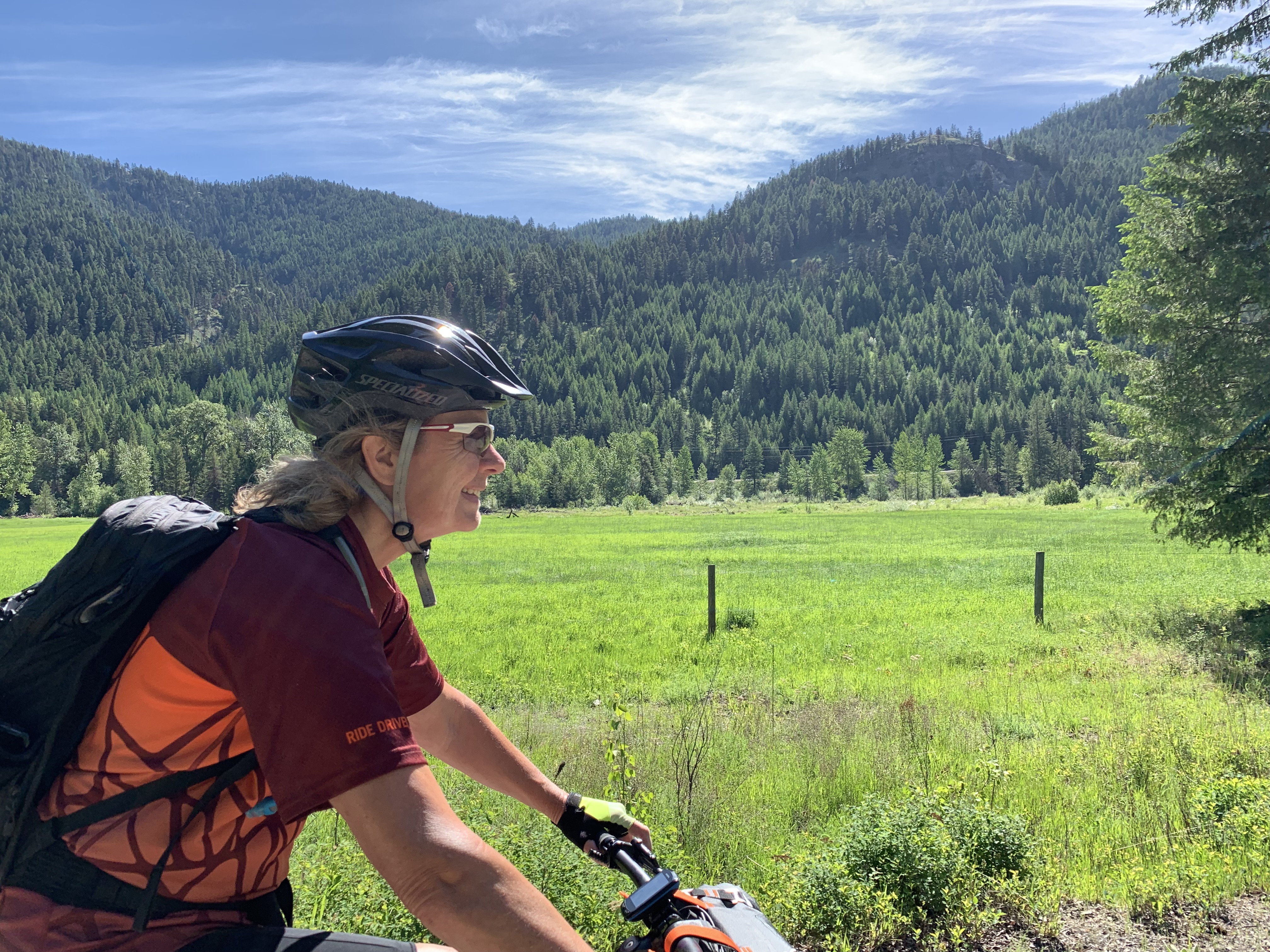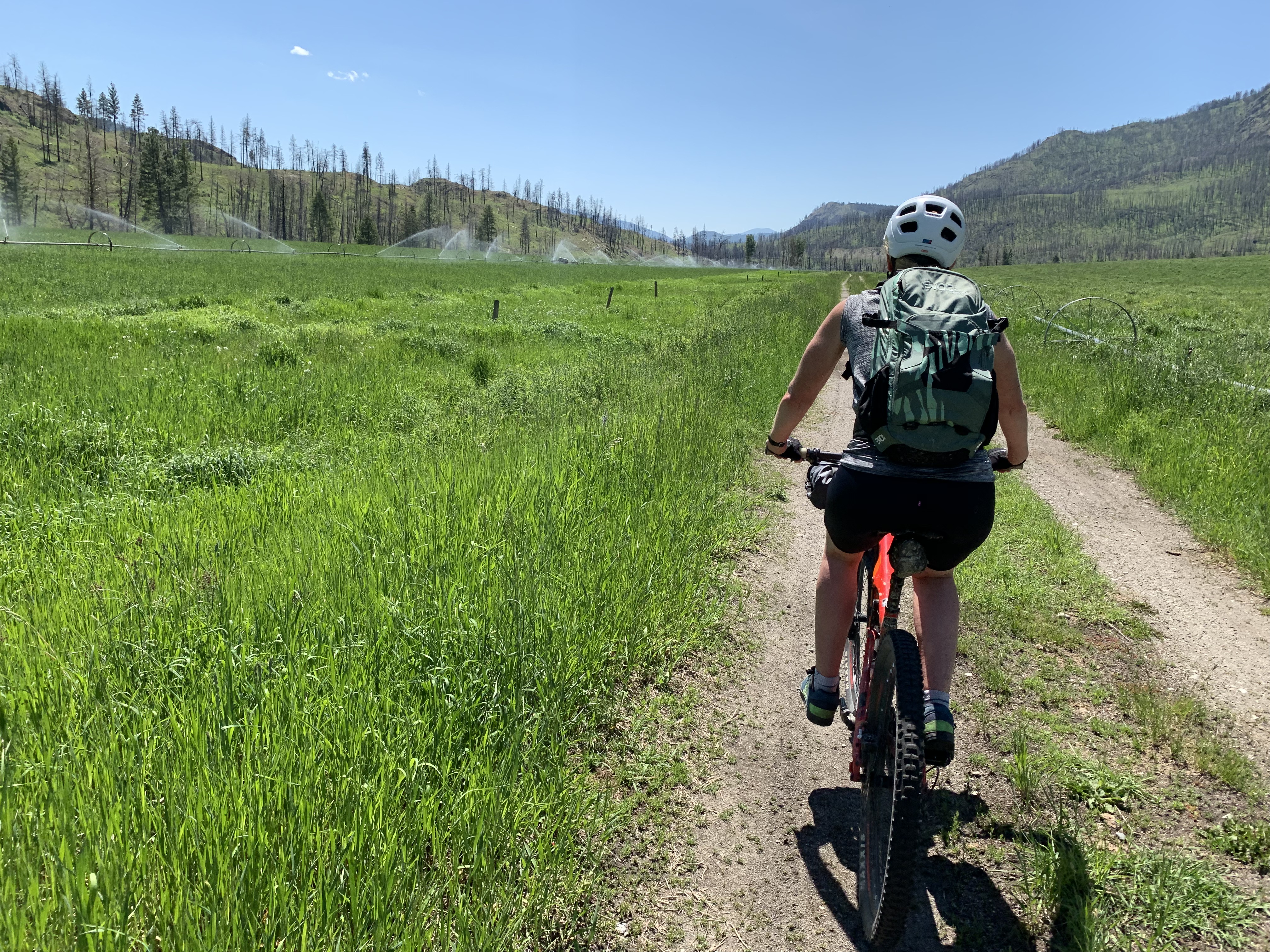 One thousand kilometres done – and much more fun today! Beautiful trail along the West Kettle River through pine groves and bright farm meadows with enough diversity to alleviate boredom.