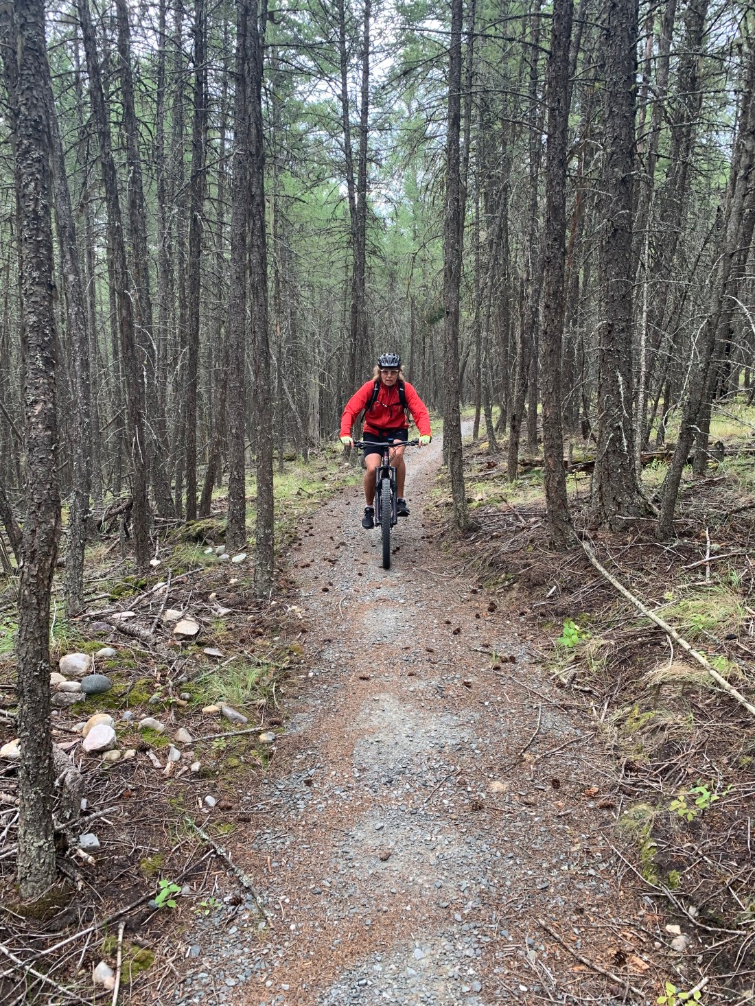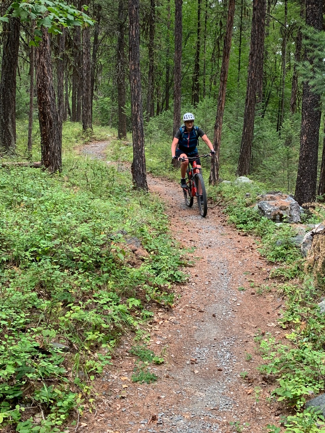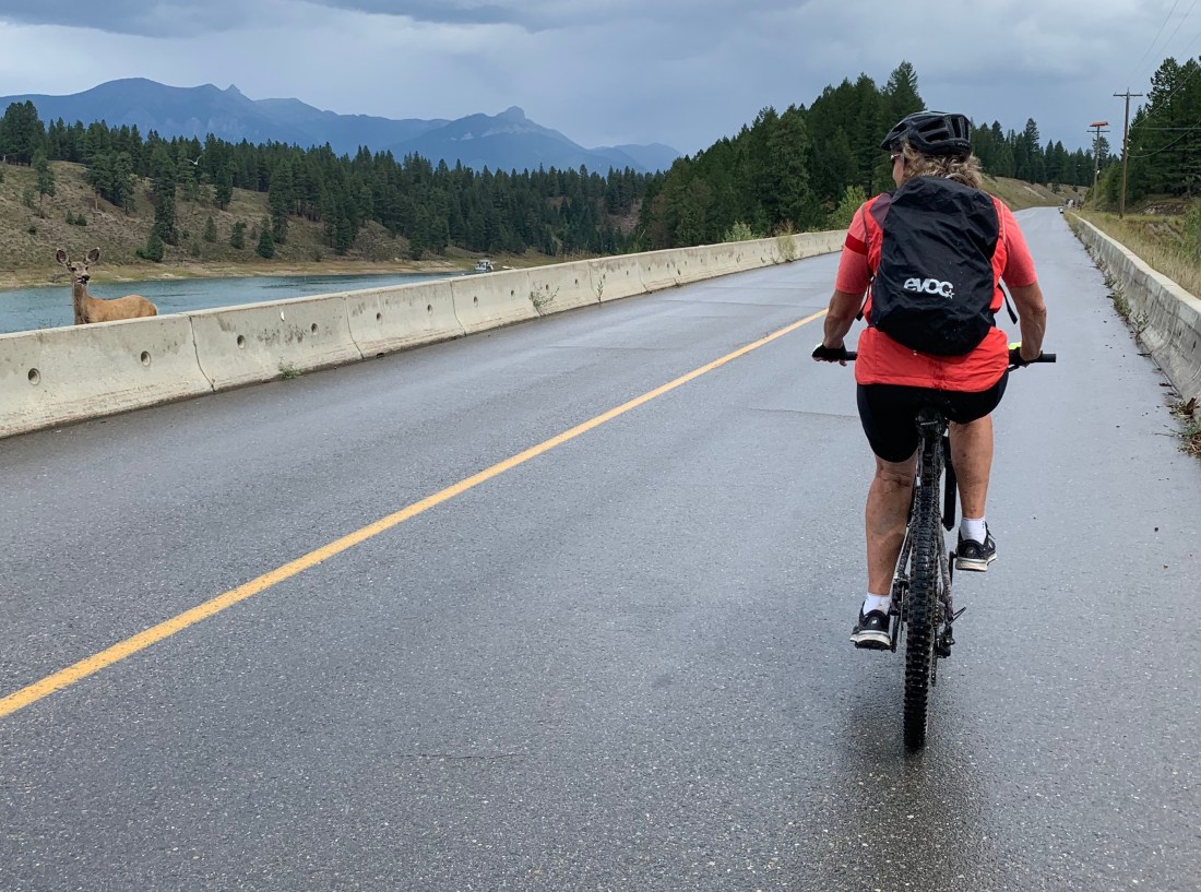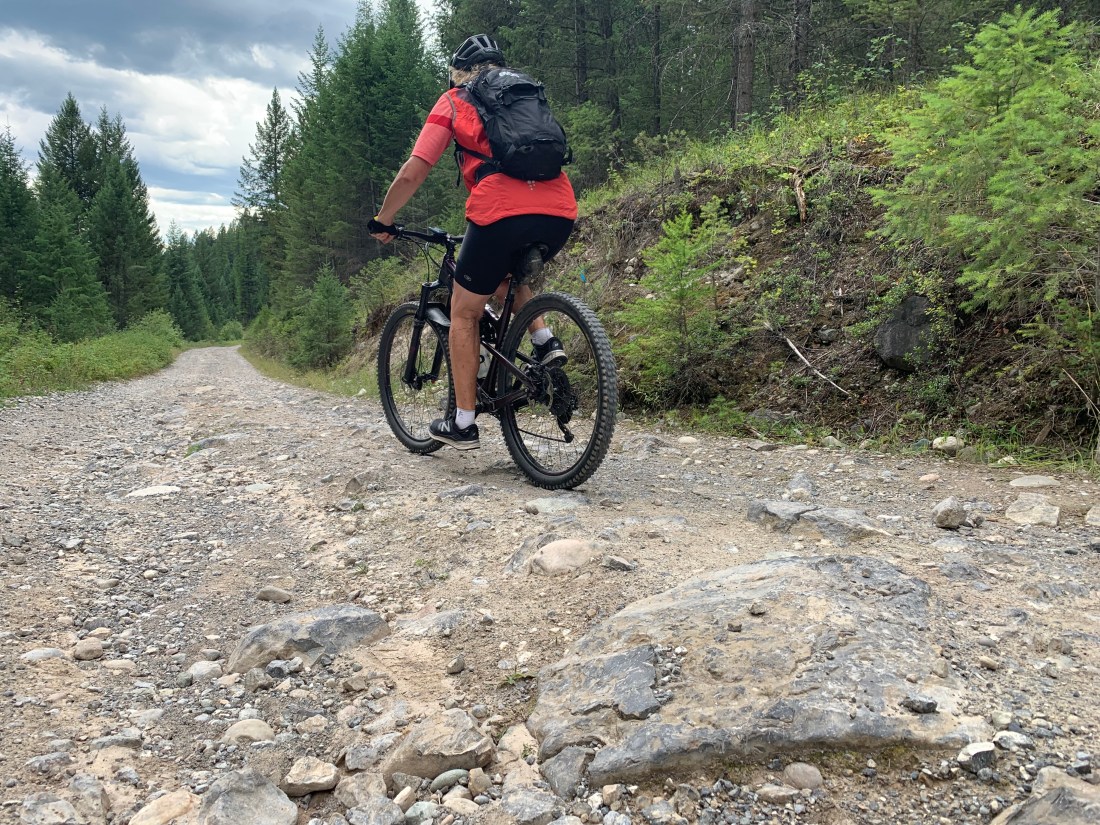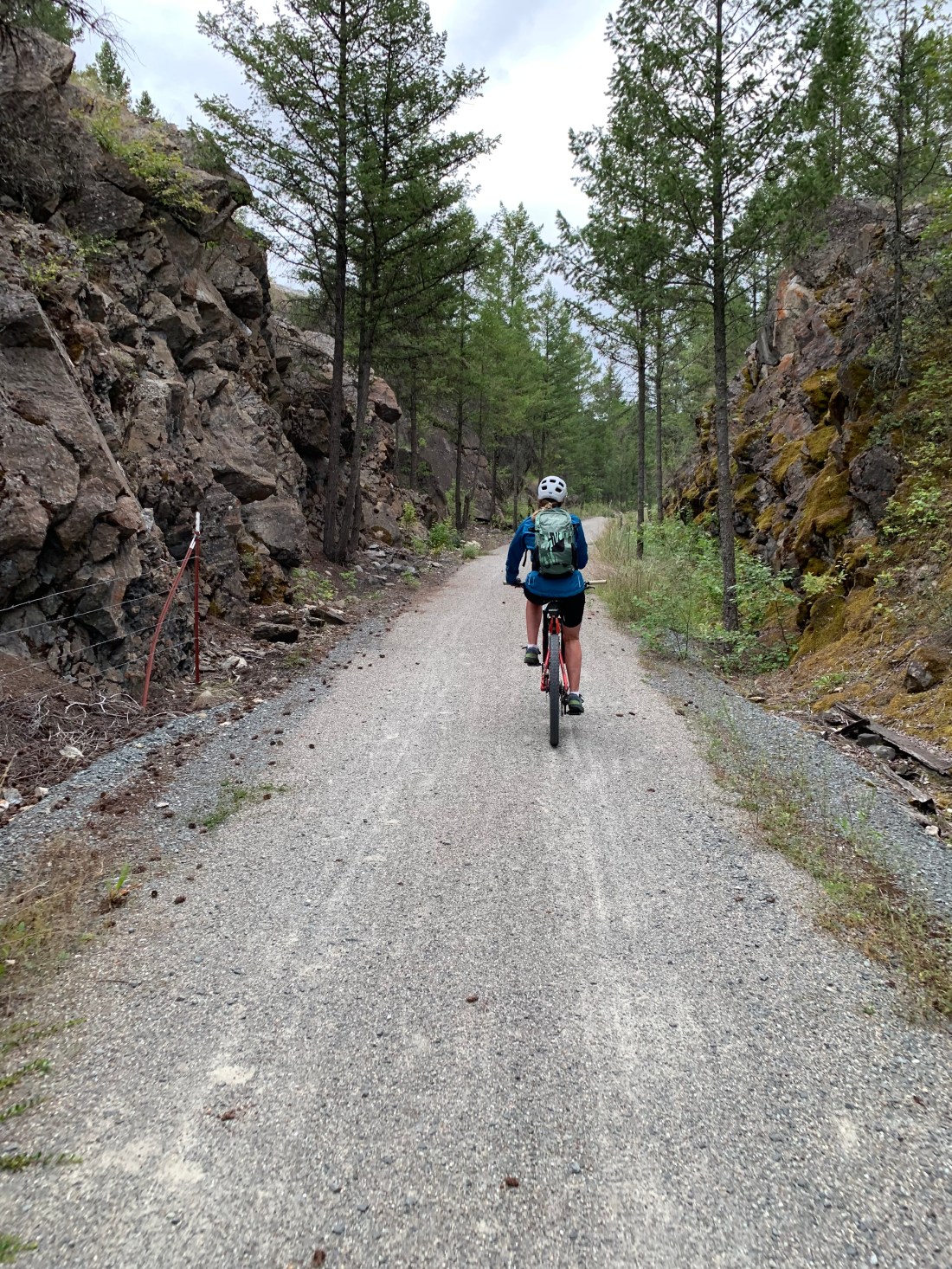 The trail followed an old railway for about 15km and it brought us our first bear – a beautiful, large but timid black bear that ran along about 80m ahead of us – some elk, deer and lots of very healthy truly free range, grass-fed cows. We then turned off onto the Mayood trail – a delightful sweeping single track of gravel that felt completely at one with the forest. Clearly the trail was cut to fit the forest and not the other way around and it provided a truly special ride. We climbed for the first 10km then sped along a rolling, cruising, switchbacking run with such narrow gaps between trees it felt intimate with the forest and the wildlife. We kept thinking of all the family and friends who would LOVE this trail. But it also presented us the first grumpy, unfriendly mountain biker we have ever met. No amount of friendly “hellos” from us could raise his eyes from the trail. Or a smile.