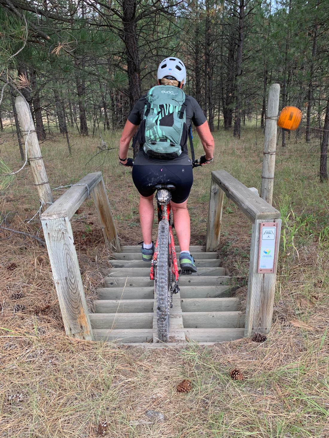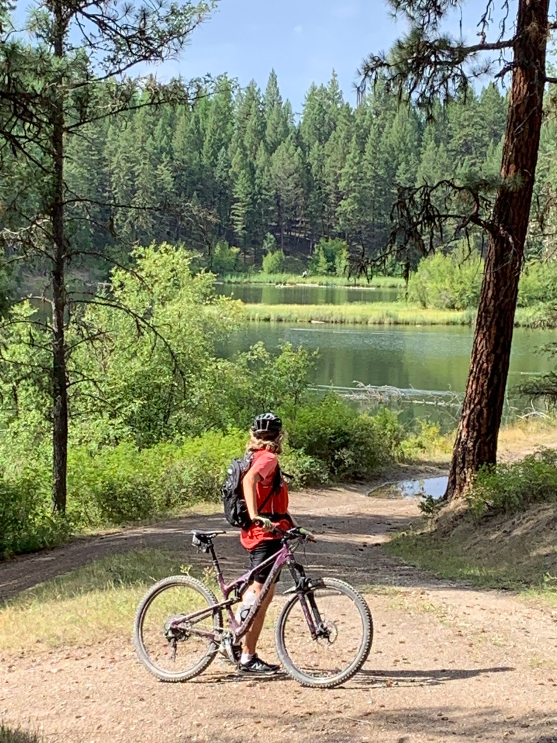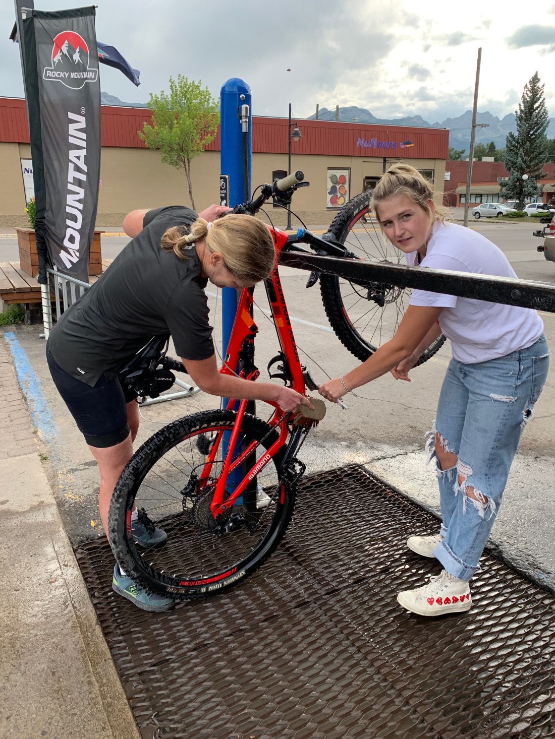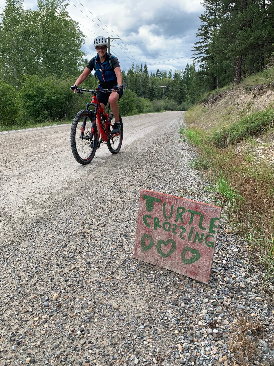 The trail followed an old railway for about 15km and it brought us our first bear – a beautiful, large but timid black bear that ran along about 80m ahead of us – some elk, deer and lots of very healthy truly free range, grass-fed cows. We then turned off onto the Mayood trail – a delightful sweeping single track of gravel that felt completely at one with the forest. Clearly the trail was cut to fit the forest and not the other way around and it provided a truly special ride. We climbed for the first 10km then sped along a rolling, cruising, switchbacking run with such narrow gaps between trees it felt intimate with the forest and the wildlife. We kept thinking of all the family and friends who would LOVE this trail. But it also presented us the first grumpy, unfriendly mountain biker we have ever met. No amount of friendly “hellos” from us could raise his eyes from the trail. Or a smile.