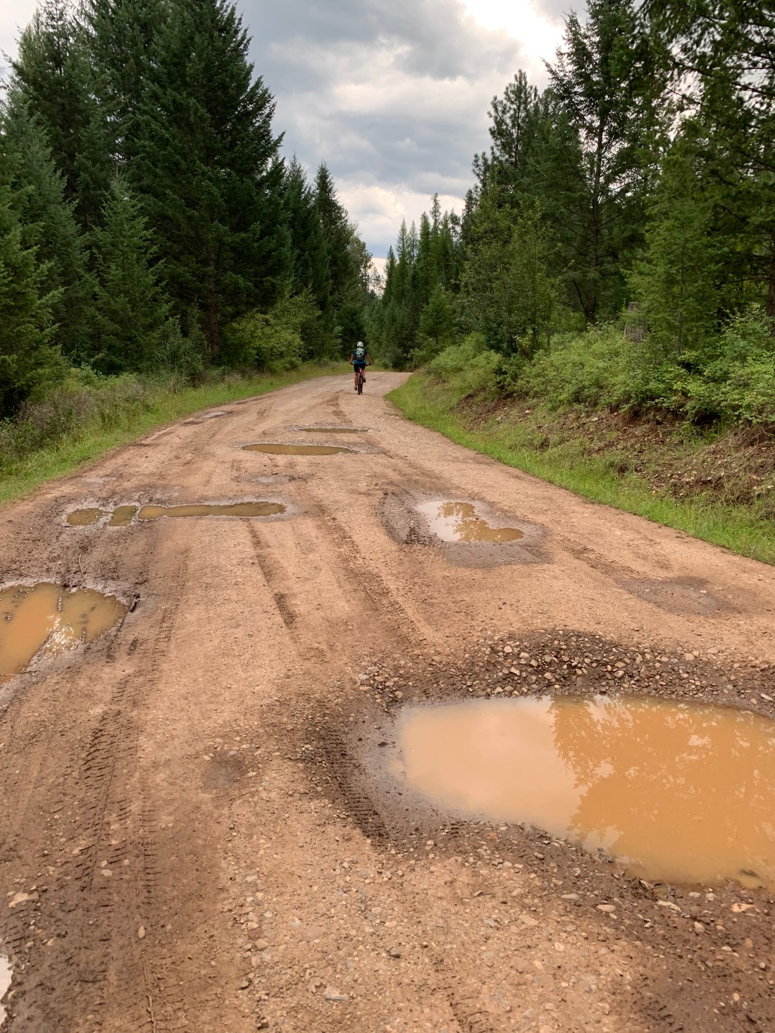 But that was pretty much the end of the fun for the day and we were less than half way. The afternoon was mostly a sloggy climb of pine forests, puddles and potholes as weary bodies travailed on a rocky road. Recent downpours meant every dip was filled with puddles or mini-lakes and we were caked in mud when, about 10km outside Elko, we broke out into beautiful blonde grass plains under craggy mountains.