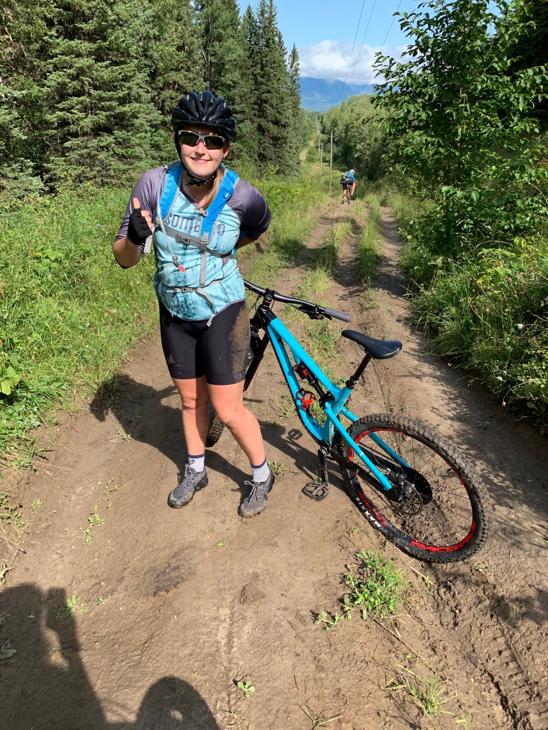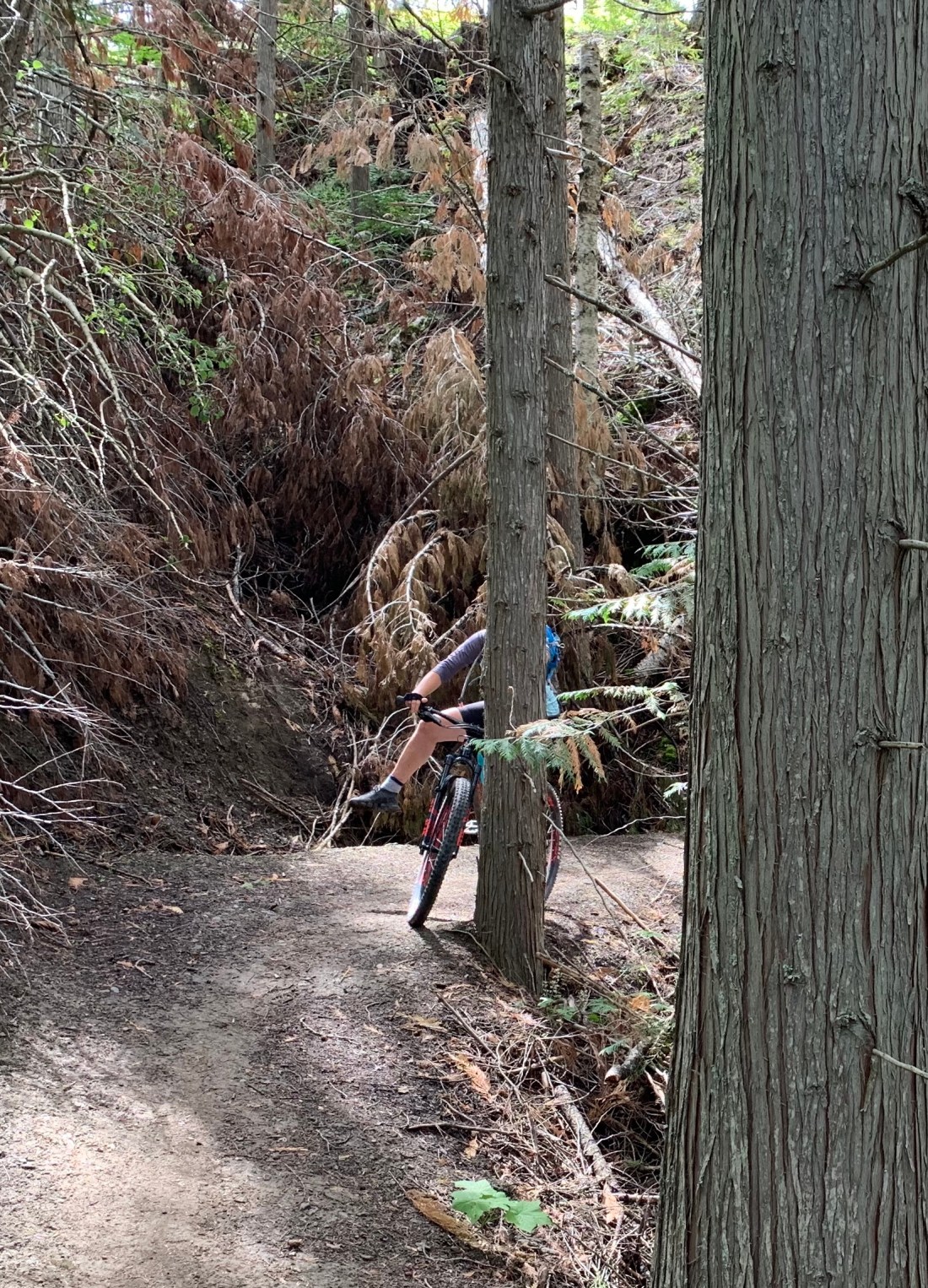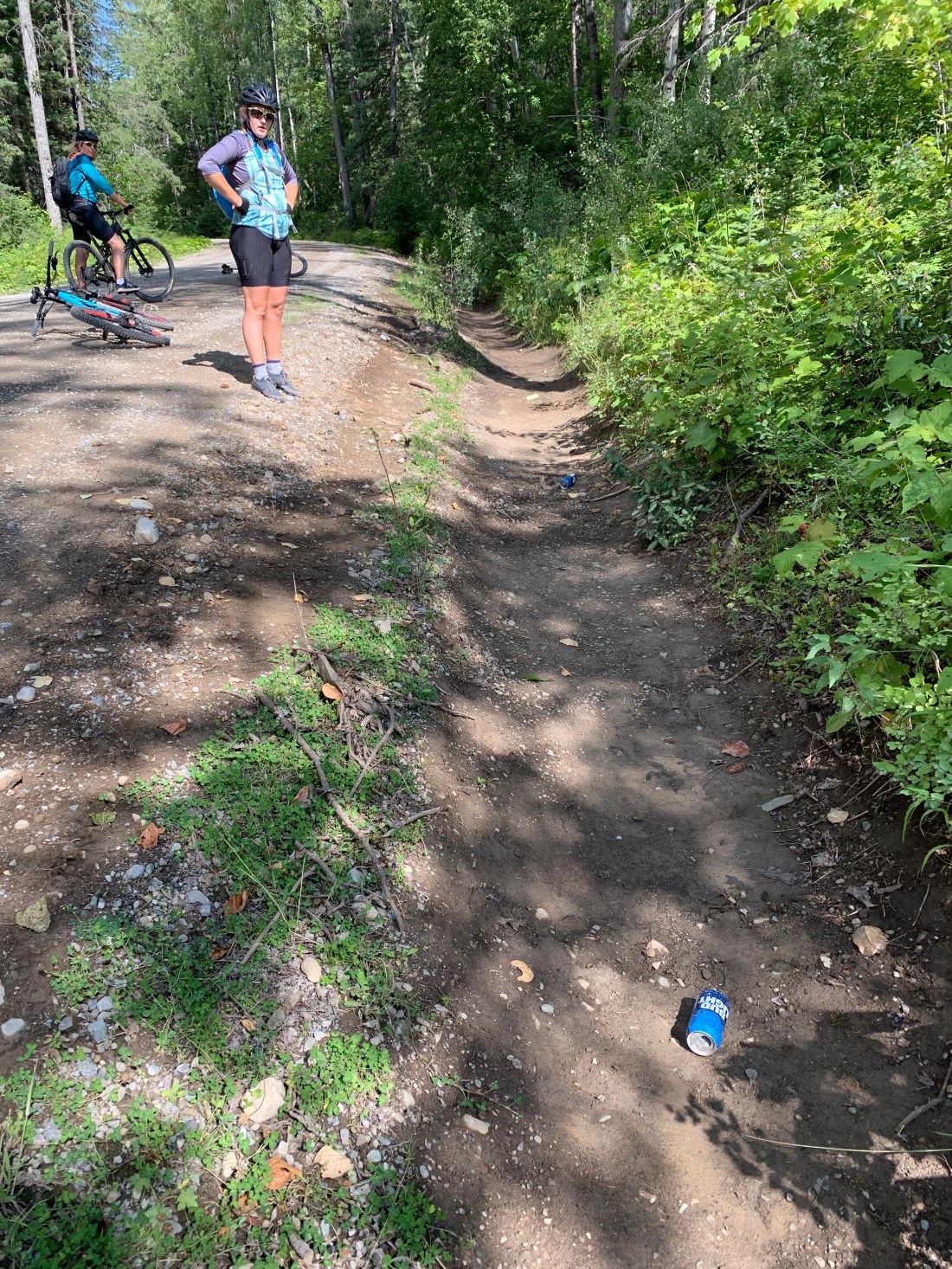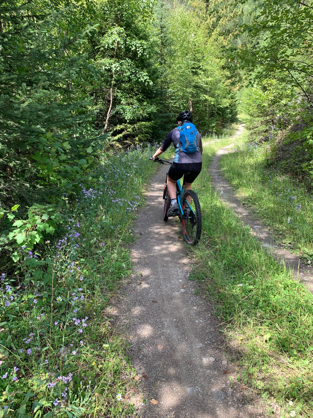 Somehow the whole ride was a lot more uppity than any of us had expected and once we turned onto the single track it got worse. Don’t get us wrong – it was lovely and we had beautiful scenery of the mountains and glacial valleys, but did it have to be so uphill? Quote of the day from Liz: “This hill is so f-ing unnecessary.” We climbed through forests and beautiful undergrowth and met a few trees (Liz) and fellow mountain bikers along the way.