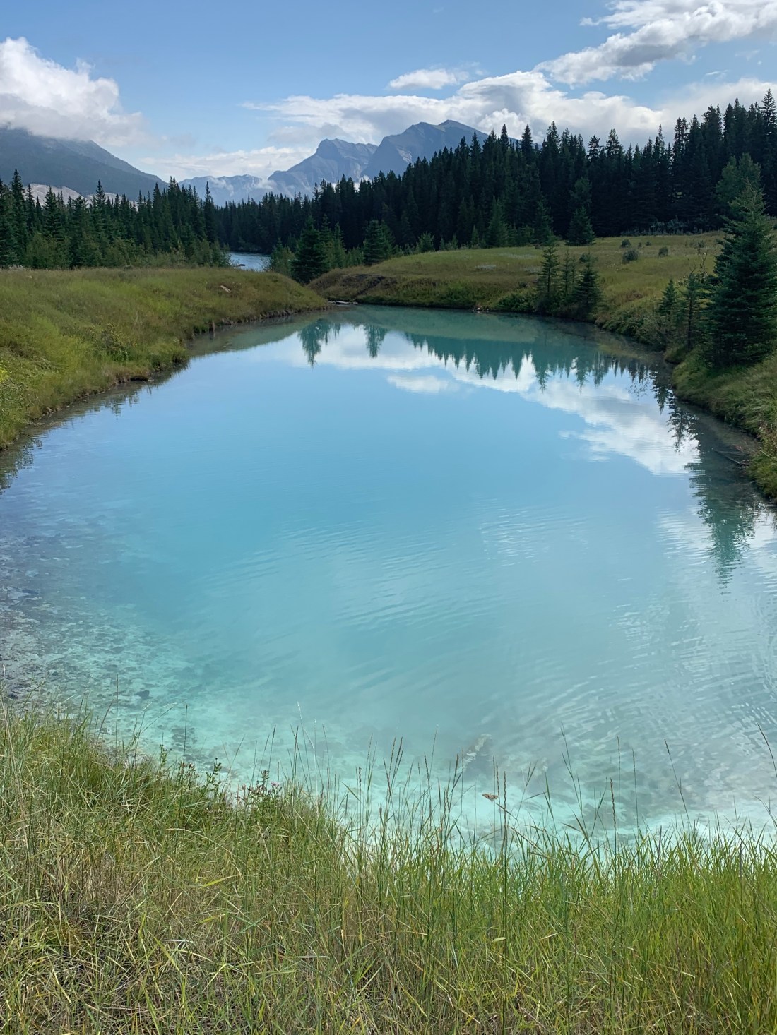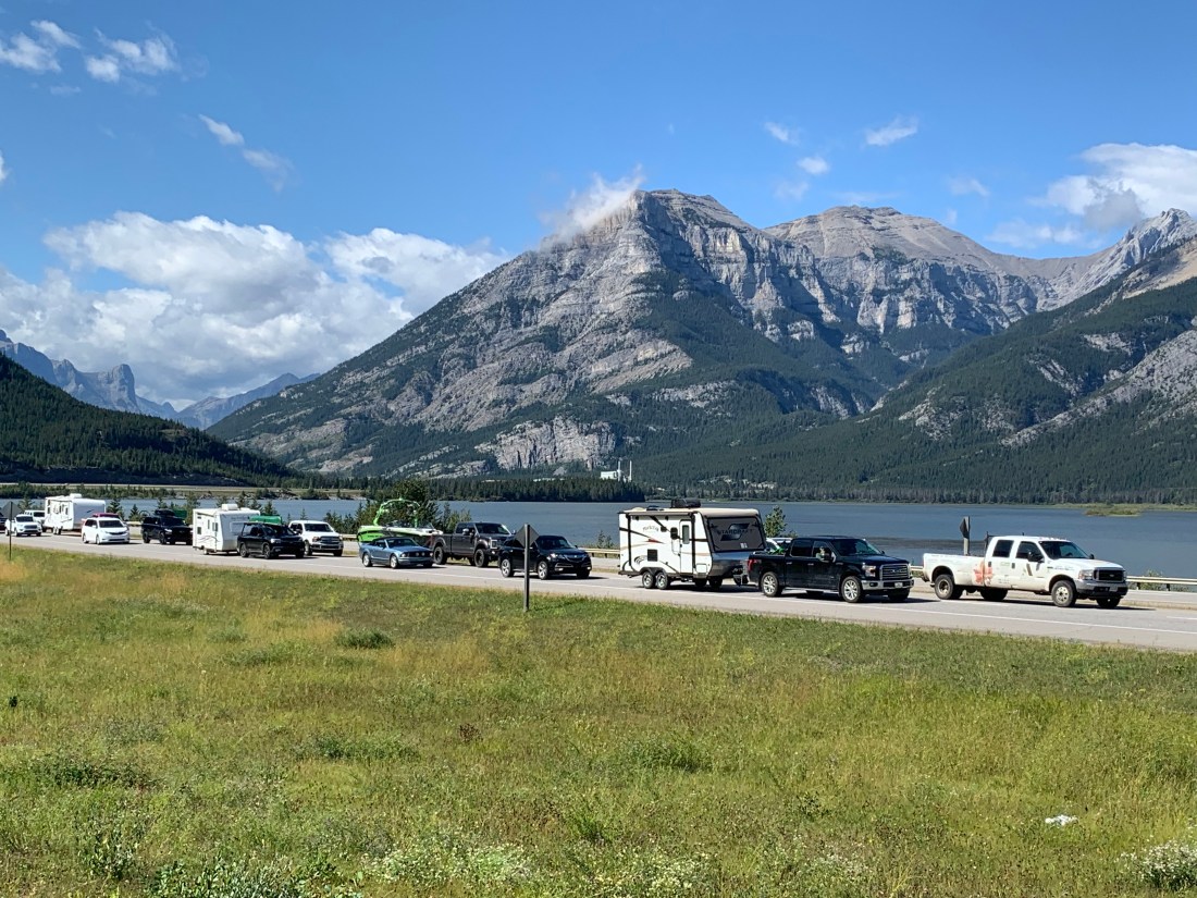 But Canmore is a delight. We stopped to dry off and warm up in the Communitea cafe (wonderful tea) before heading off on the local trails along the turquoise Bow river. We did an extra 20km out of town to make tomorrow’s effort more manageable, but 12km of that was actually on Highway 1. The only positive thing we could say was it wasn’t raining. It’s probably a busy road under normal circumstances, but with every boat, canoe and bike-laden RV (South Africans – read caravans on steroids) heading home at the end of the summer holidays, it was nasty. However, unlike in BC, here the highways are not lined with discarded beer cans. Either Albertans don’t toss them as much, or they actually clean their highways. Having seen two folks picking up litter we decided it’s a combination of the two.