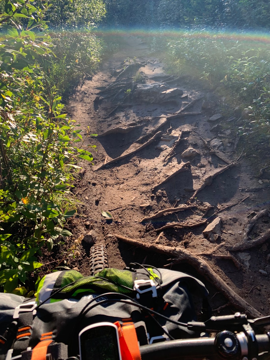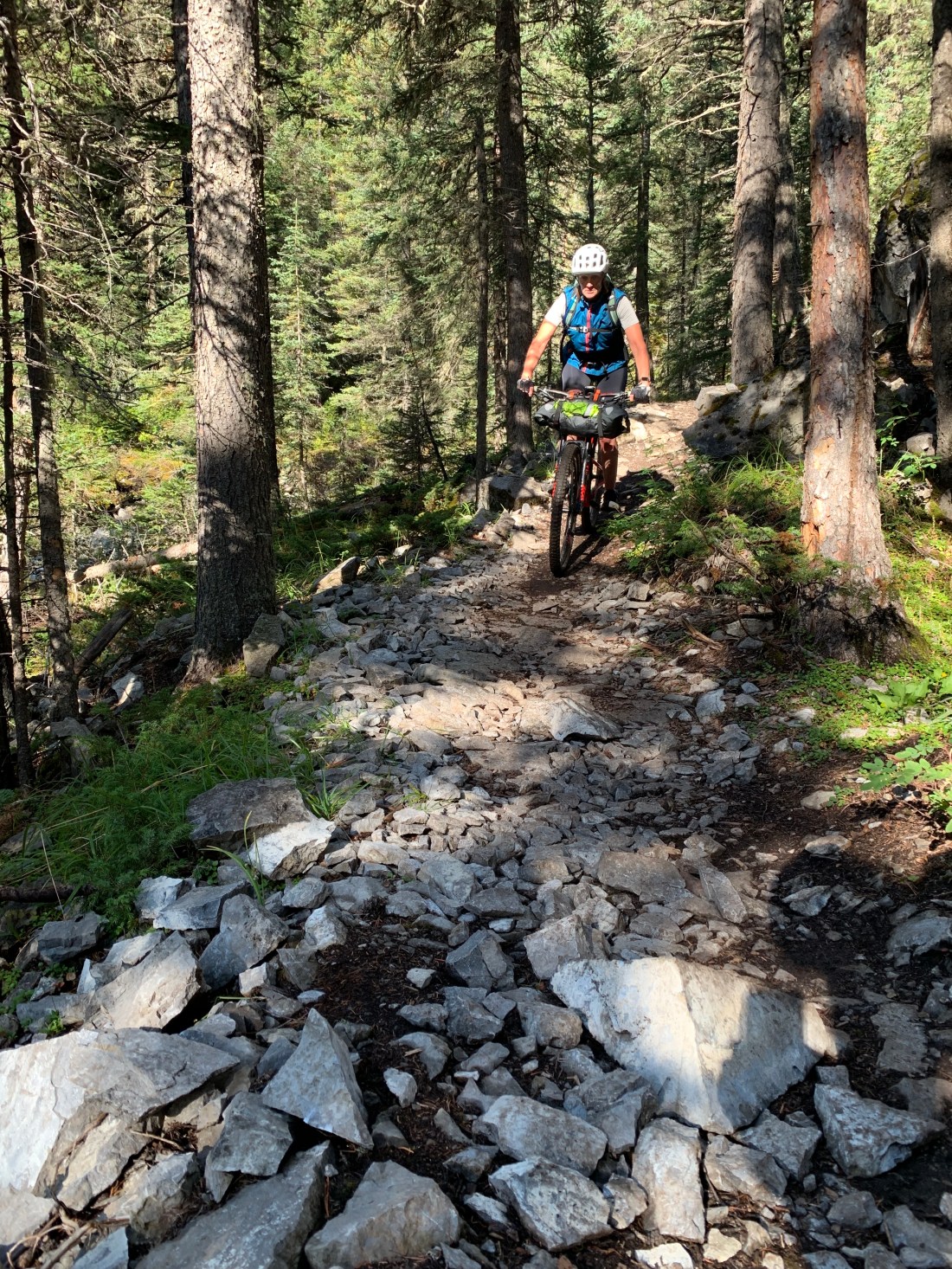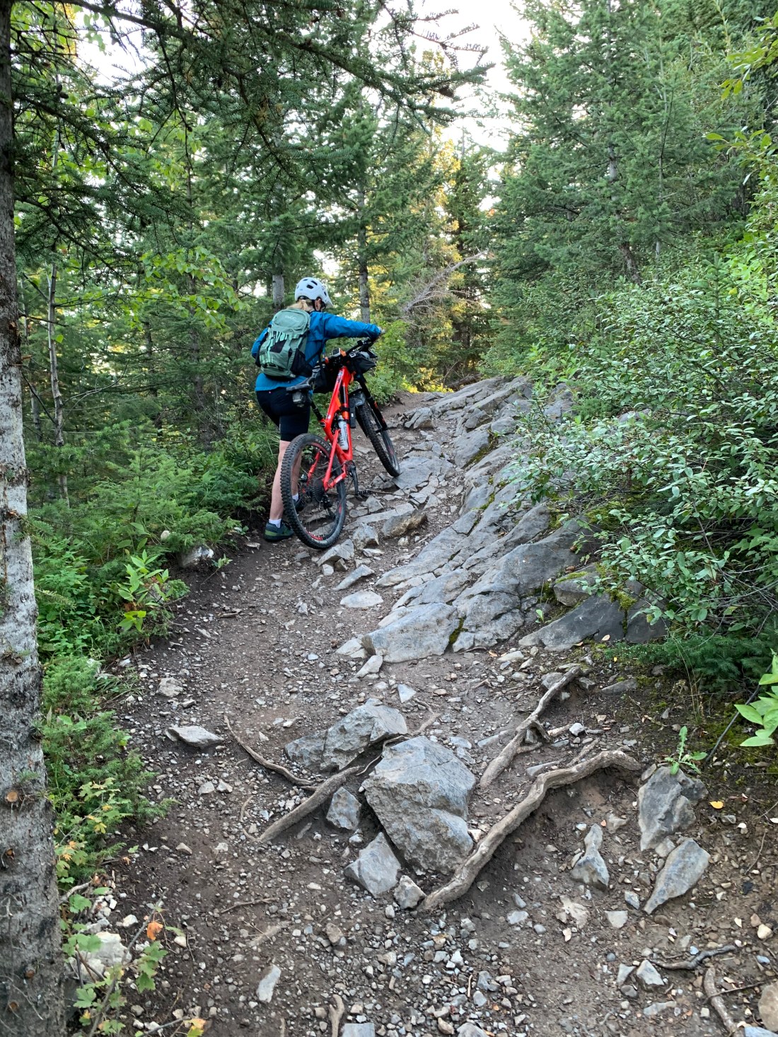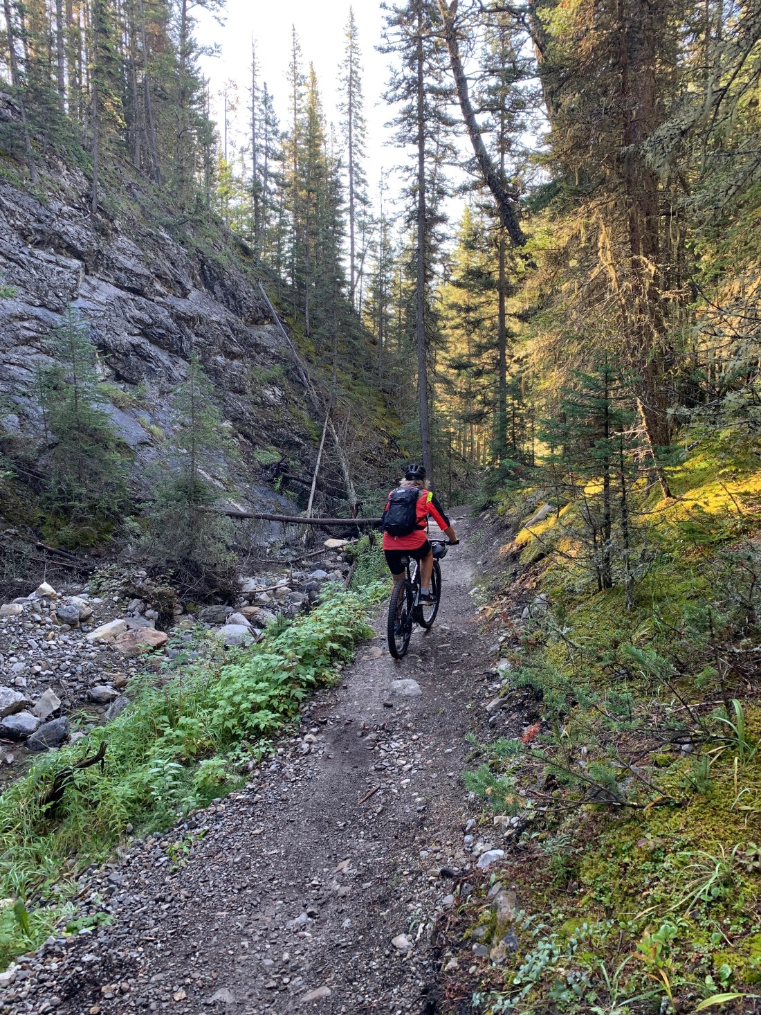 The day started out early on one of those trails that can be called tough, but fair. It was a trail, at least. It did climb relentlessly and was properly gnarly with abundant tree roots and rocks to keep us focused. After heading around Barrier lake and past the historic Colonel’s Cabin it climbed again – more dramatically this time. It felt almost vertical at times and we have seldom being so pleased to see anything as we were to turn out into the Powderface gravel road and its 7km of blissful downhill.