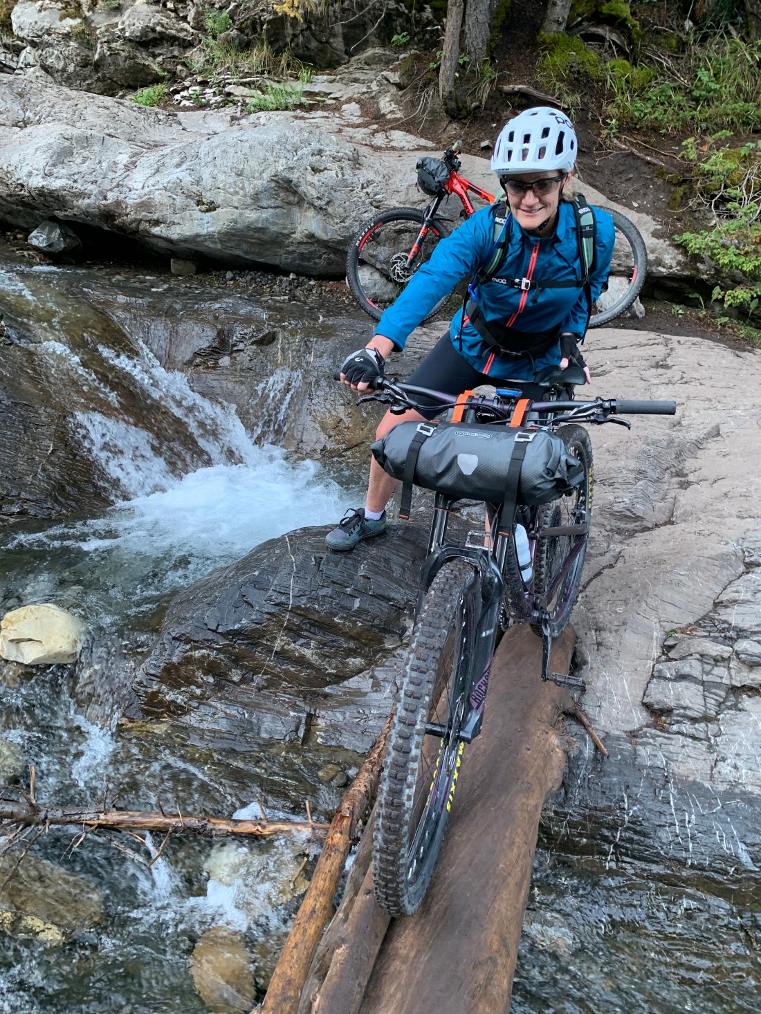 The turn back onto the trail was marked with a hiking option and a horse path for the first section. We figured the horse option was probably good for bikes. Not so much. The river crossing gave us our only hilarity – we thought tossing our shoes over and wading across barefoot was a clever idea. Or not. First Gill’s second shoe landed short with a splash and she had to run in with her bike to prevent it floating downstream. Bron’s second throw could only be described as comically pathetic. Straight up in the air the shoe soared, only to plop down in the middle of the stream and sail merrily away. As Bron was contemplating 35km of biking on spiked pedals barefoot, Gill managed to rescue it some 40m downstream.
