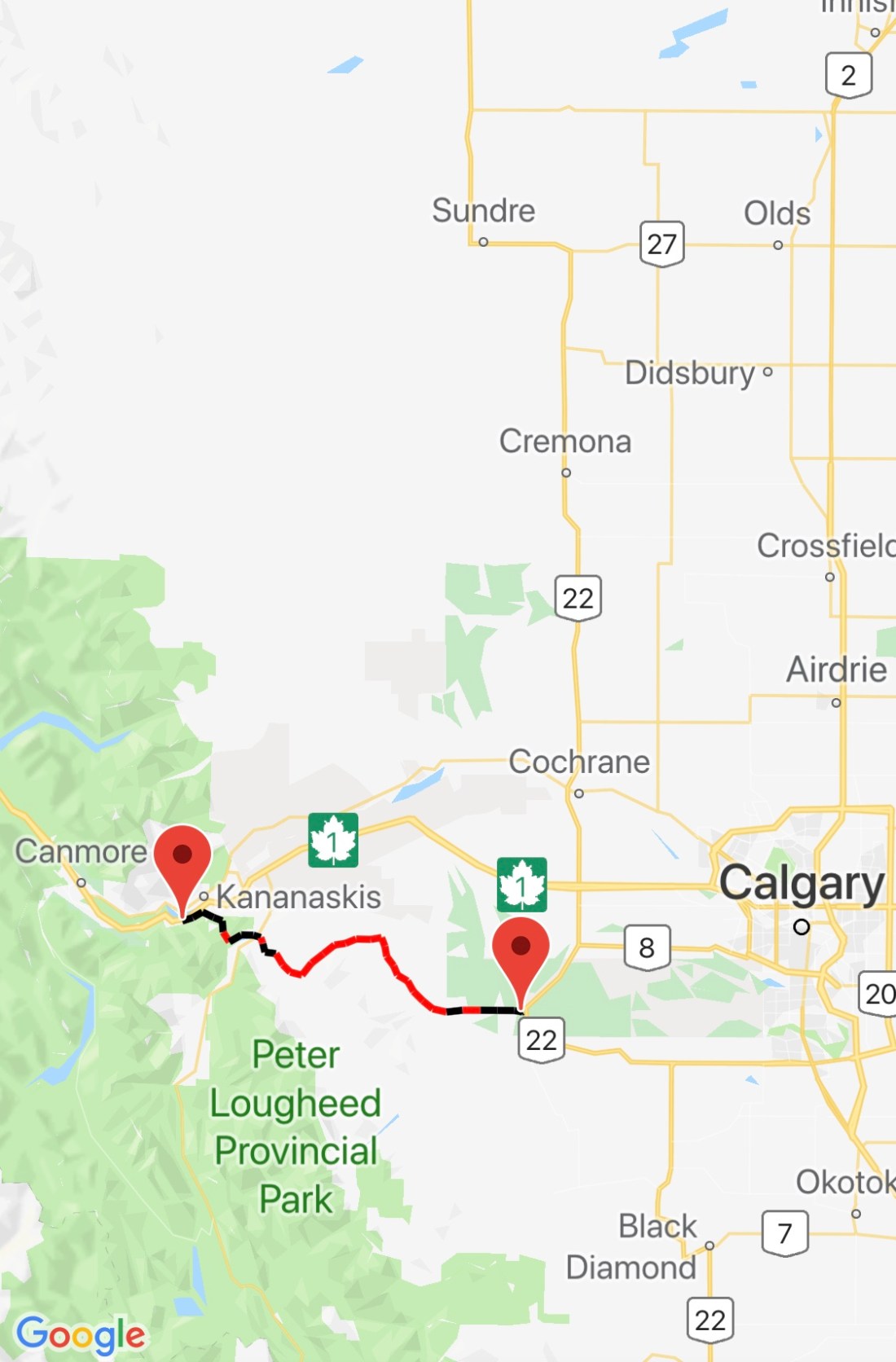 After a few kilometres it became obvious this trail would be nasty. Then when we turned onto the Moose Loop, which the Great Trail app and website said we should do, our hell started. We lost the trail so many times our GPS looked like toddler drawings. Our legs and arms were opened up from encounters with branches and rocks (and those spiked pedals) and we got more furious and more concerned that at our pace we wouldn’t make it out before dark. We almost didn’t. Only the well mapped last three kilometres before the Bragg Creek trails parking saved us with a shortcut, and we sped the last 10km on the road through beautiful farmlands to soak our aching bodies and shattered minds in the Powderhorn Saloon in town.
