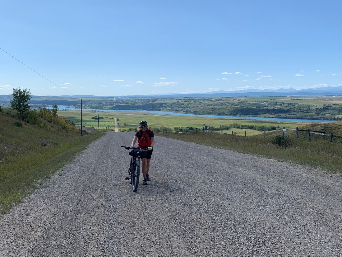 Outside and above Cochrane (a steep climb for us), the Gleneagles golf course and estate clings to the hillsides and our trail wound through creatively engineered golf holes, always with the river in sight below. It was here that we turned east, and thus turned our backs on the Rocky Mountains. For the first time in almost 2,000km, the mountains were finally behind us. We have now crossed eight mountain ranges and it feels like enough, so it was a fond farewell to craggy peaks.