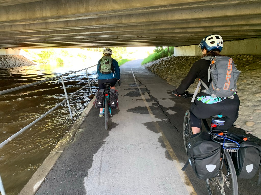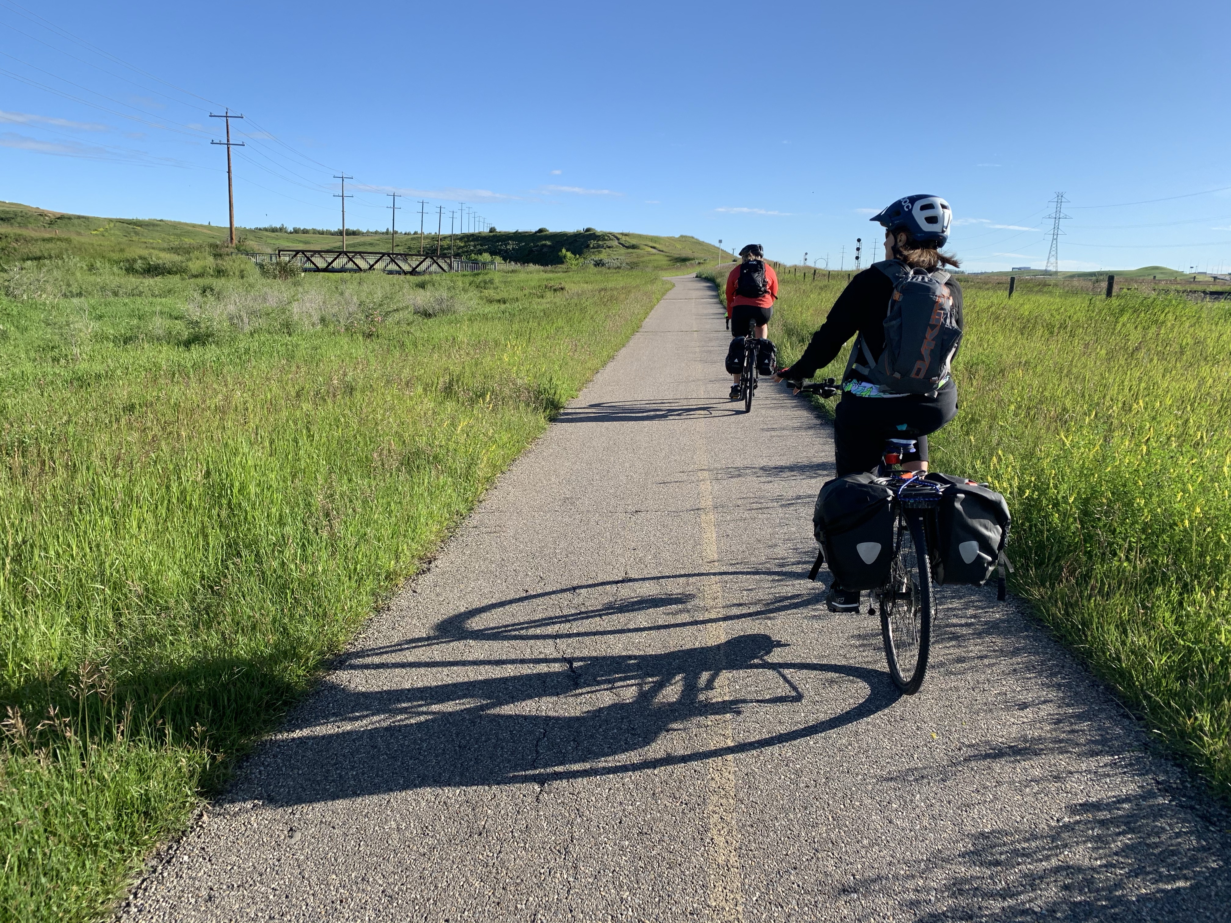We started out buzzing down from Jen and Mike’s home to the flooding Nose Creek, which we followed out near the Deerfoot Trail (they name highways “Trails” here) past the quiet Calgary international airport to Airdrie, something of a bedroom town for Calgary. Here you can still make out the city skyscrapers over the hills as you ride through the town’s beautiful parklands and paved trails cross-crossing the creek to its source.
