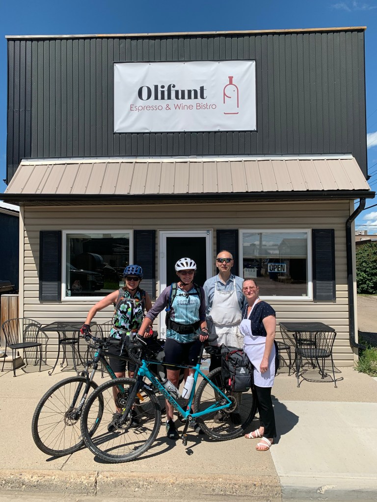 But our day came to life at our lunch spot in Olifunt, a cafe in the lovely town of Carstairs. Here the food is excellent, made for you by the jovial hosts Brian and Darlene Banfield who have owned the joint since November. Their other guests were equally welcoming and a fellow cyclist shared a better route for us to take on to Olds, thus avoiding the 2A. This also took us through Didsbury, where pets of Fargo and Dances With Wolves were filled. Today’s trail trivia for you.