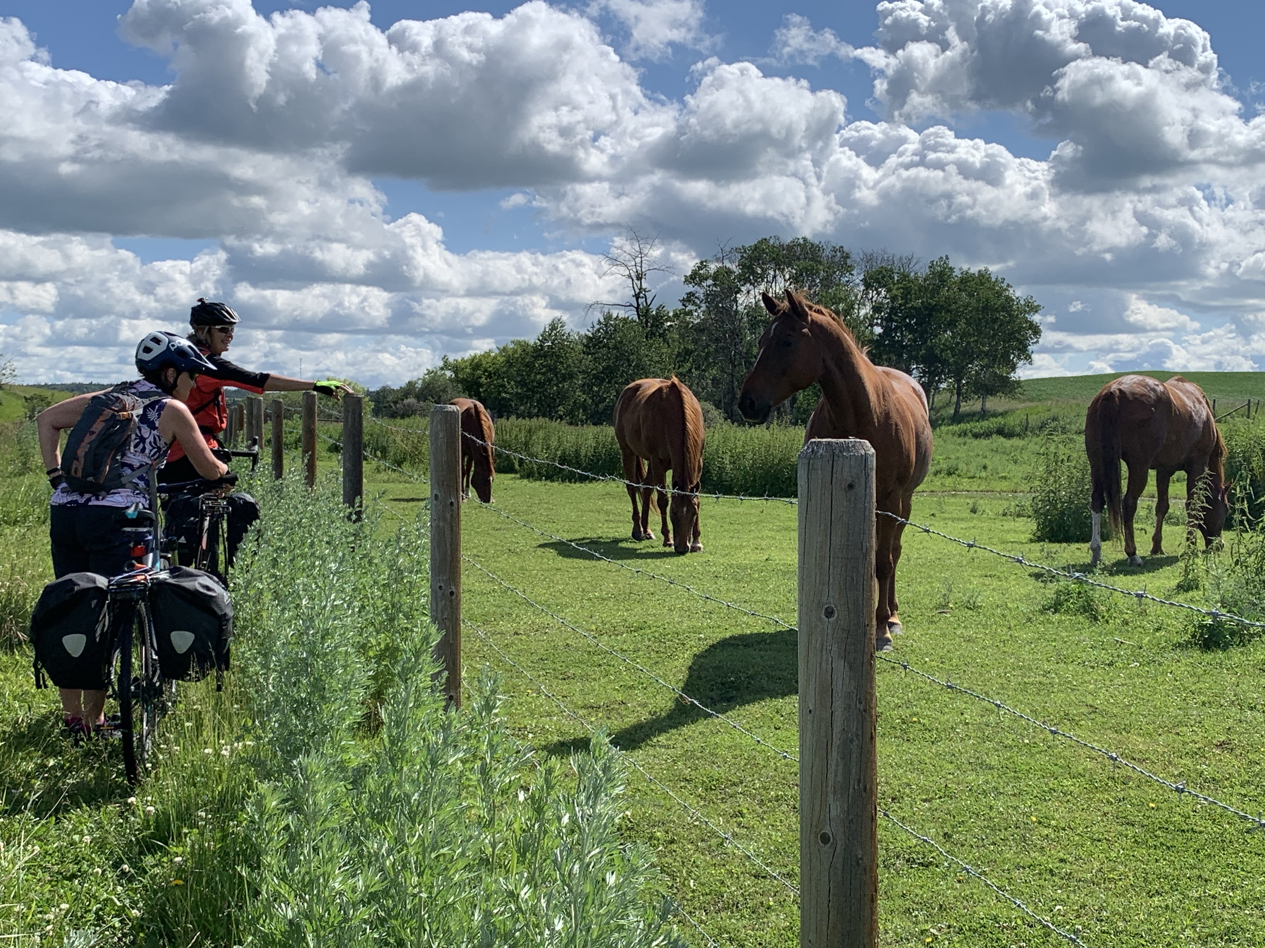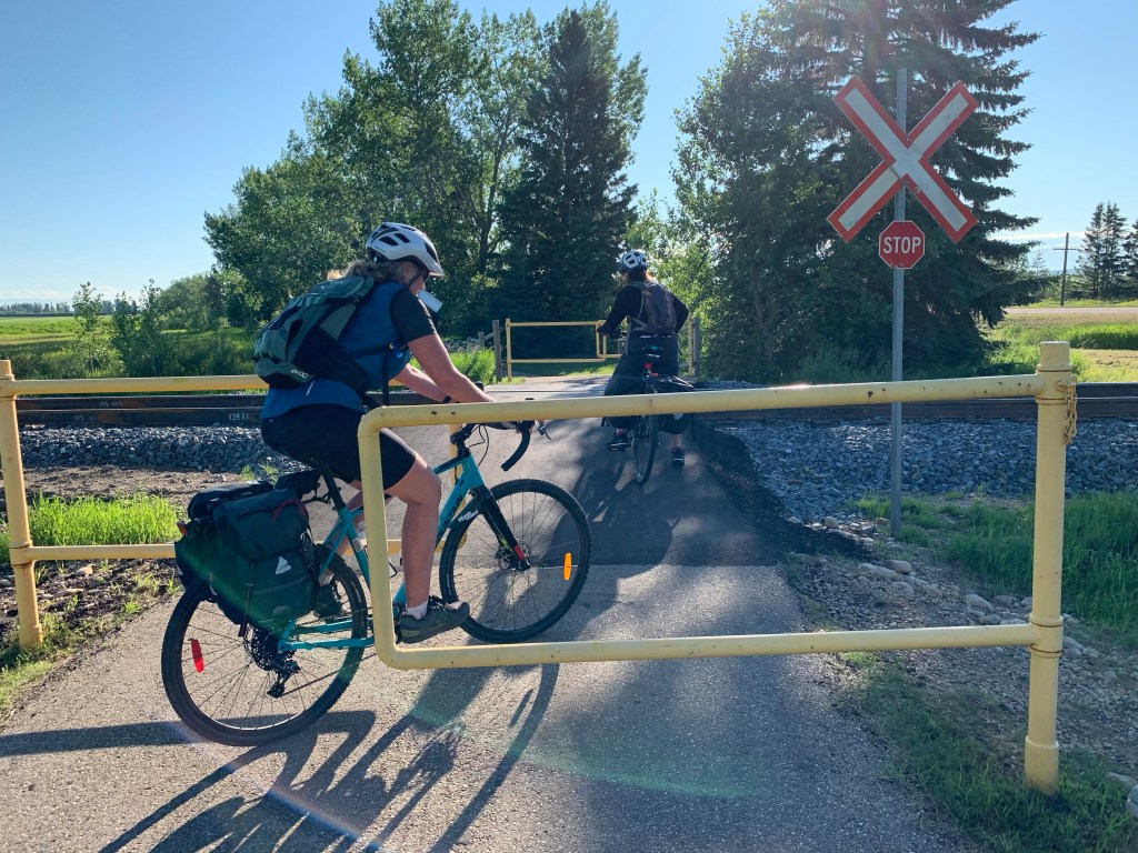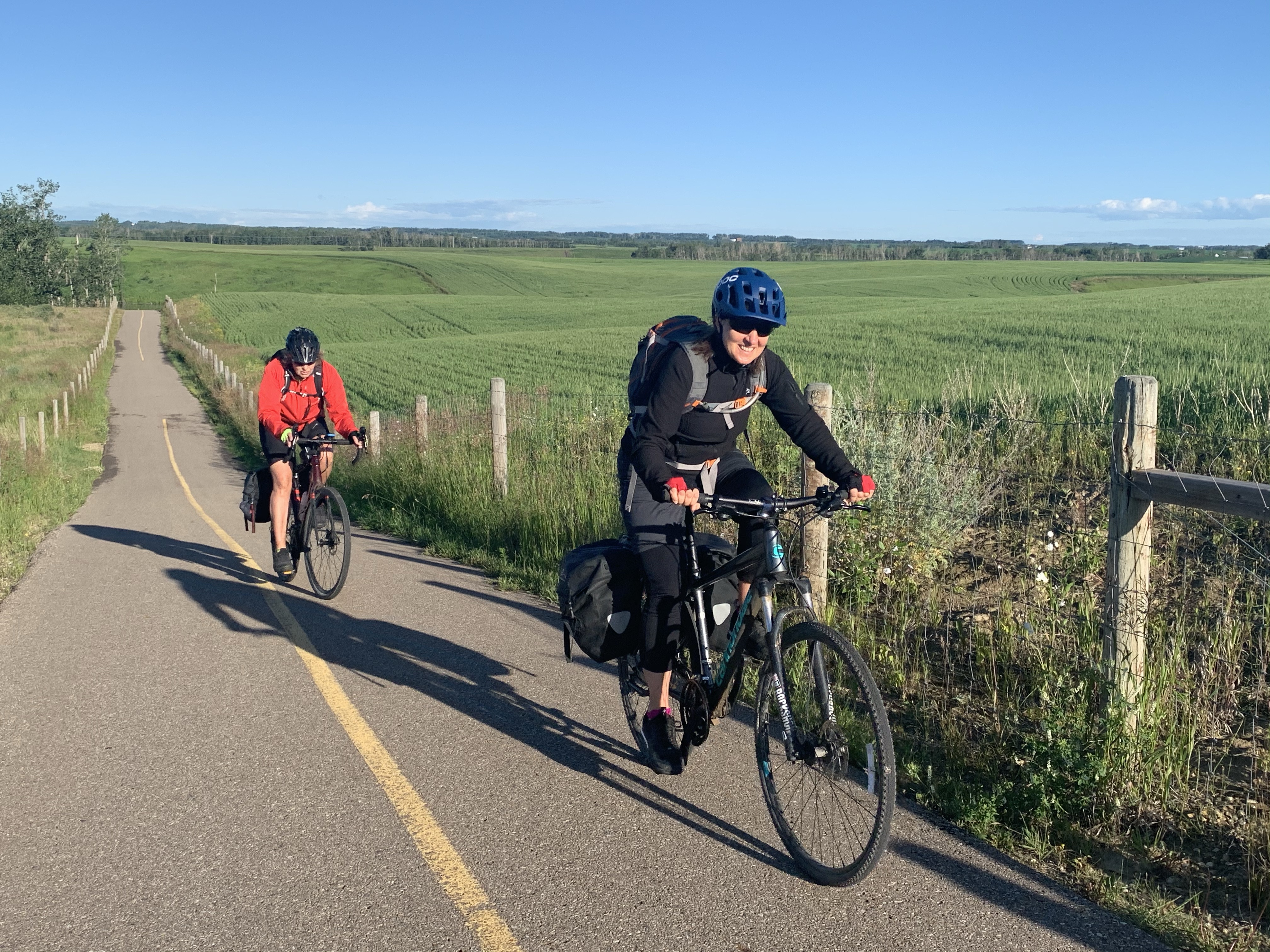 As has been the pattern, the morning was exquisite. Low, gold light across our shoulders as we rode through the empty streets of Red Deer and Blackfalds, and on through Lacombe County. The last of these treated us particularly well with a lovely trail that kept us off that pesky Highway 2A and wound through wheatfields, lakes and gorgeous horse farms (headwinds notwithstanding).