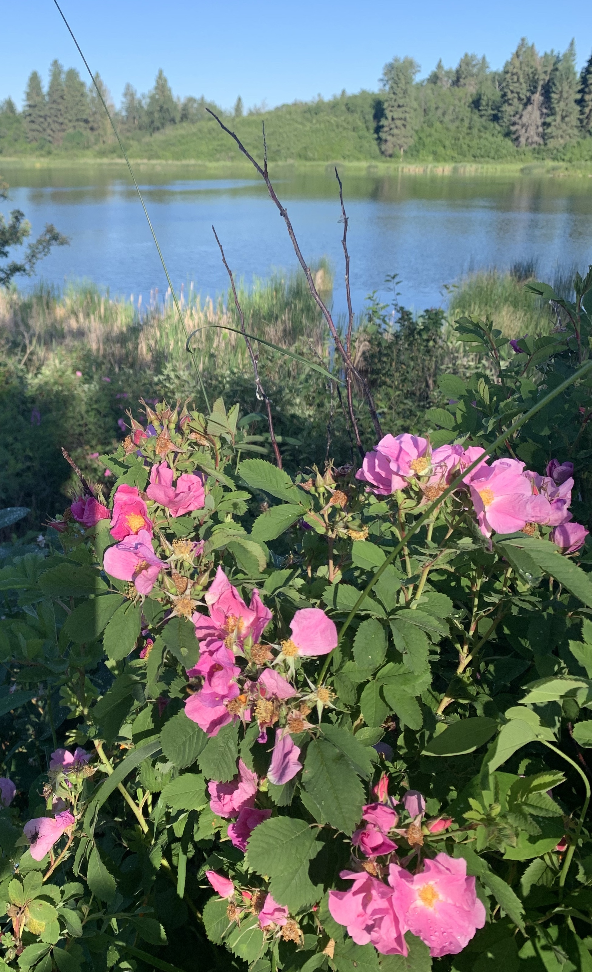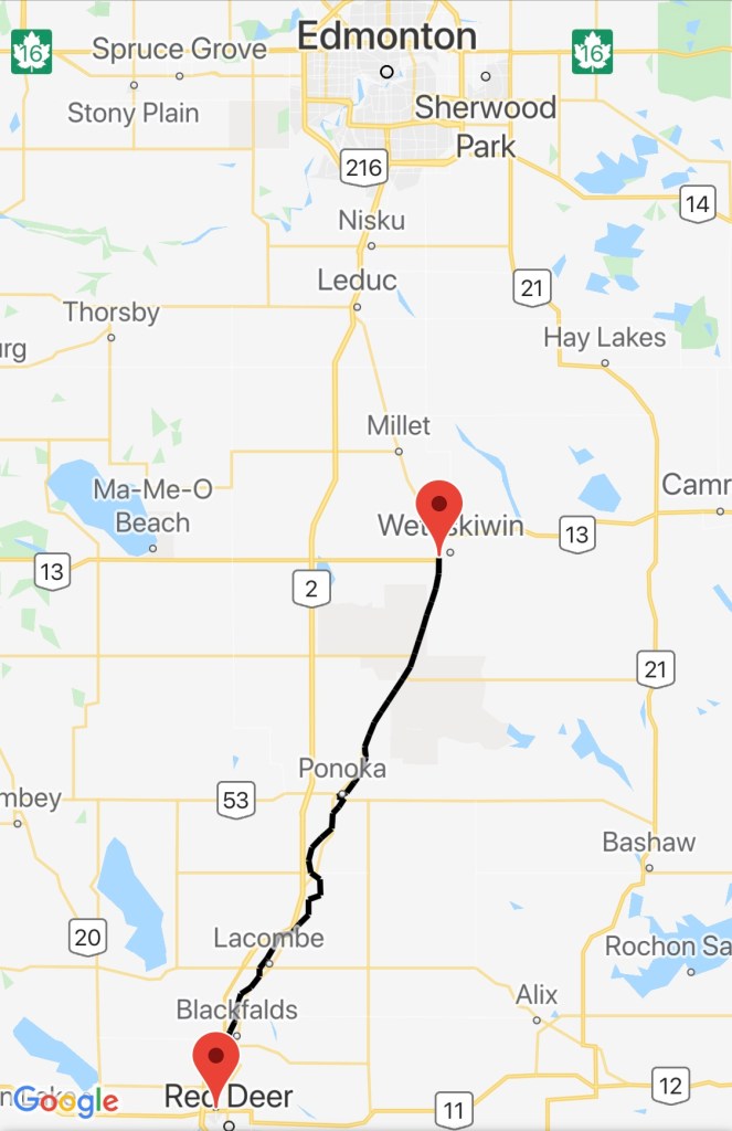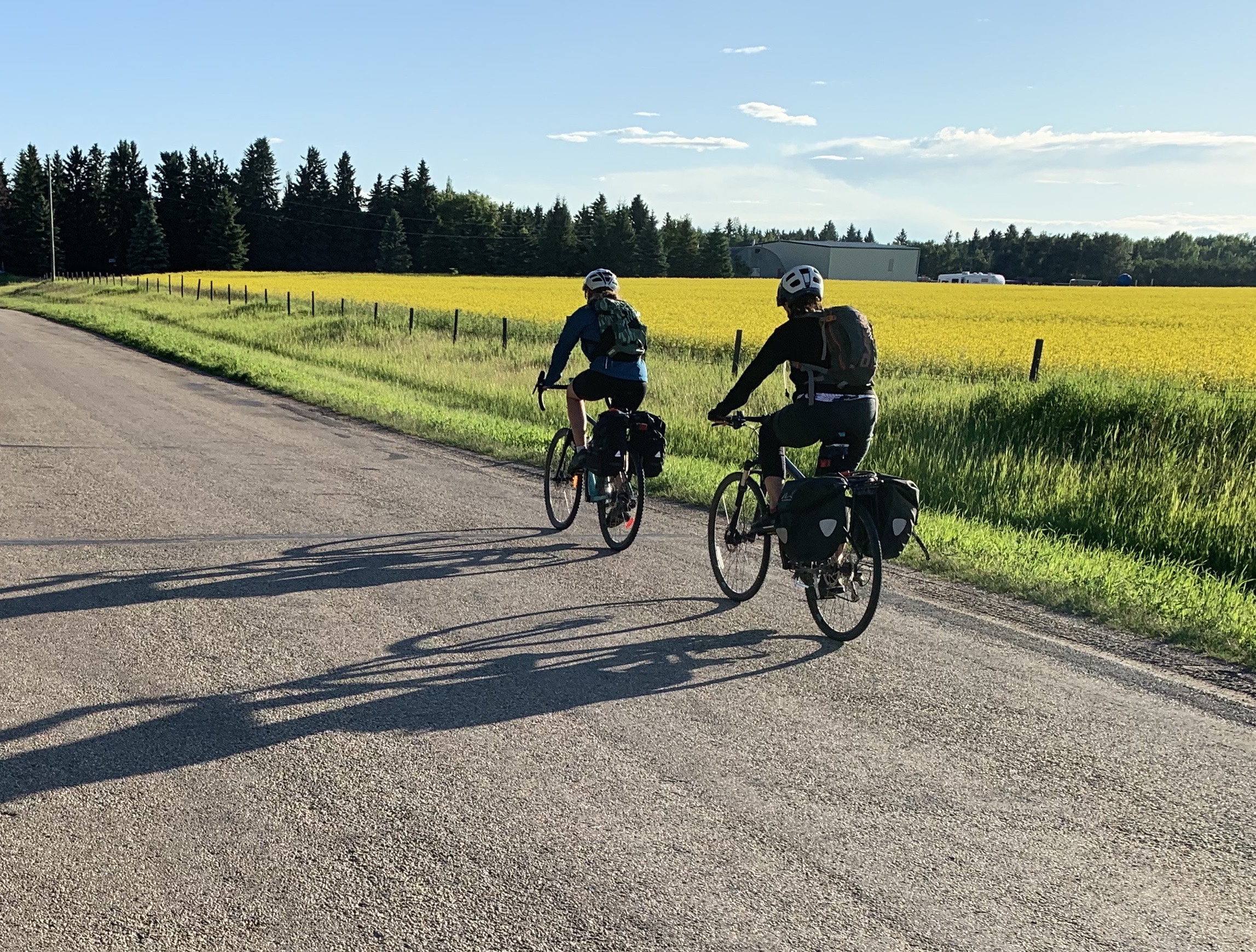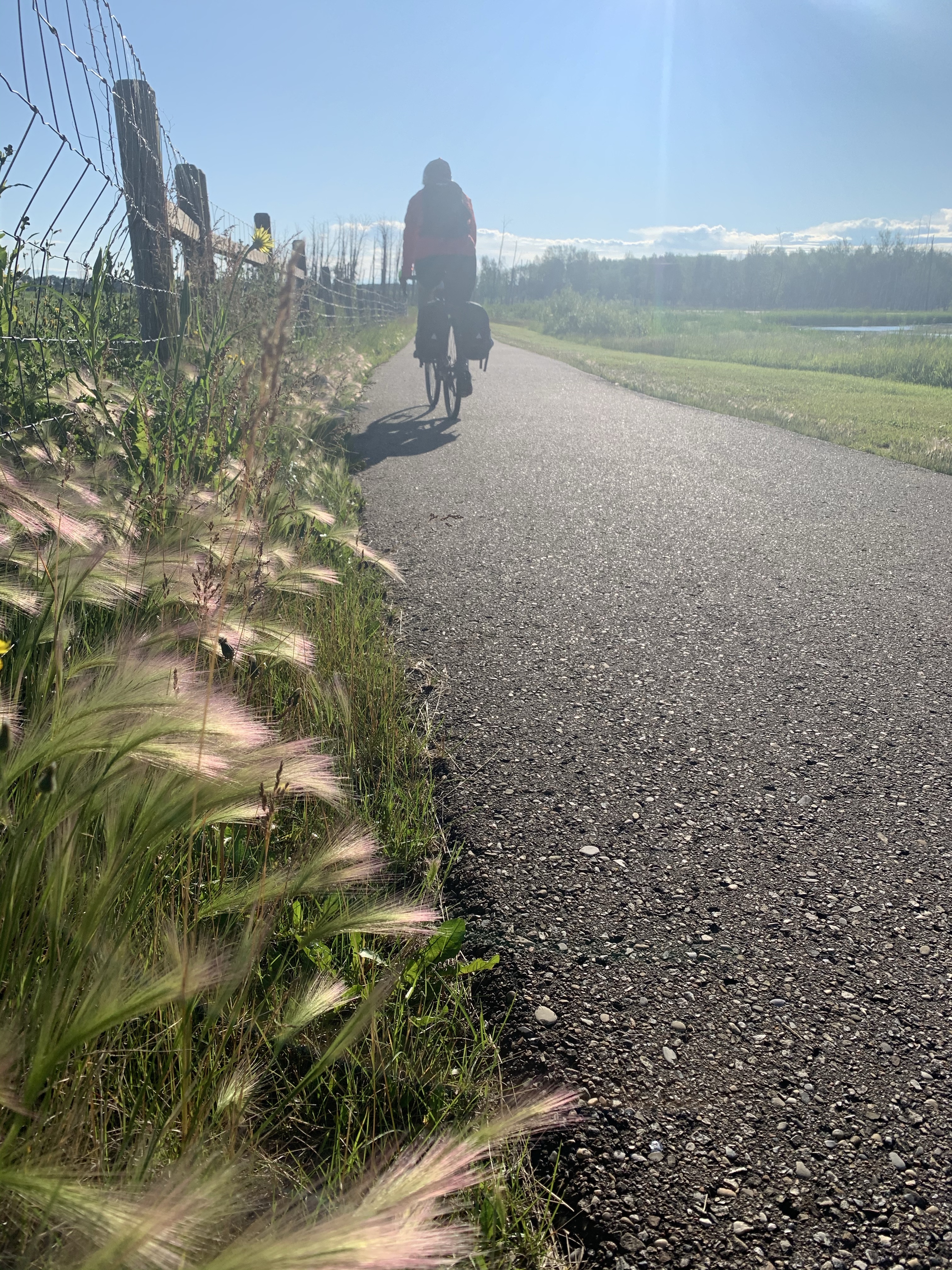 As has been the pattern, the morning was exquisite. Low, gold light across our shoulders as we rode through the empty streets of Red Deer and Blackfalds, and on through Lacombe County. The last of these treated us particularly well with a lovely trail that kept us off that pesky Highway 2A and wound through wheatfields, lakes and gorgeous horse farms (headwinds notwithstanding).
