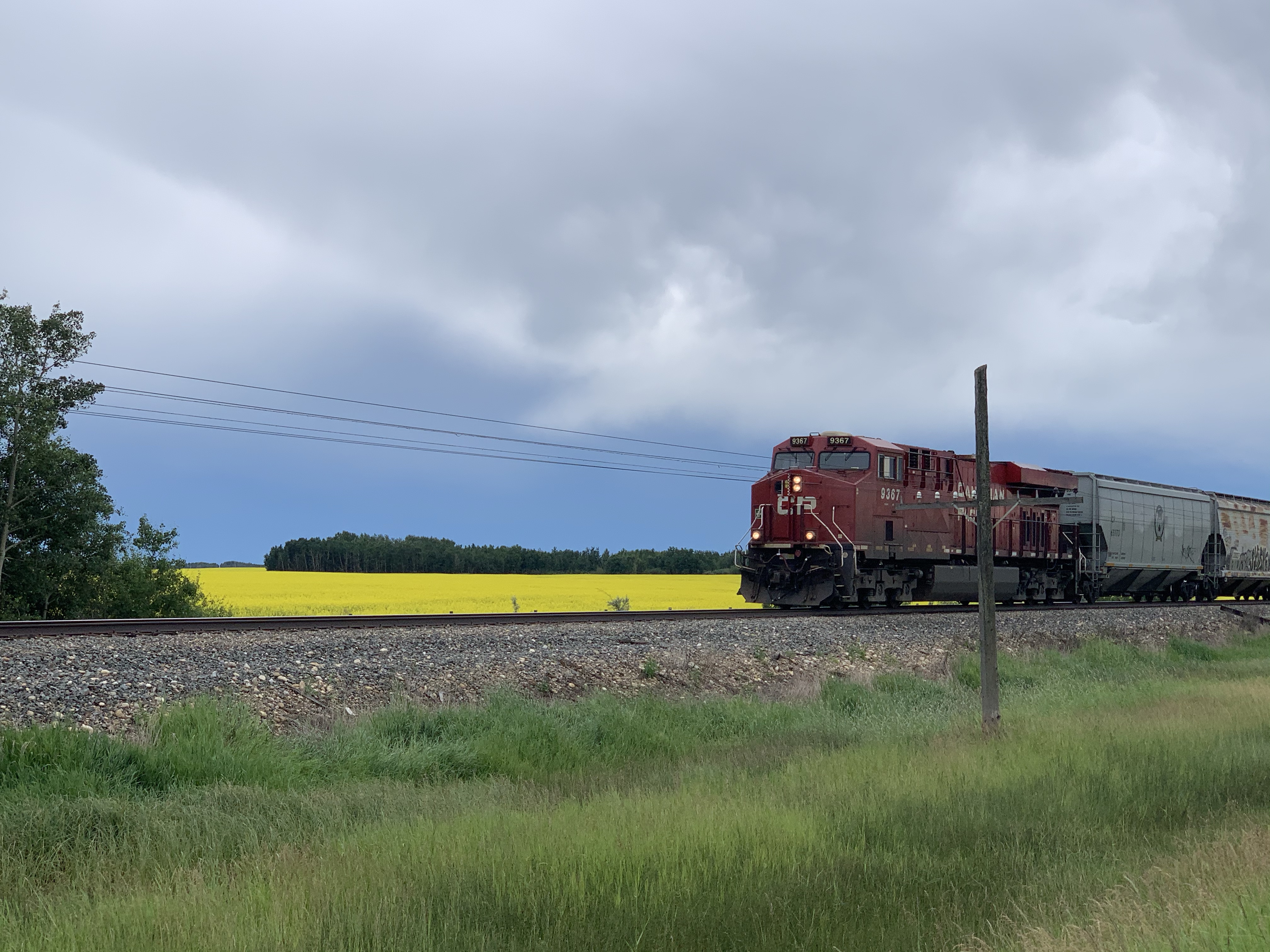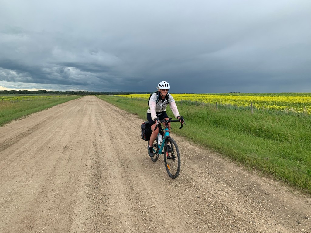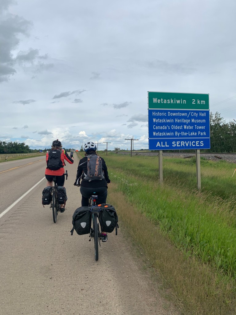 Other weird facts from today: we rode along a piece of blue string outside Wetaskiwin that answered the age-old question of how long it is (more than 4km) and we could actually out-cycle a thunderstorm.
