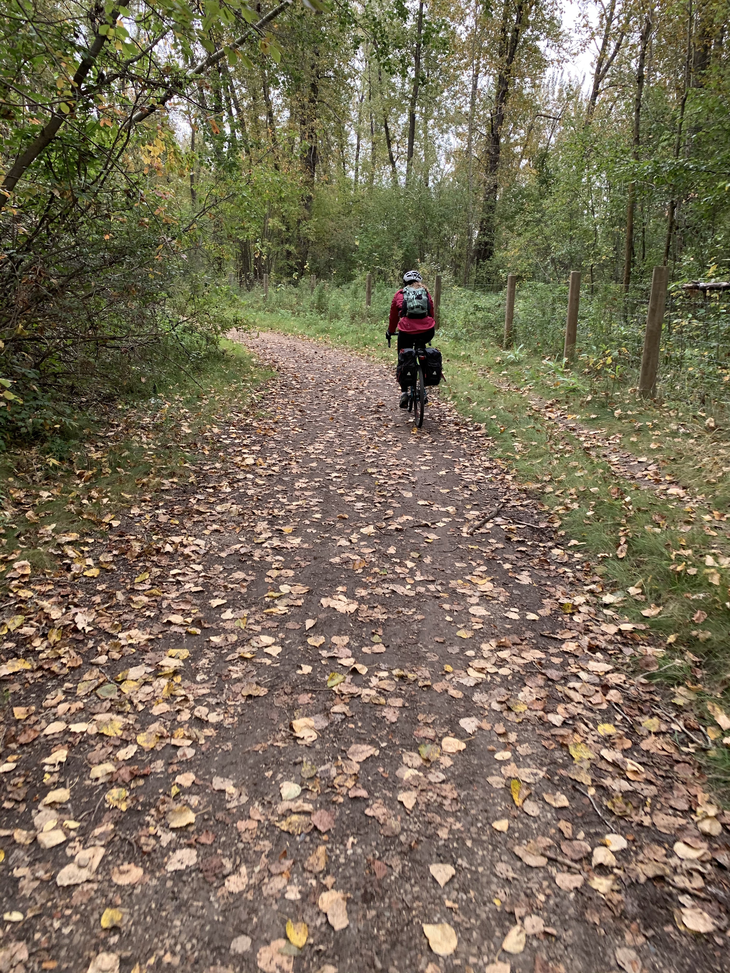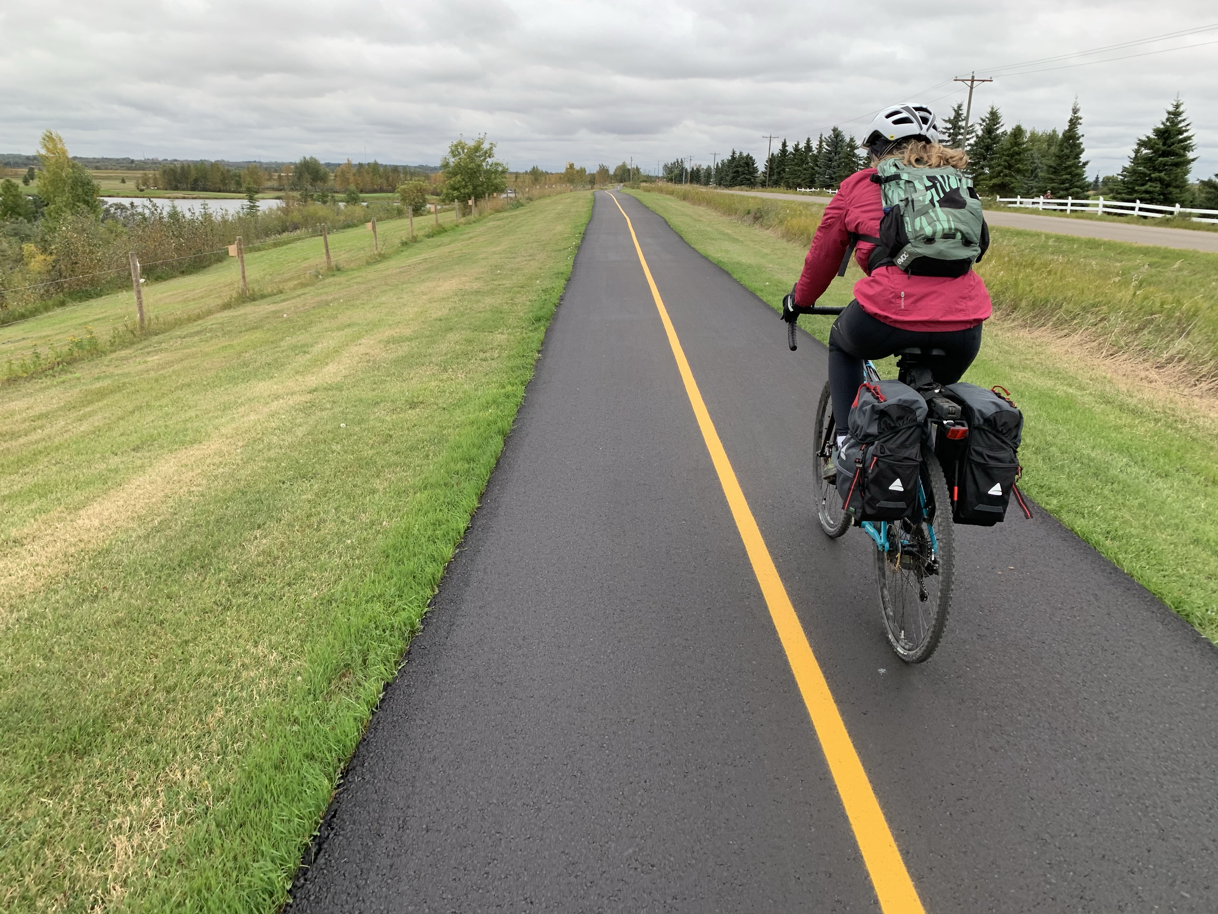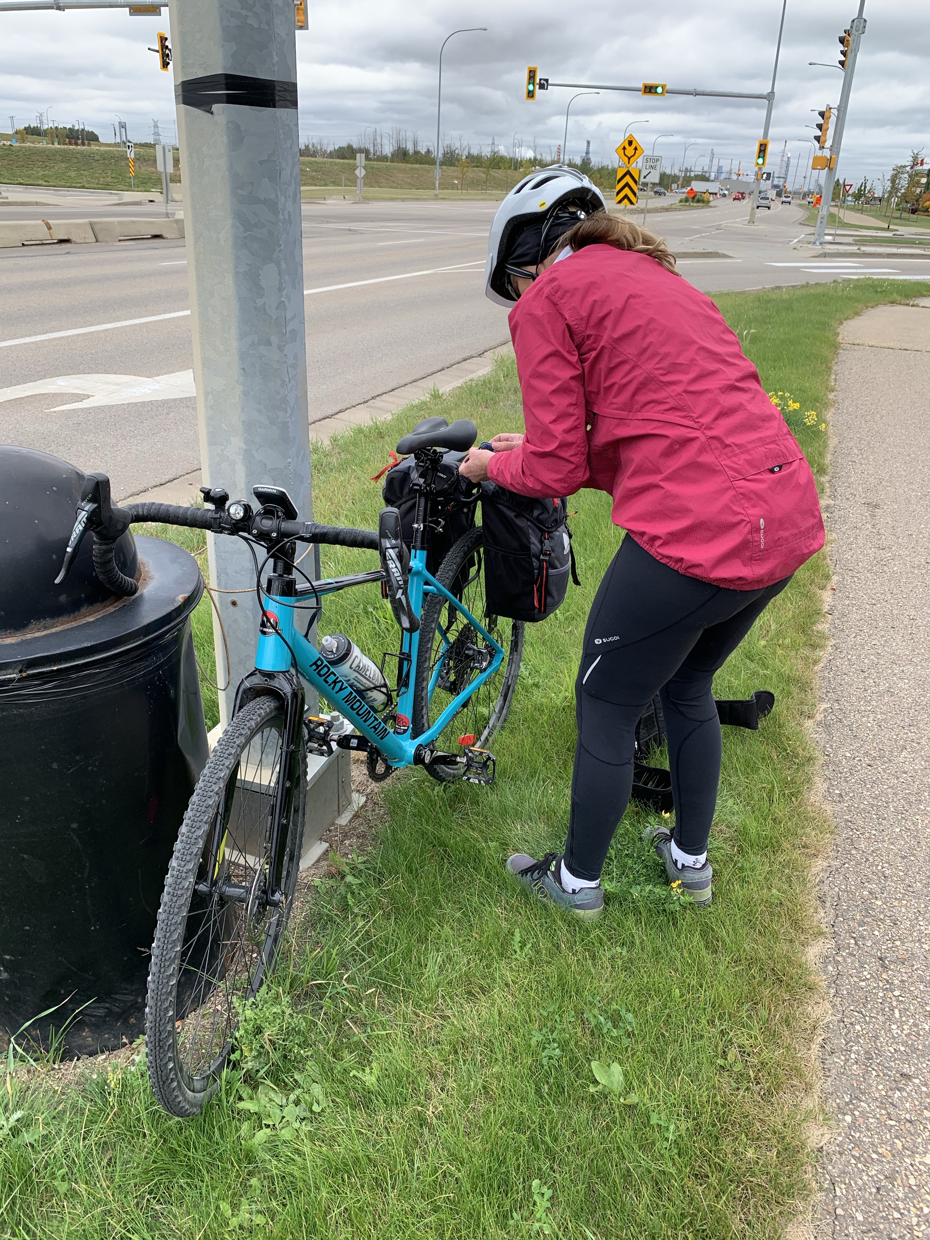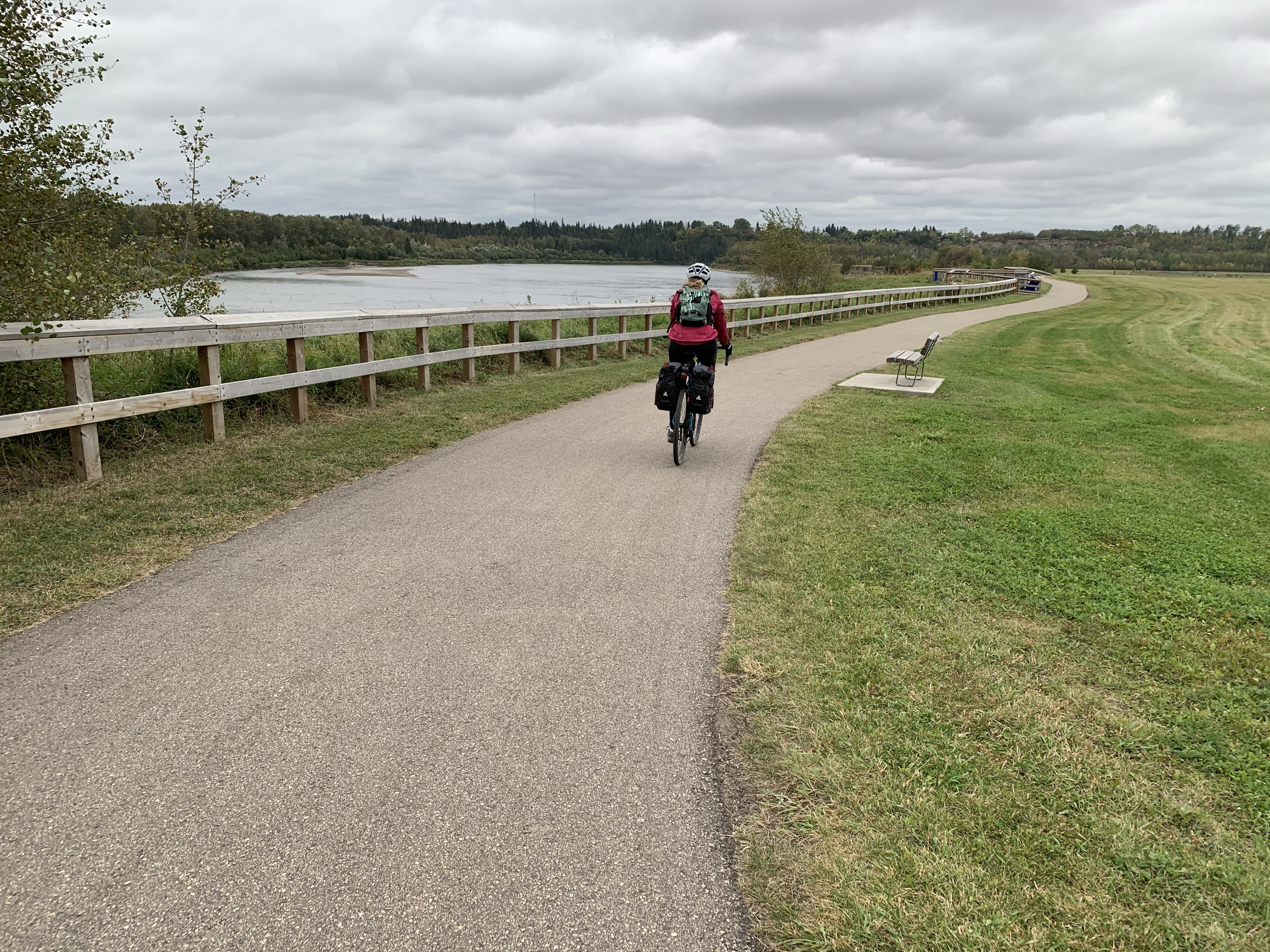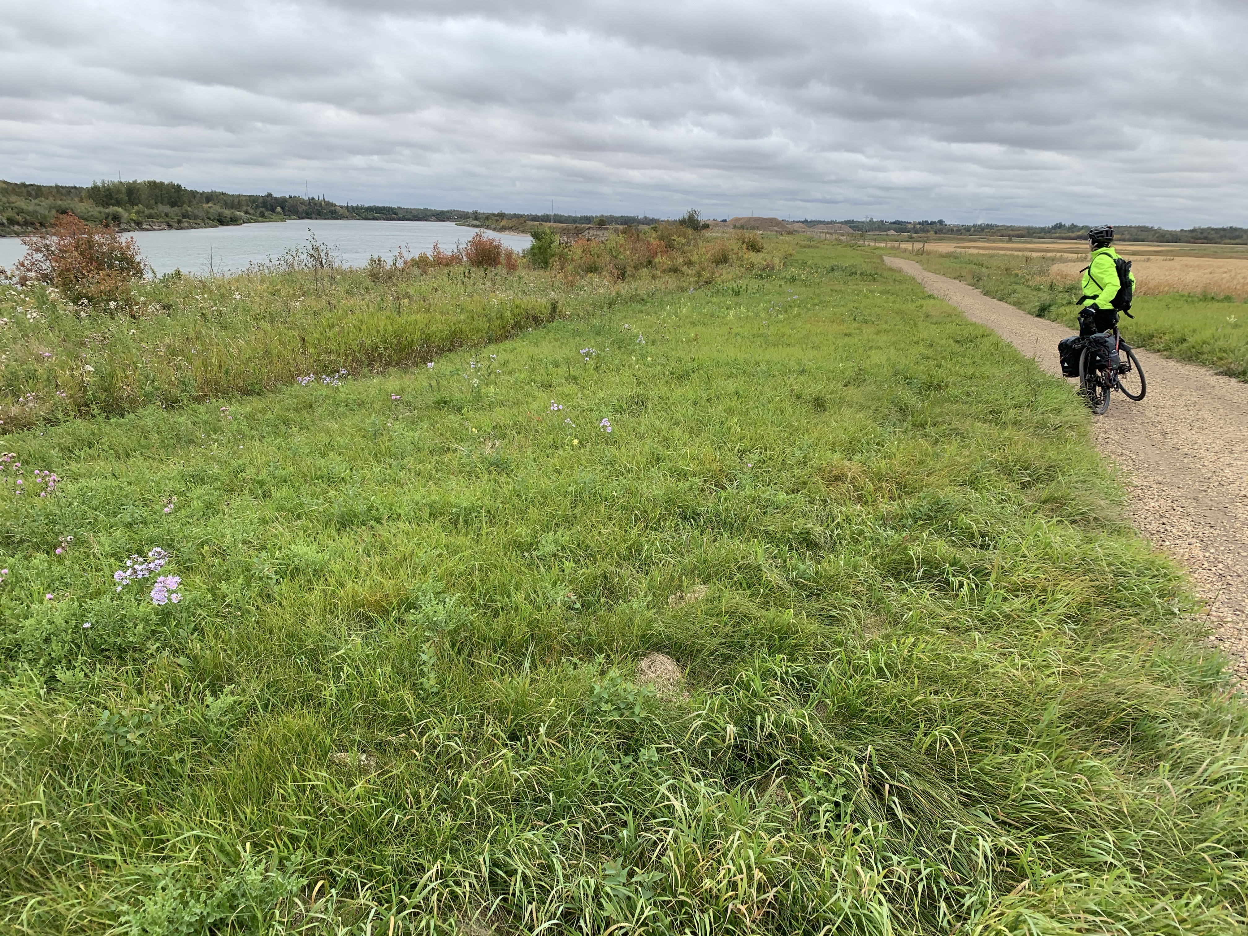 Our first mishap occurred not even a Covid-19 social distance from the hotel door when Bron’s fancy seatpost came loose and she ended up riding the thankfully short day at a bizarre angle. Once out of the industrial outskirts of Edmonton a perfectly paved trail took us along the North Saskatchewan River through wheat fields and into the lovely rolling Strathcona park which hugs the river banks for several kilometres into suburban Fort Saskatchewan.