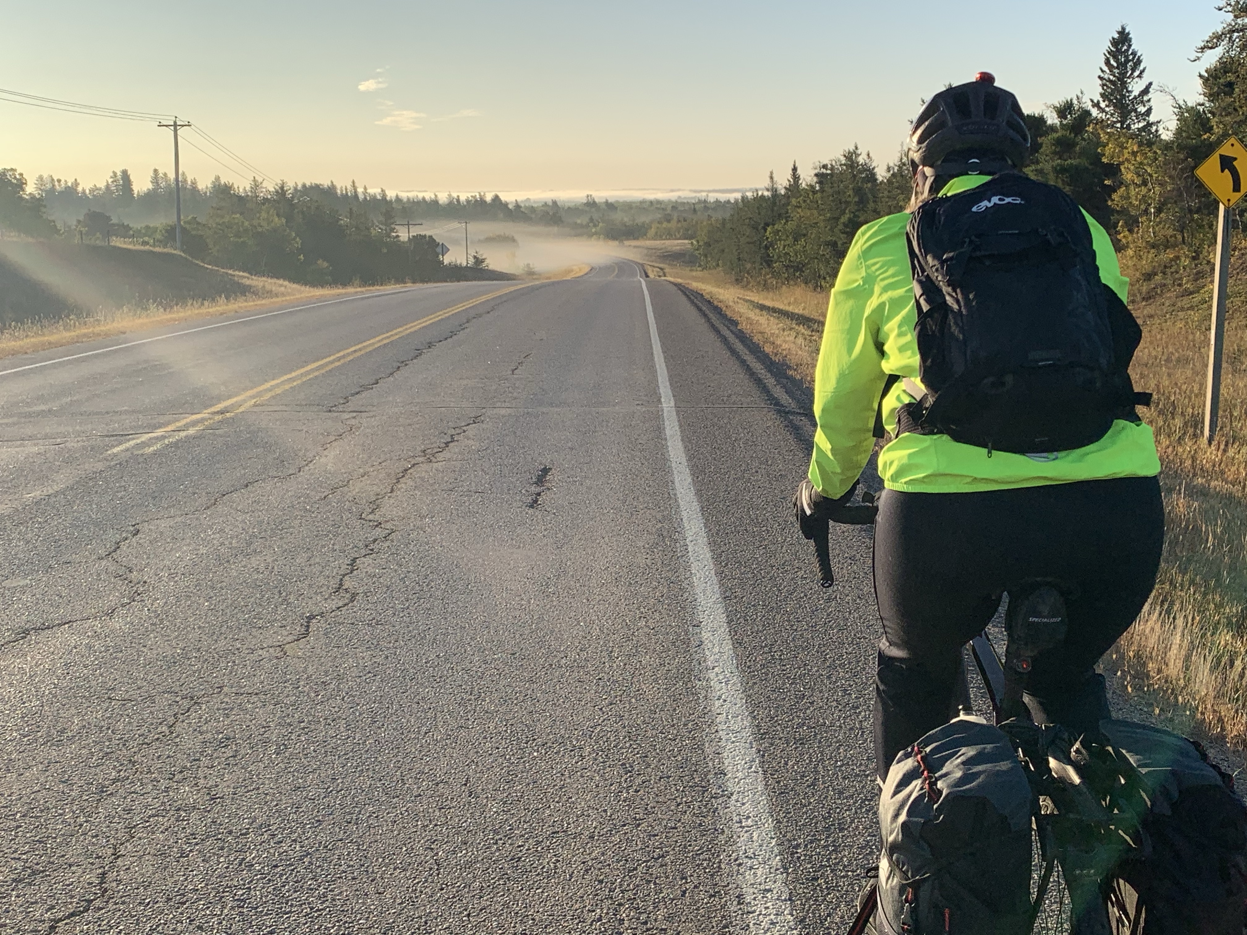 The morning was just exquisite out of Elk Point into wisps of mist in the valleys, sun above. Although we had lots of climbing to do, the hills were, in Gill’s words, more “honest” today. Generally ups came with downs and there were only a few long, relentless climbs. The wind also played its part – although in our faces, it was fairly gentle. And the road conditions were mostly lovely – quiet, smooth paved country roads, although with oddly placed rumble strips everywhere.