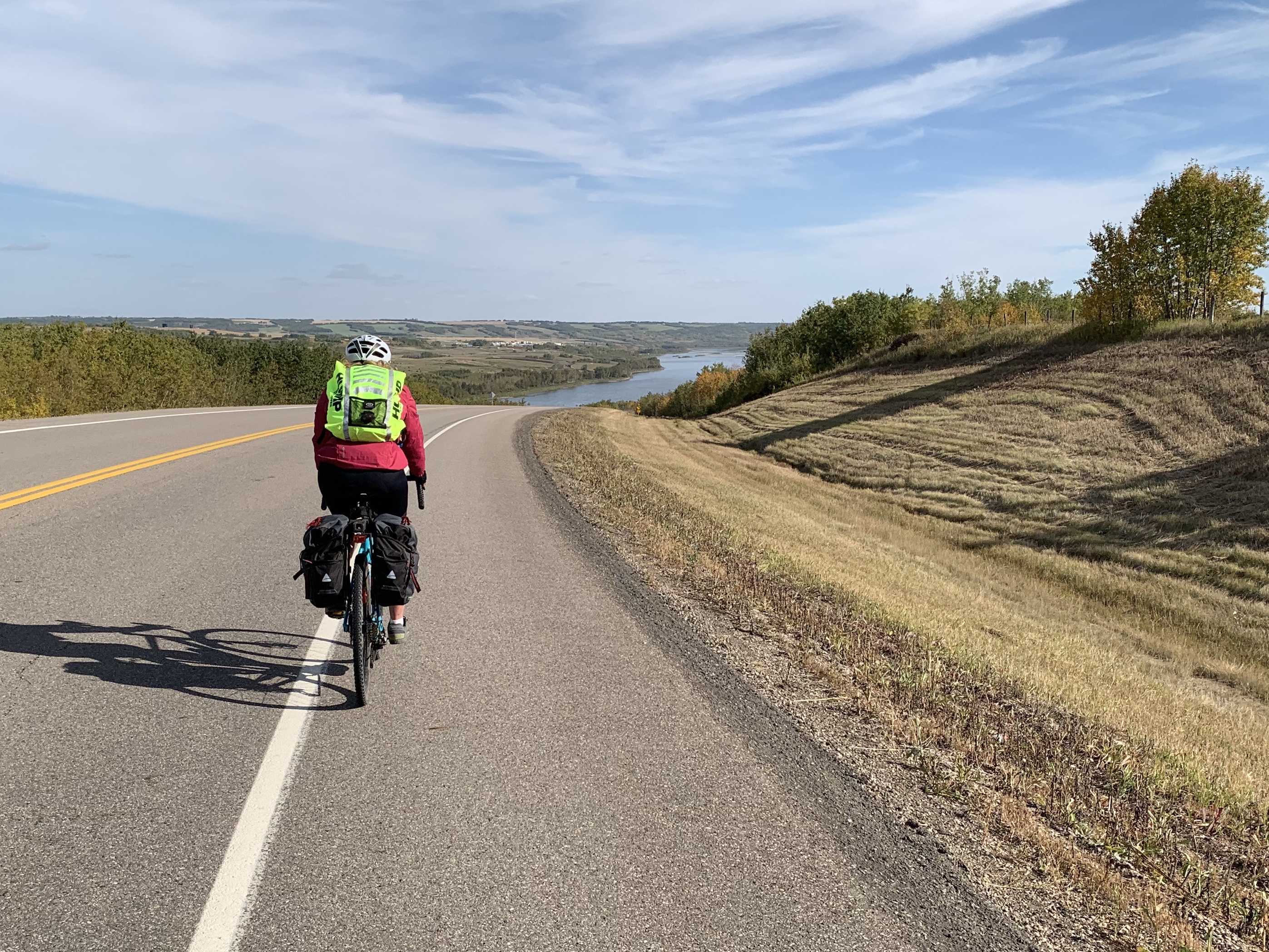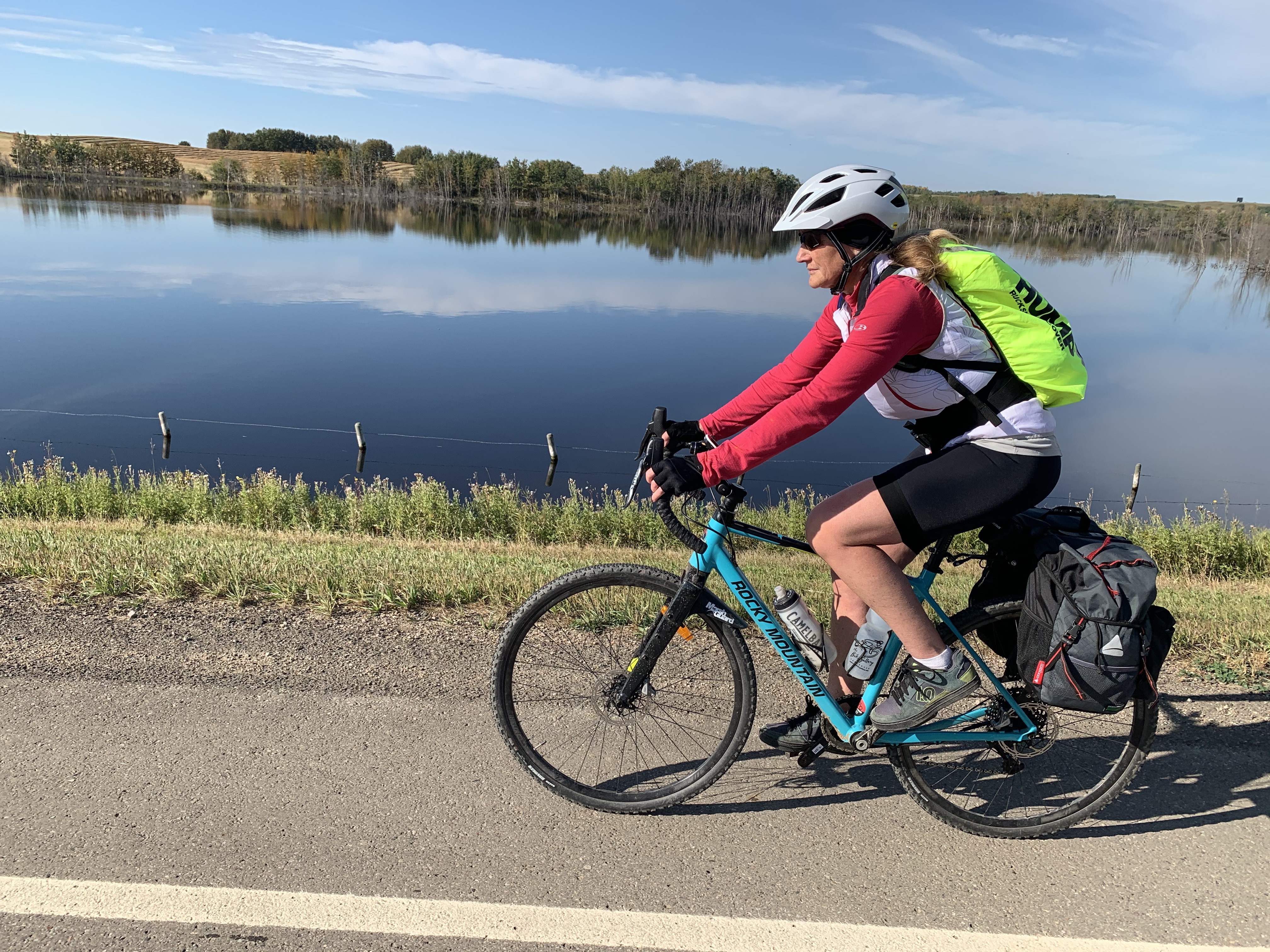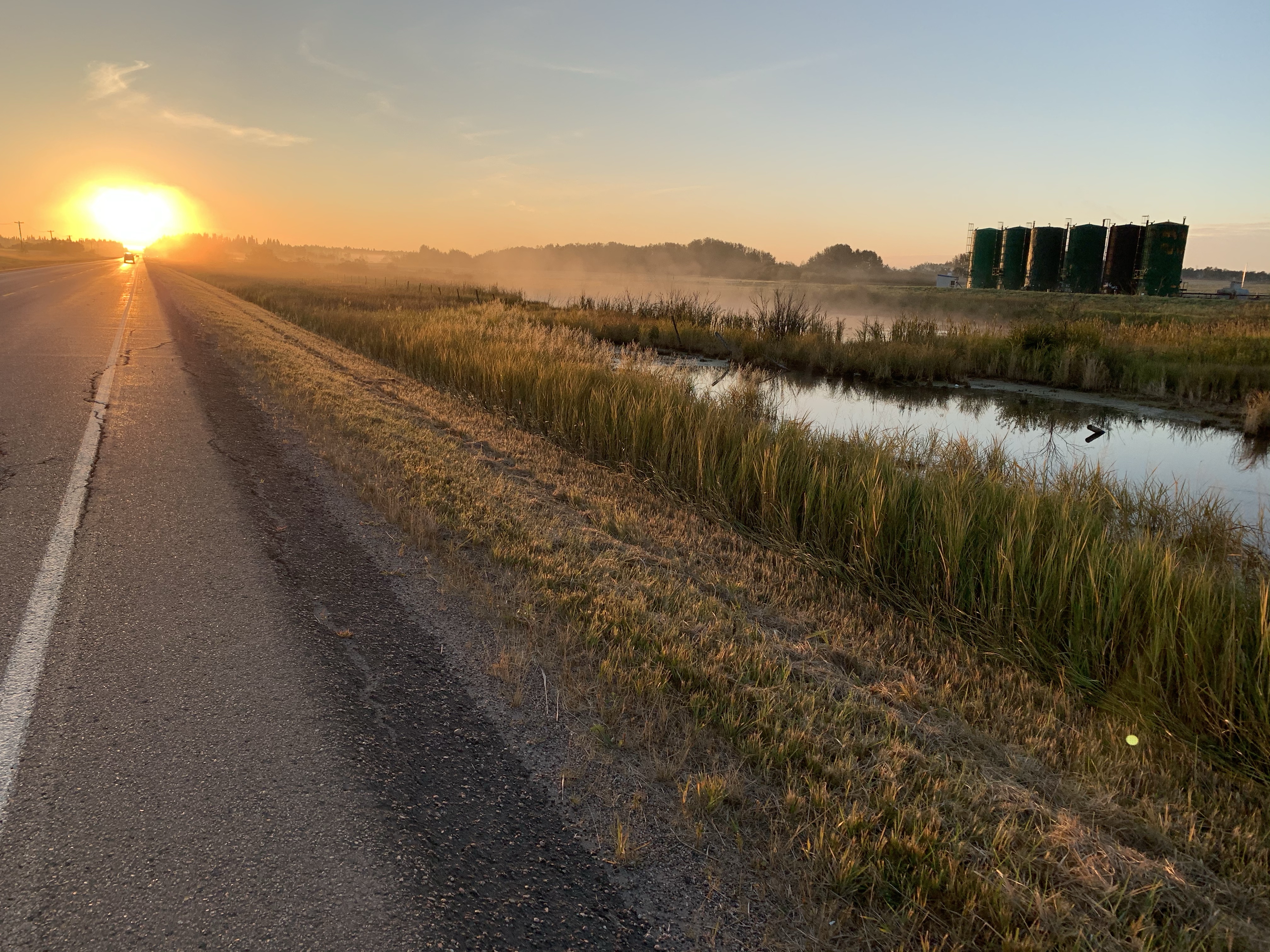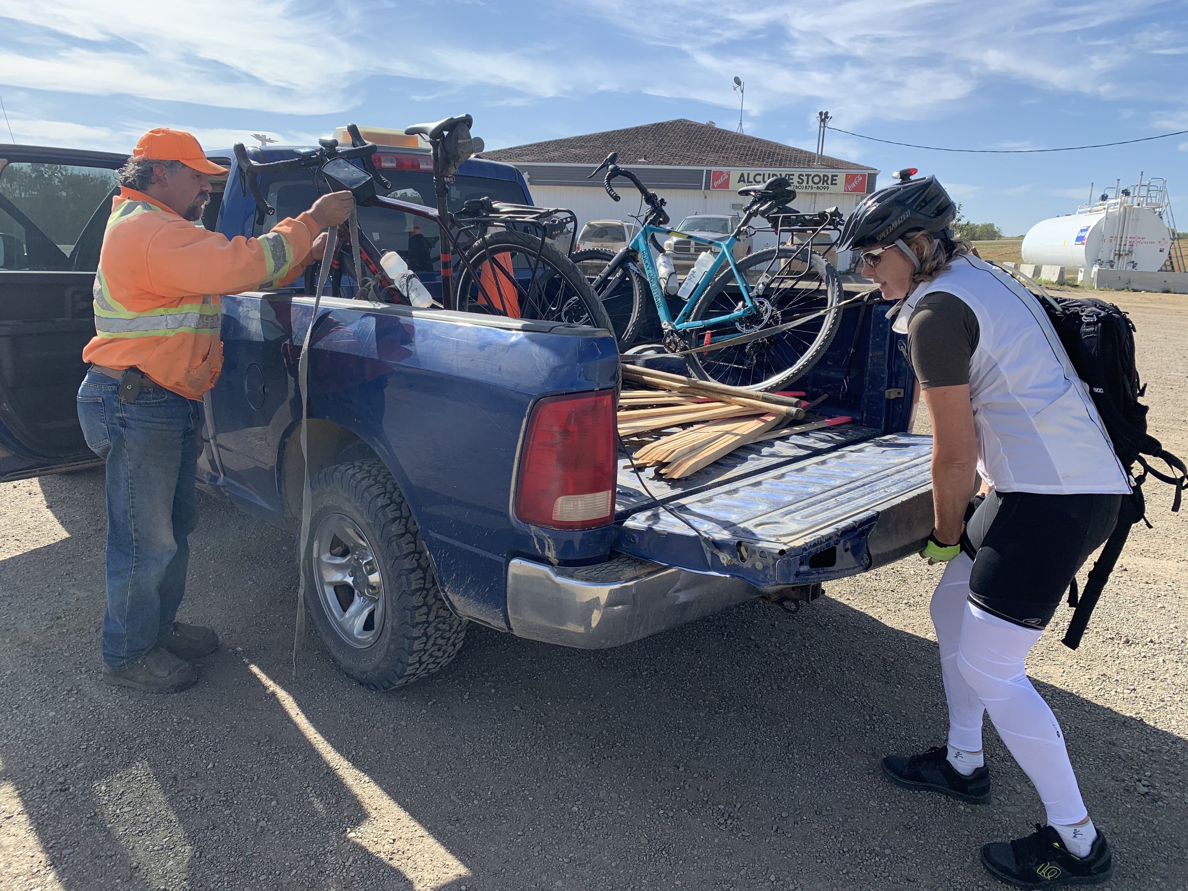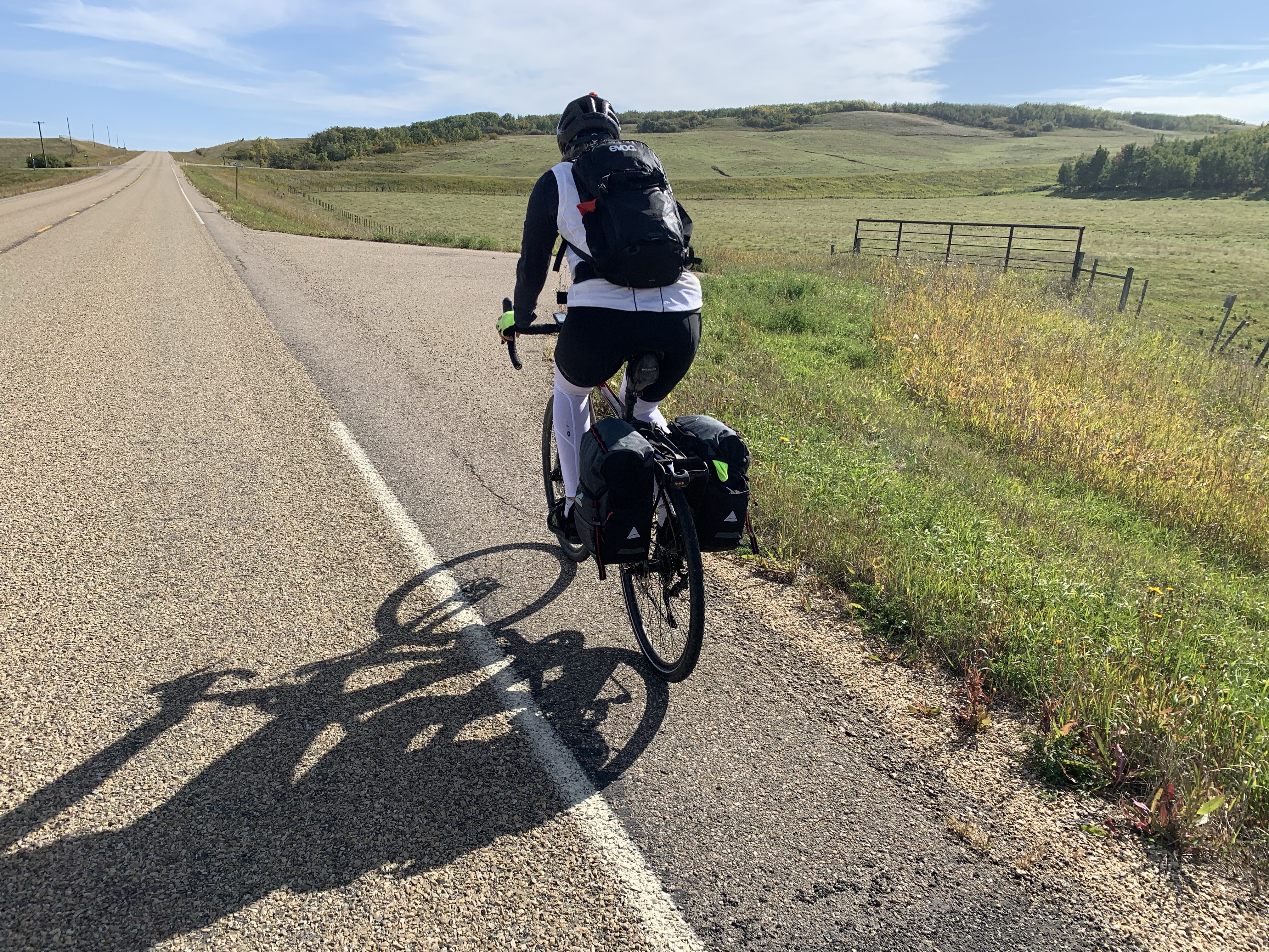 A big day – 138km, with more than 900m of climb …and we crossed from Alberta into Saskatchewan. It was not the most auspicious border crossing – we drove to the border in the back of the truck belonging to the day’s hero. His name is Howard, he lays culverts for the County of Vermillion River, and he is wonderful. More in a bit.
