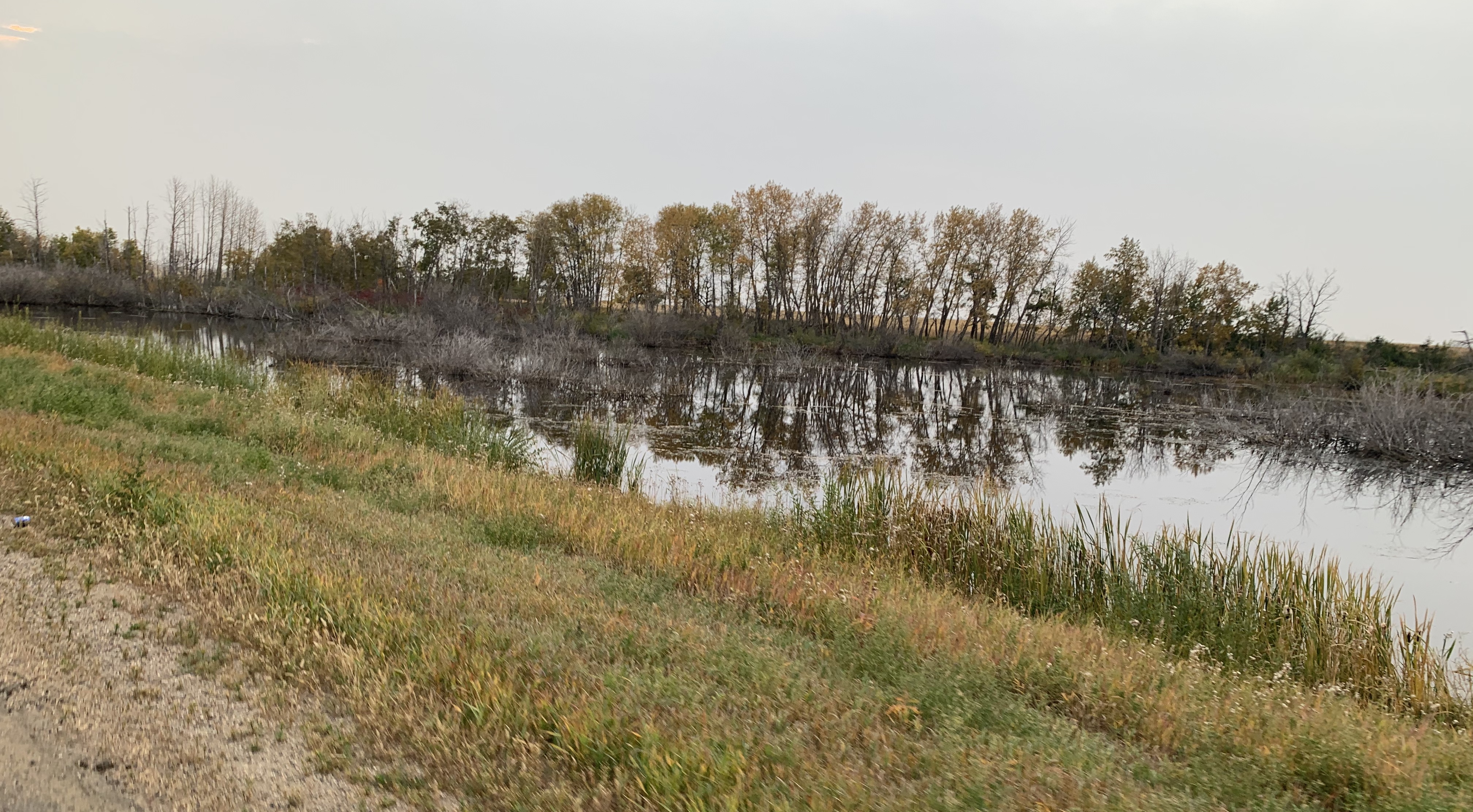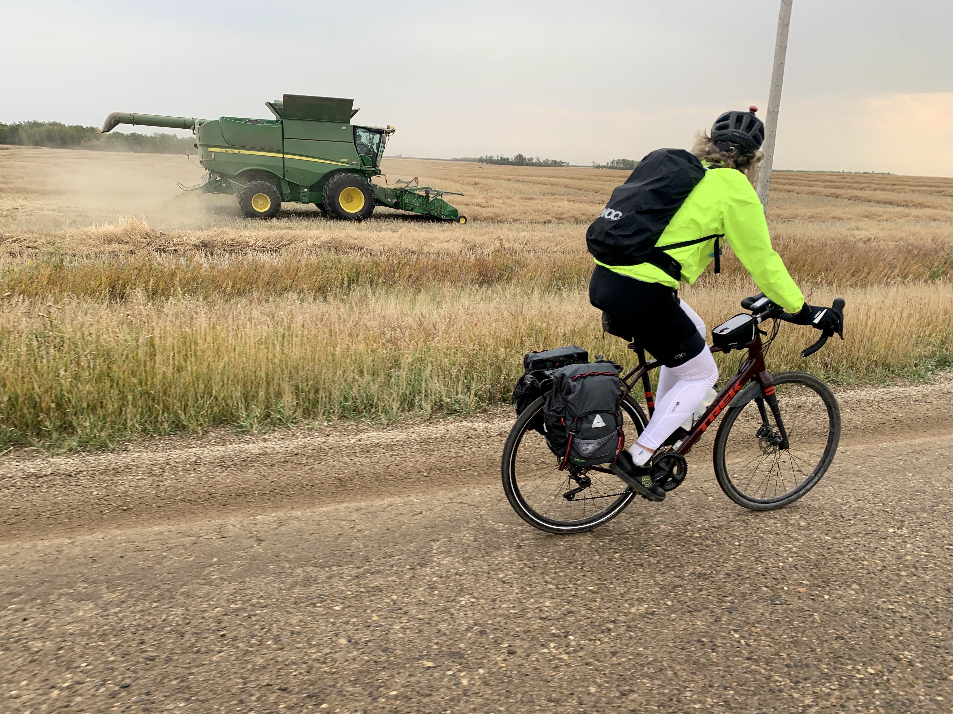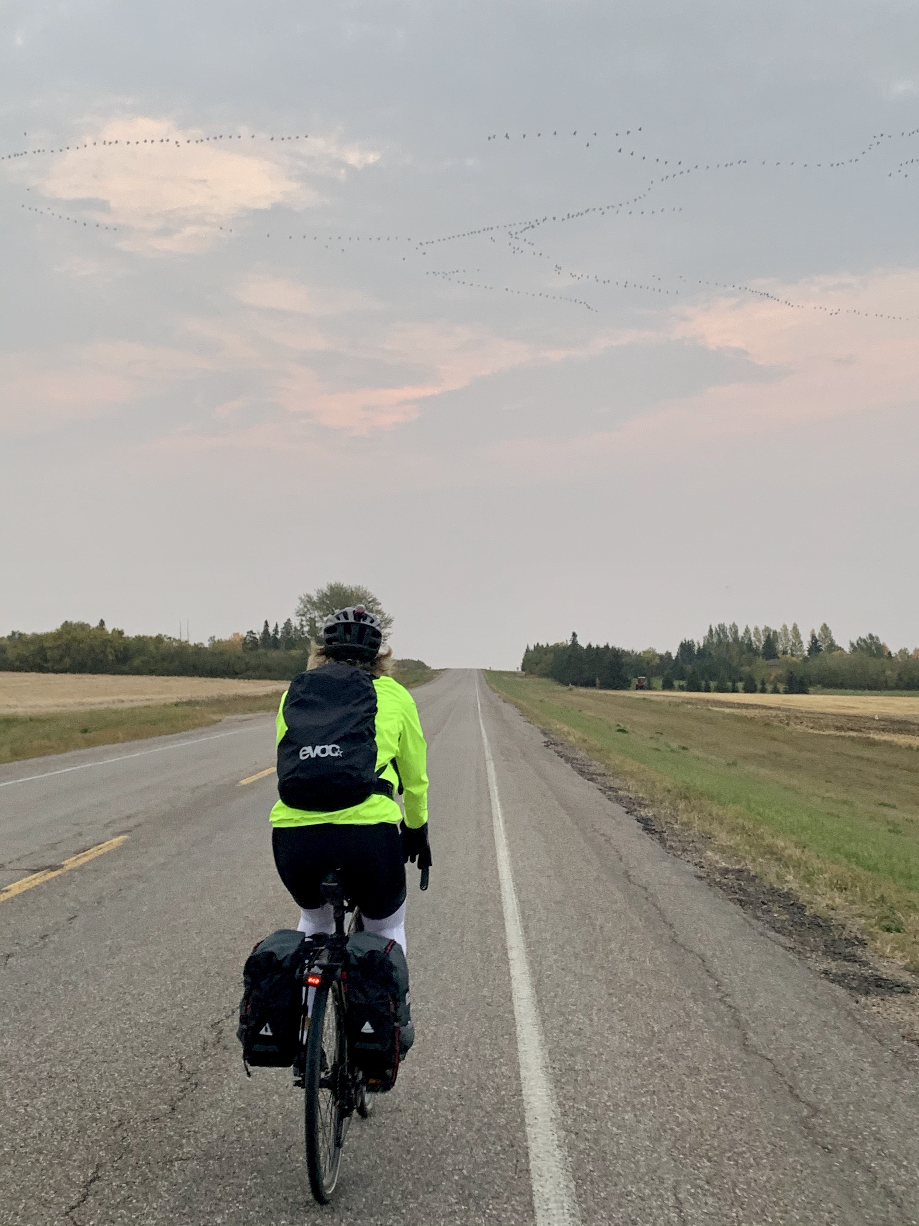 With rain and wind forecast we left North Battleford just before first light for the planned ~80km to Radisson. After bumbling around a bit to get out of town, we didn’t have even a kink in the trail for the first 30km but were rewarded for the early start with thousands of Canada geese flying overhead in noisy skein upon skein. They have arrived from farther north and feed up on leftover grain from the harvest here before they head south for winter. Other wildlife included gorgeous foxes and red tailed hawks, all hunting the stubby fields.