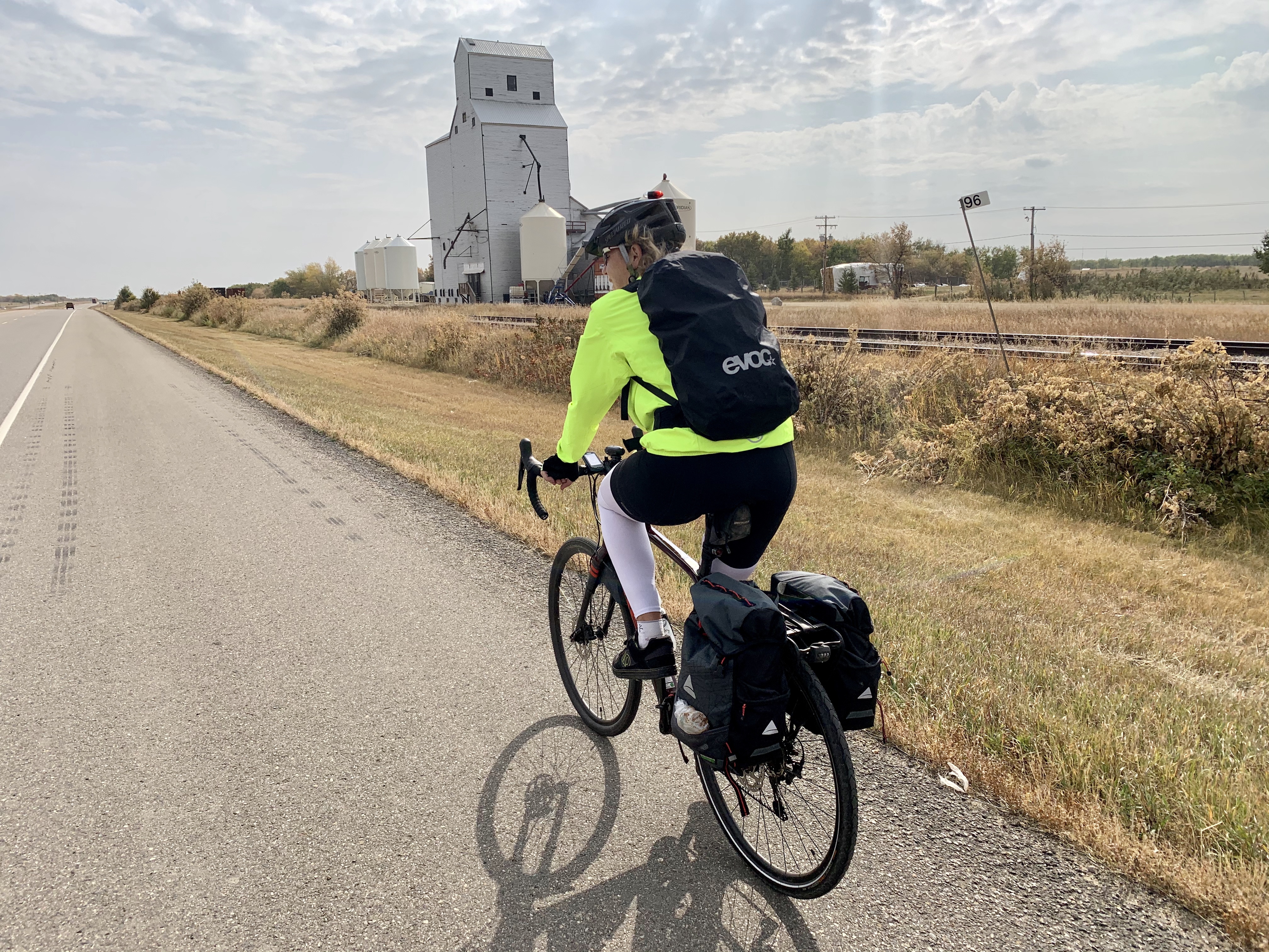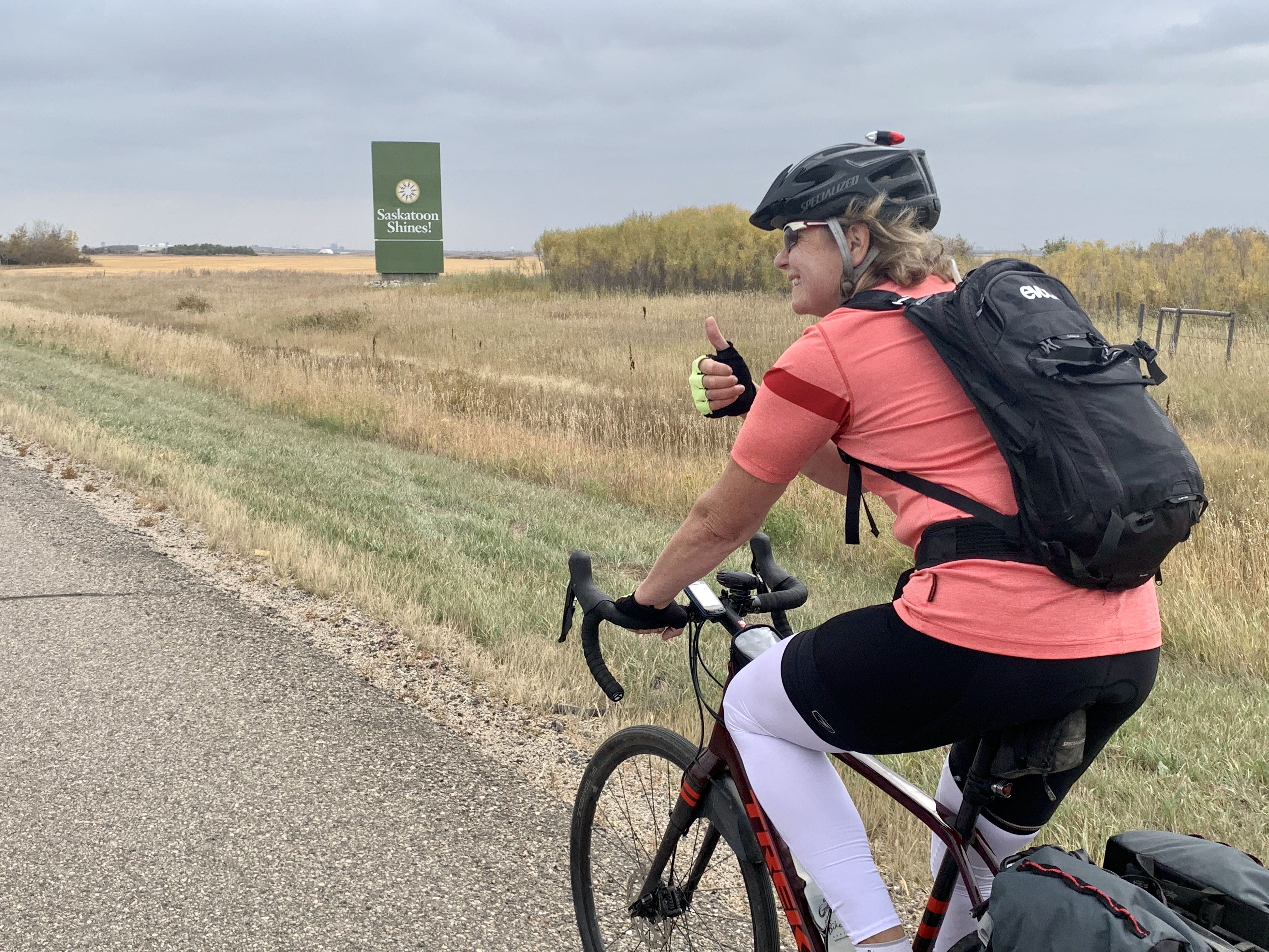 Buoyed by our good fortune in meeting him, and by a light tailwind, our spirits lifted, so when we turned on to Highway 16 about 84km into our ride and saw the sign telling us Saskatoon was 91km away, we started thinking about pushing through if we could stay ahead of the building storm behind us.