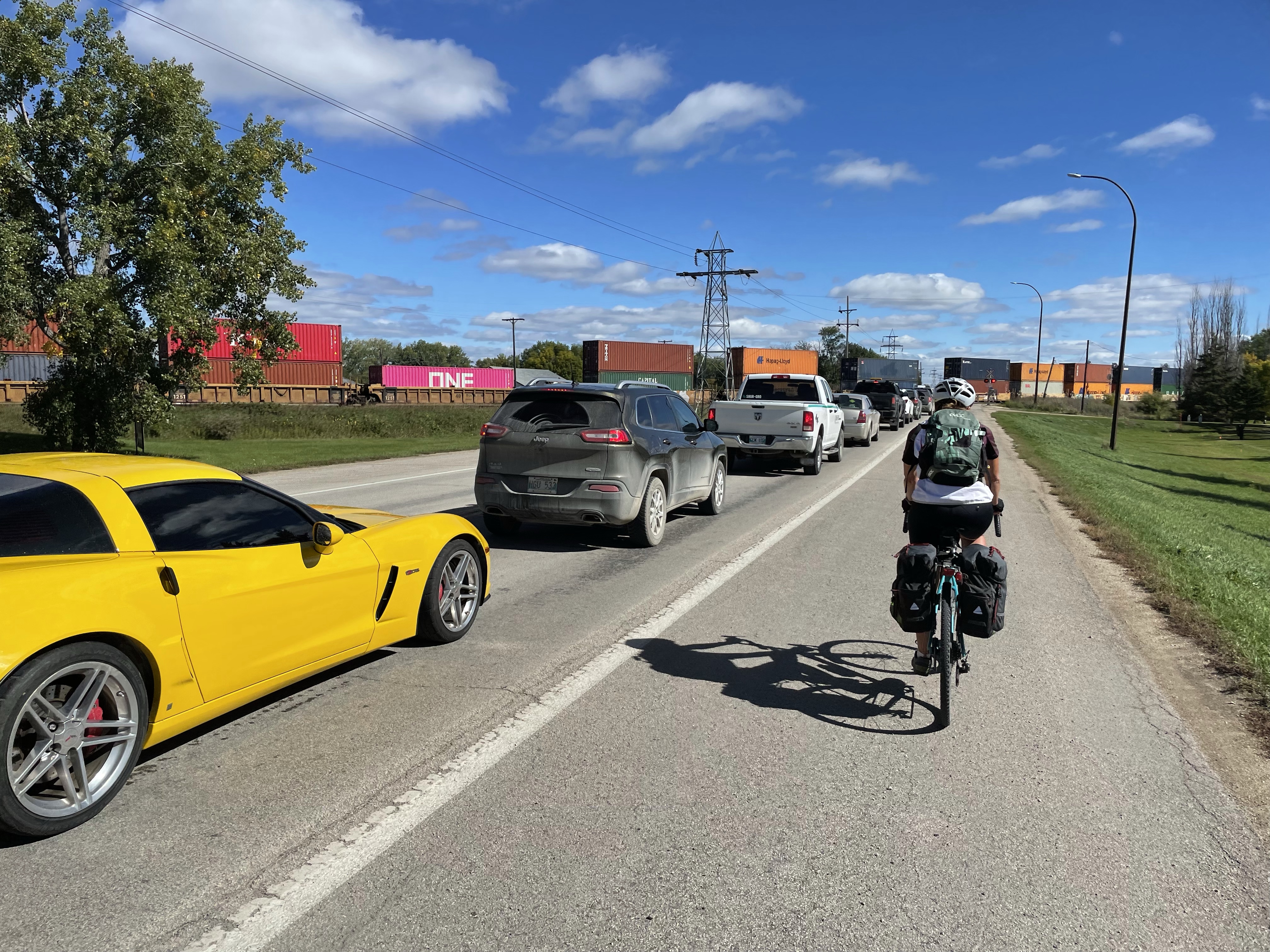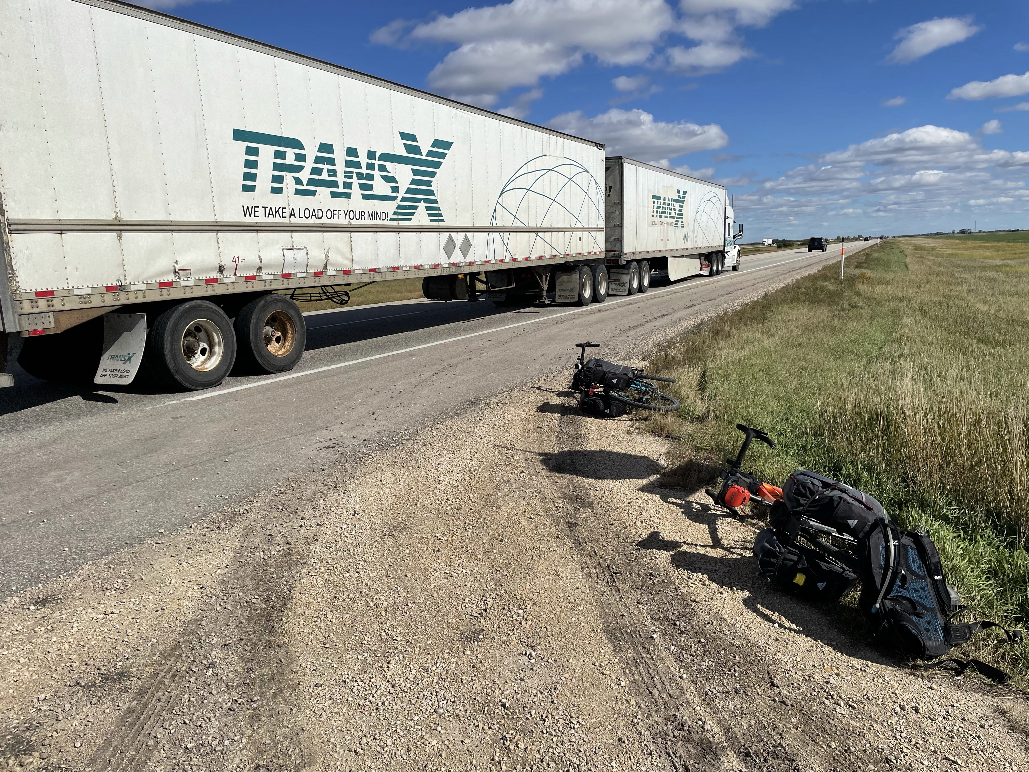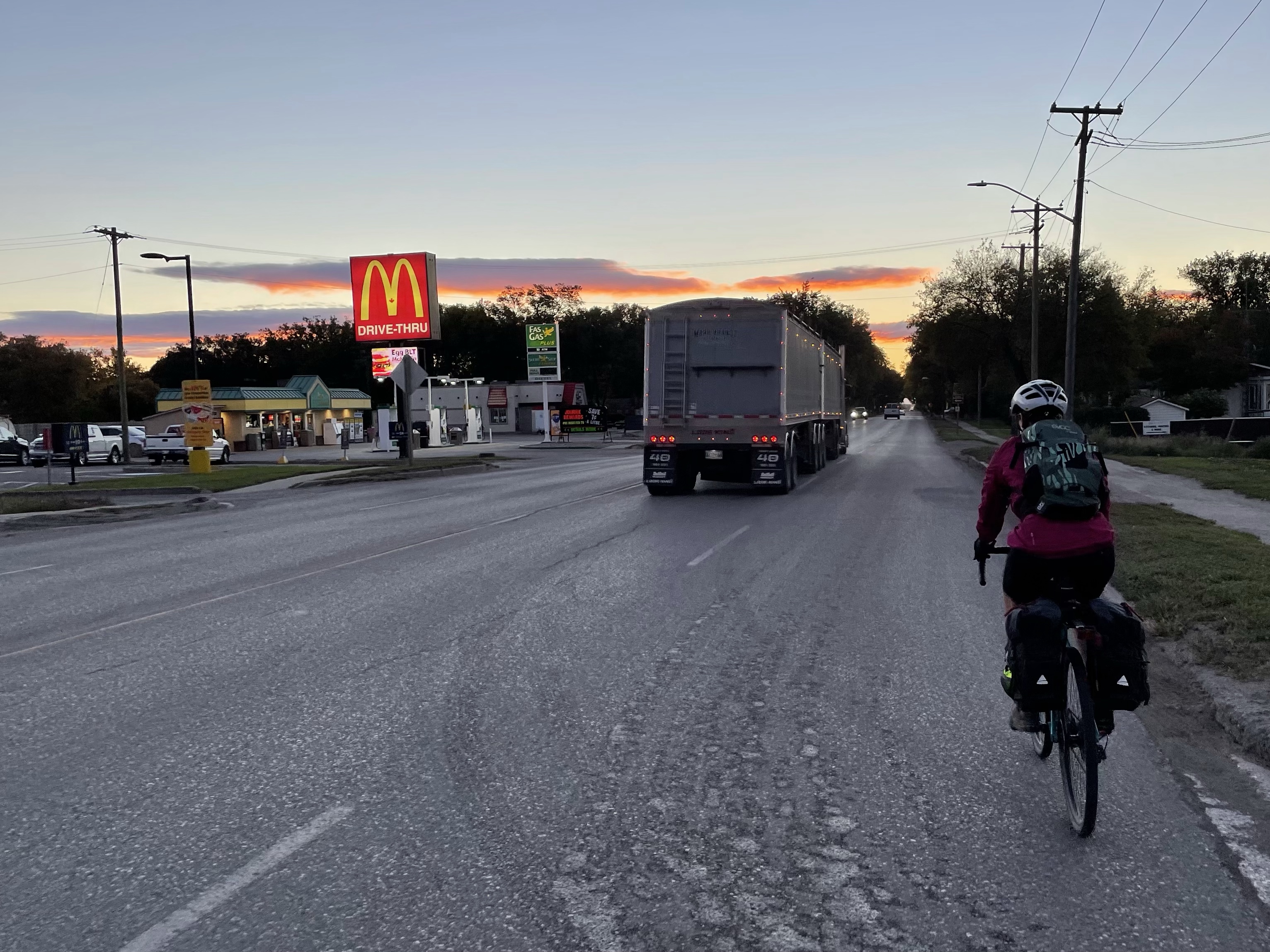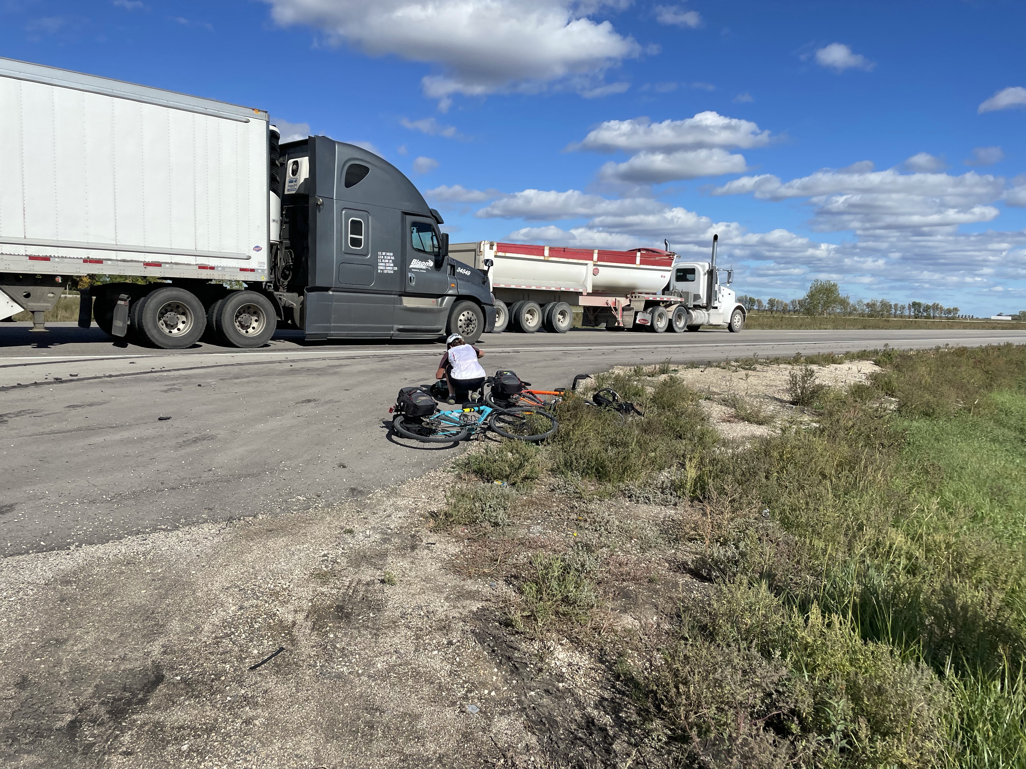 But it was quite painful riding the rest of the way. We had to stick to Highway 1 as the shortest and only guaranteed paved route. No looking around at the scenery of flat fields, short stops to stretch aching muscles or grab a quick bite only, and a few white knuckle roadworks moments squished next to enormous trucks. But the drivers were great, moving away from us when they could.