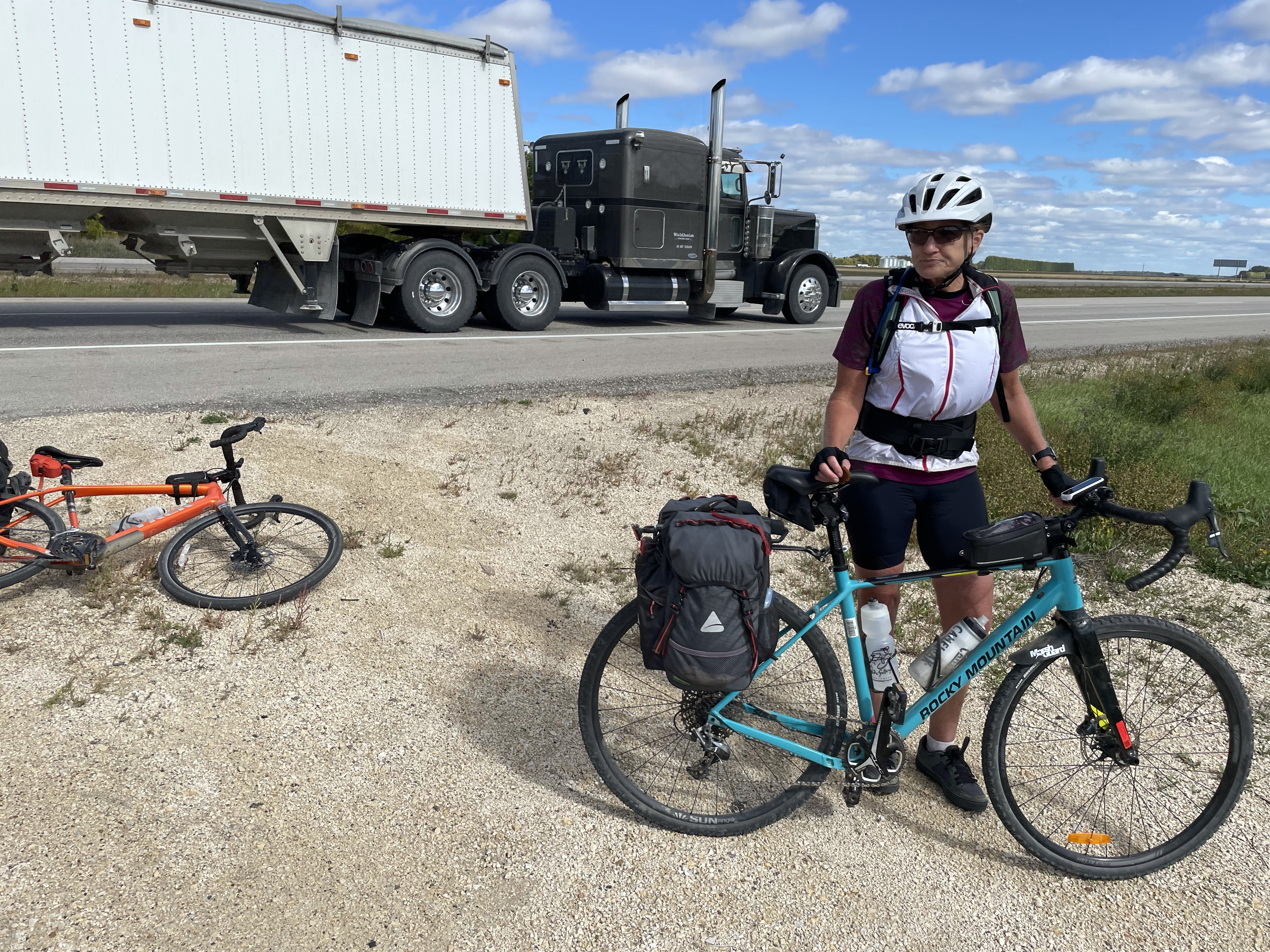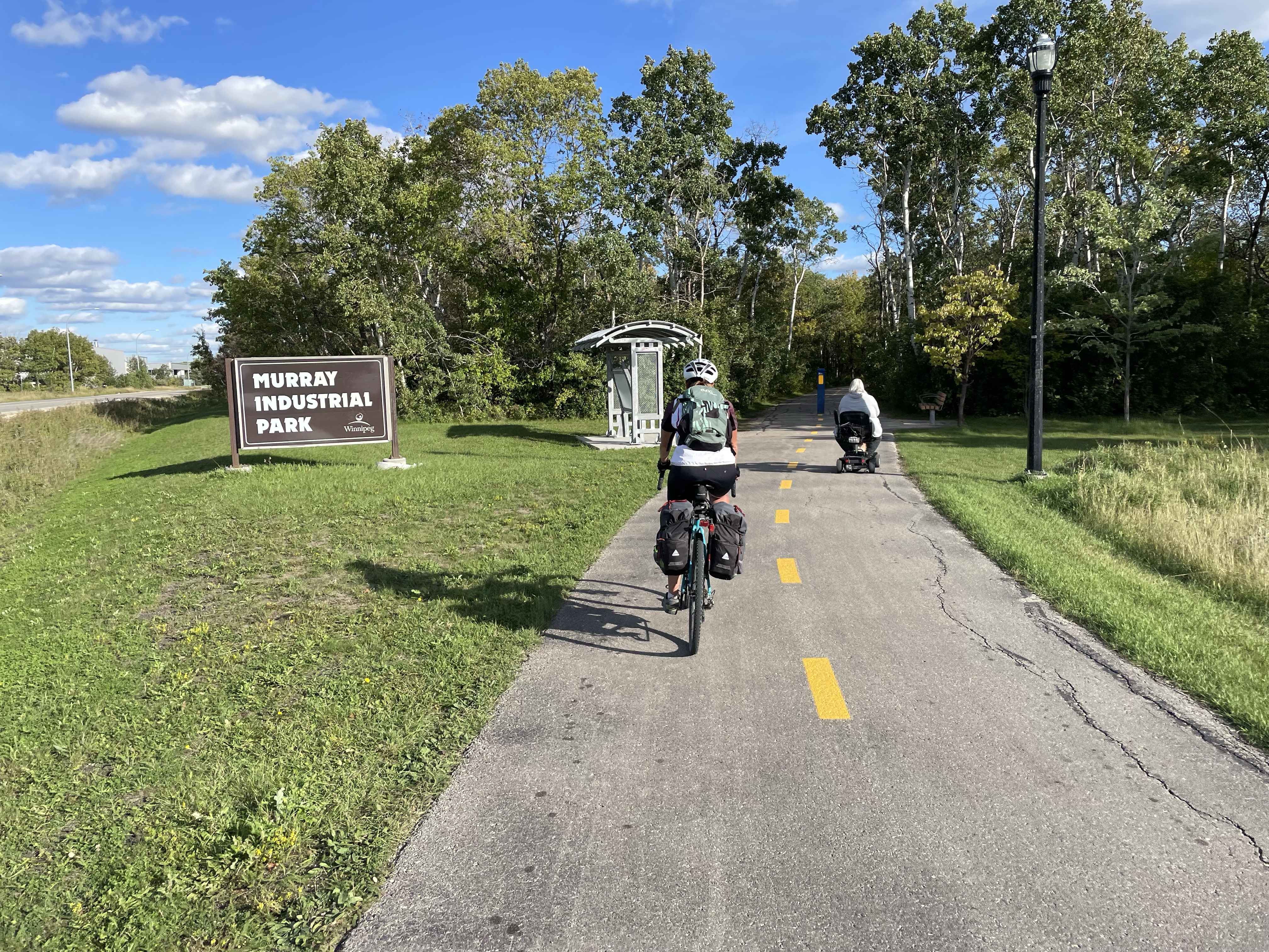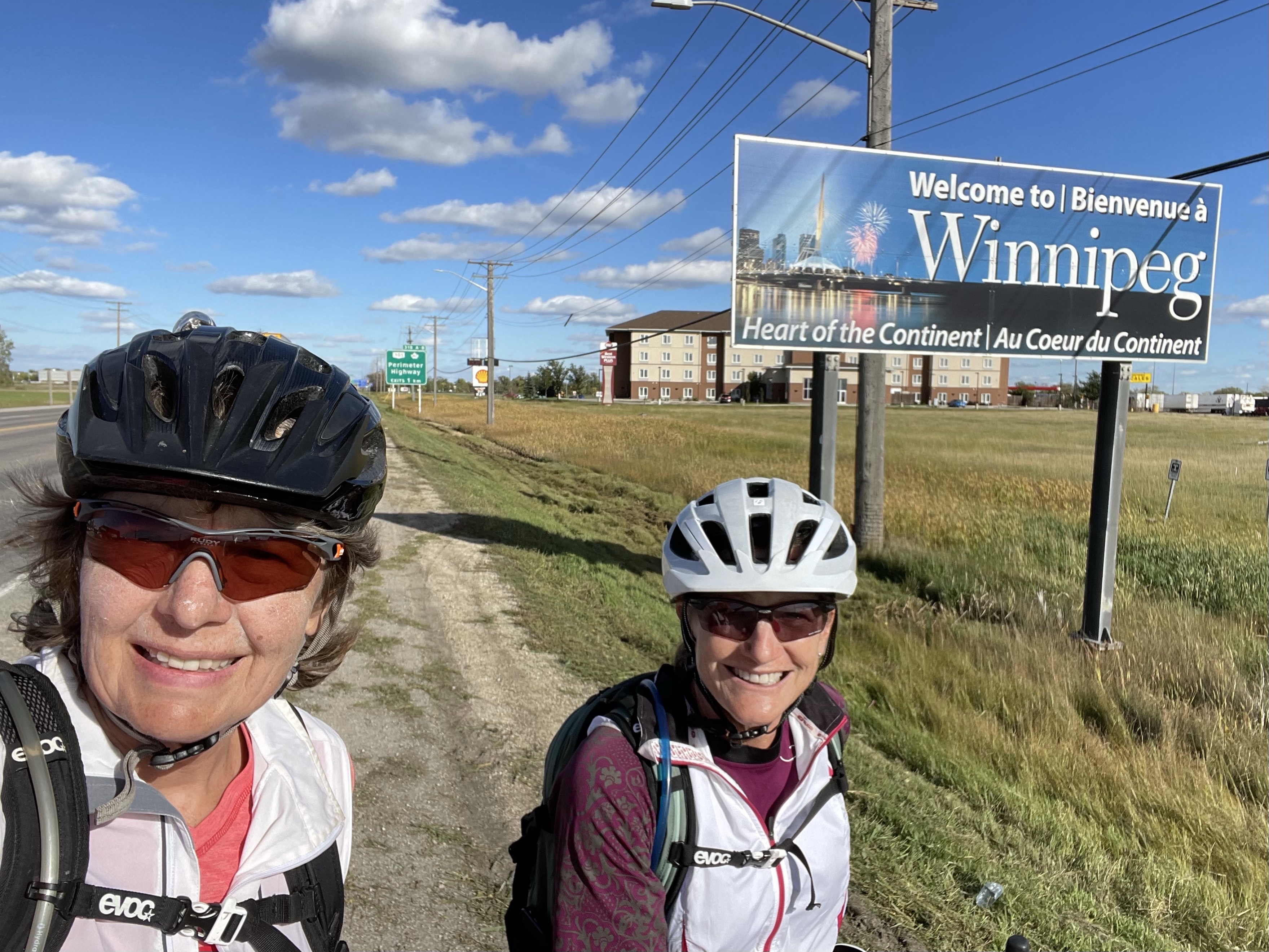 We finally crossed the Assiniboine River again and survived roadworks and traffic jams through the industrial outskirts of Winnipeg. But then Google Maps showed us a bike route all the way to our hotel near the airport. What a lovely last 15km – all on bike paths through areas being rewilded for biodiversity, through neighbourhoods and along creeks. It wrapped around the south of the airport and took us right to our door. The pain reminded us what we had ridden but the bike paths made the memory more pleasant.