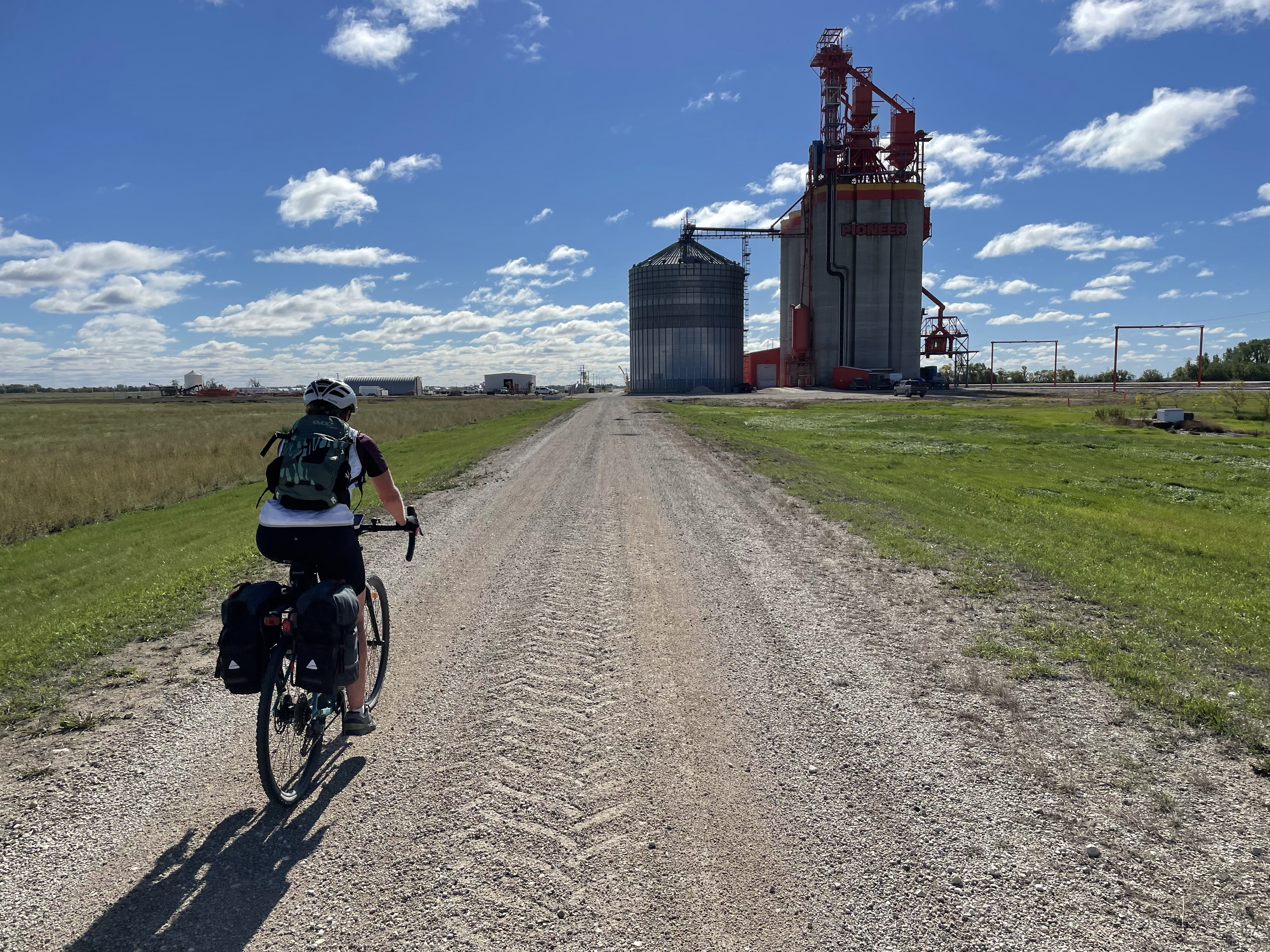 At breakfast in Gladstone (37km in) locals told us we should go for Winnipeg. The winds here have grown stronger over the years and they knew the forecast 57km/h southerly tomorrow would most likely materialize. So we stocked up on sandwiches at the local bakery and decided to make a call about 20km down the road. There we decided to go for it, but opted for a northern, quiet, route. It was a risk that didn’t pay off as we found thick gravel that would have made it impossible to cover another 120km in one day. So we headed south along a farm track, ducked through a grain elevator yard and rejoined the highway. Thanks to the tail wind and flat topography we reached Portage La Prairie (our original planned stop for the night) by lunchtime and were glad we wouldn’t be twiddling our thumbs there for the afternoon and night.