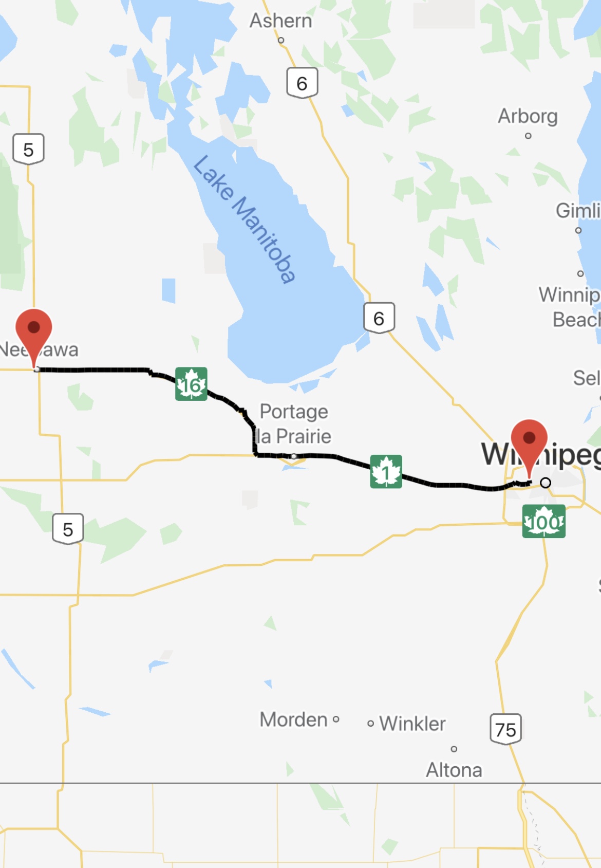 Leaving Neepawa. Our motel was on this road. It was not a quiet night.