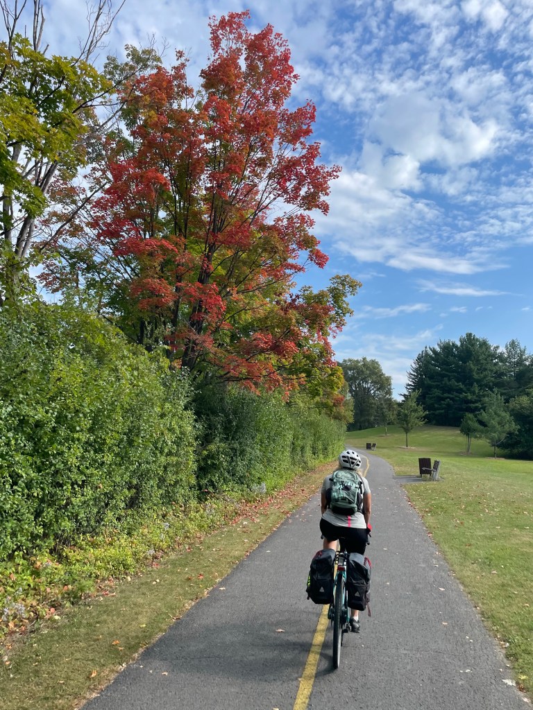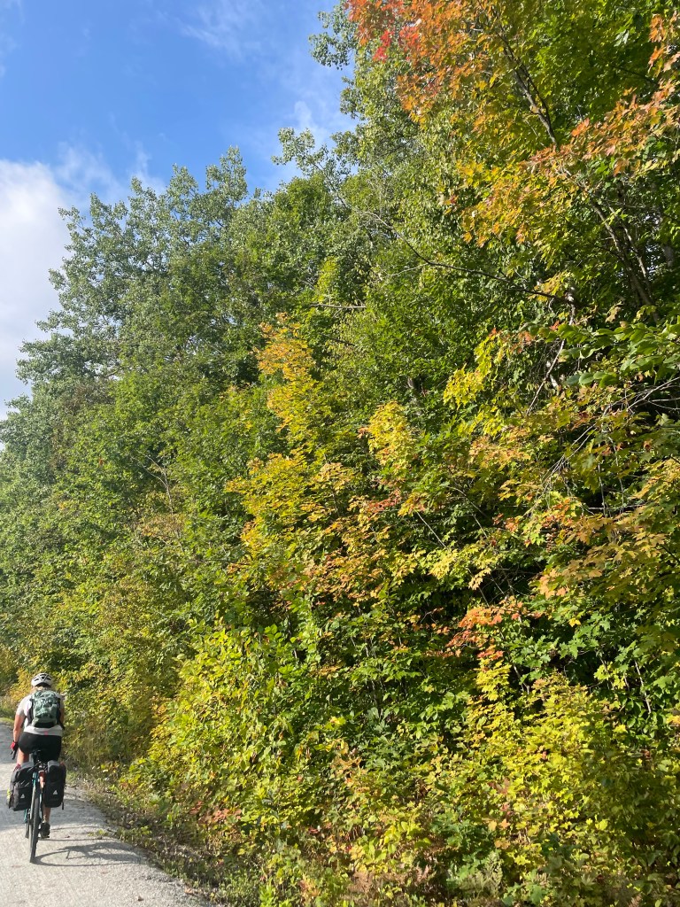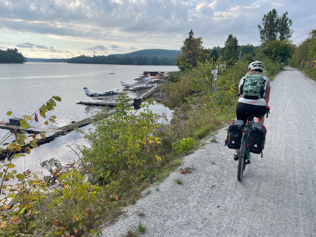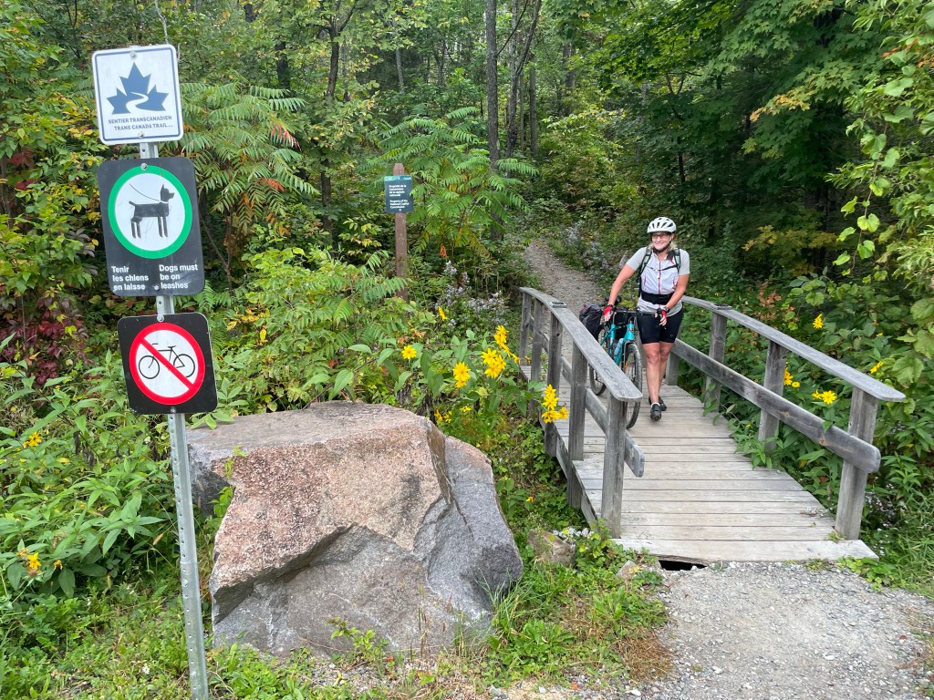 But just outside Wakefield, following the map/app, we came onto a steep single track of rocks and roots marked “no cycling”. We tried it anyway, but it would have been a long walk with pannier-laden bikes, so we turned back and opted for the road along the Gatineau river. What we didn’t know was that we could have gone around this no-bike portion and joined the correct track further on. It still would have been challenging – more for mountain bikes – but we think we could have done it.