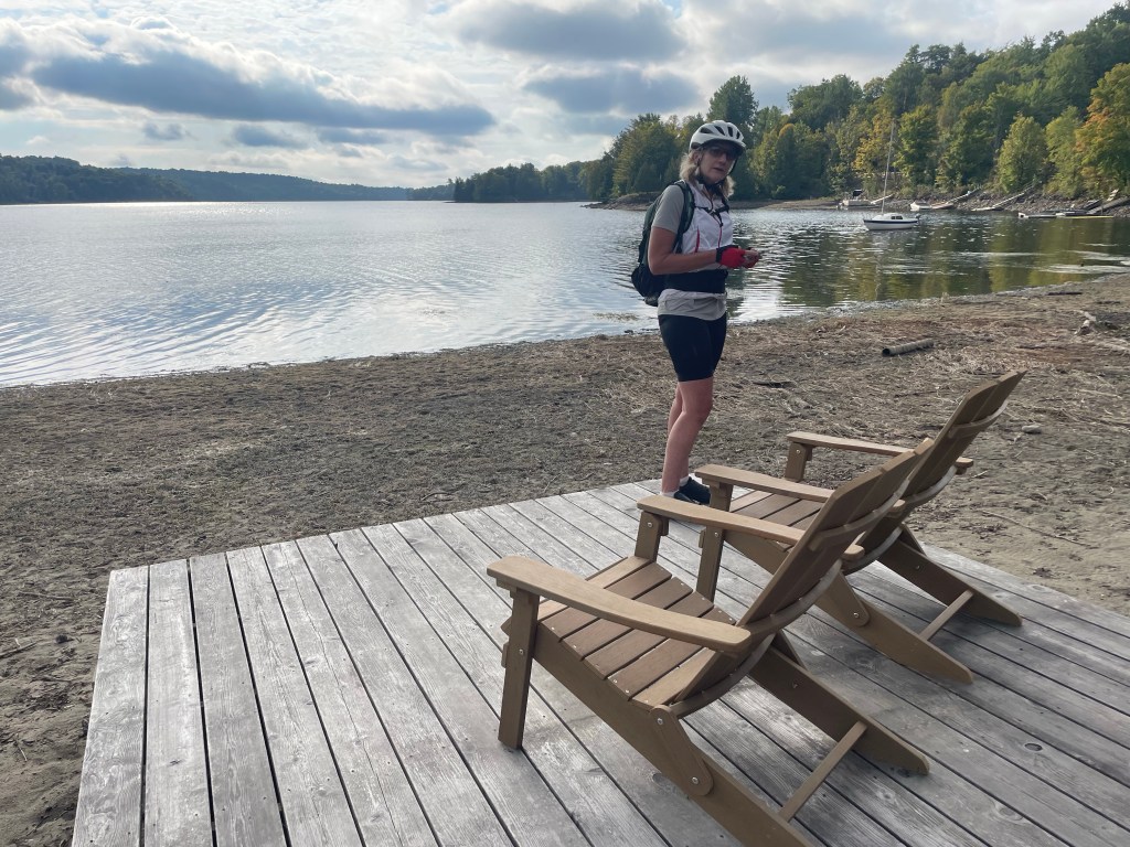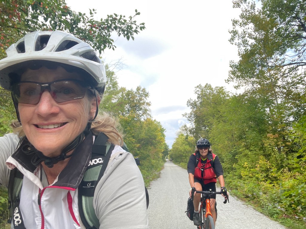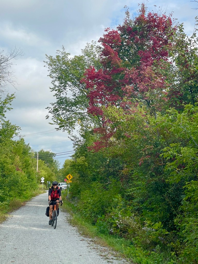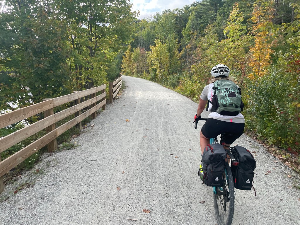 But just outside Wakefield, following the map/app, we came onto a steep single track of rocks and roots marked “no cycling”. We tried it anyway, but it would have been a long walk with pannier-laden bikes, so we turned back and opted for the road along the Gatineau river. What we didn’t know was that we could have gone around this no-bike portion and joined the correct track further on. It still would have been challenging – more for mountain bikes – but we think we could have done it.