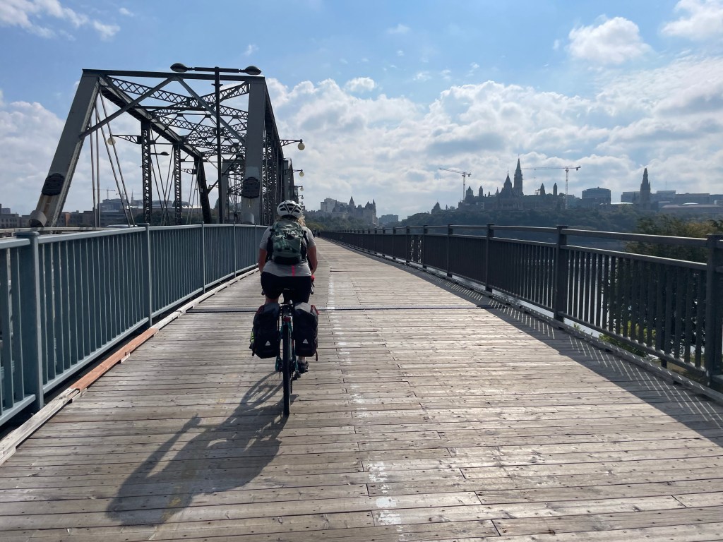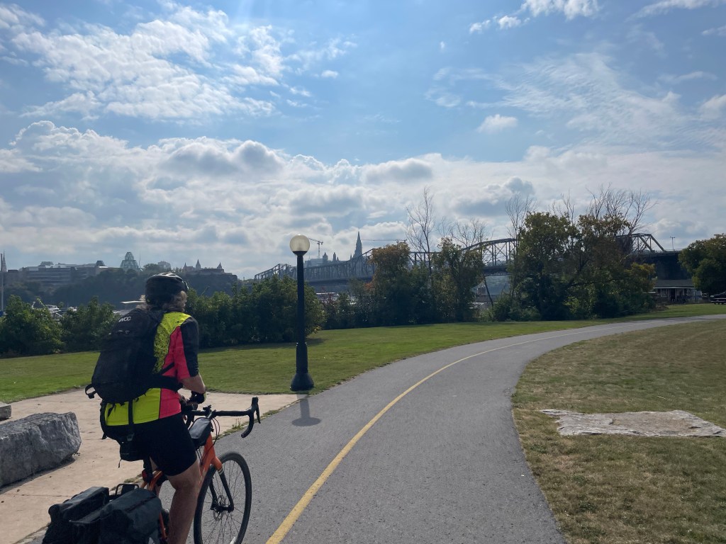 In the end, we picked up a lovely community trail on an old rail line along the river, completely unmarked on the Trail map. It made for very easy and pretty cycling almost all the way into the parks on the outskirts of Gatineau town and across the river into Ottawa, and Ontario – our sixth province on this incredible journey.