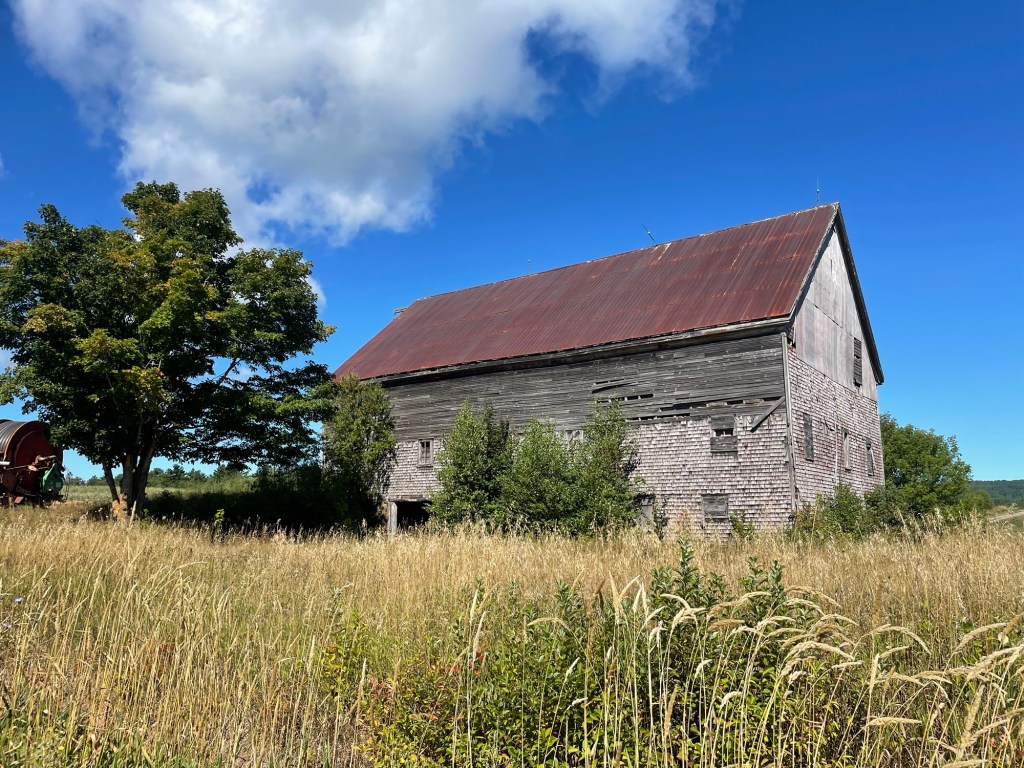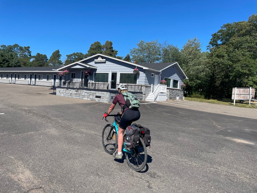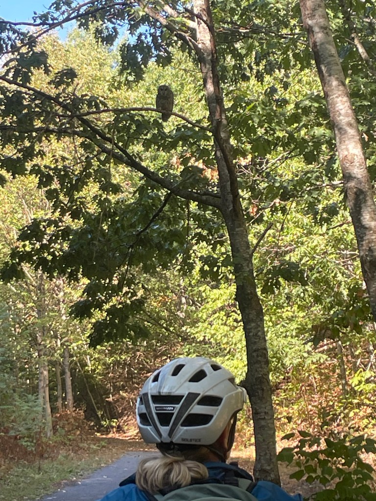 After a light breakfast at the inn, we started the morning optimistically with a brief stint on the trail where a gorgeous barred owl flew out and perched above us. Our joy was shortlived though as we soon had to divert from the closed sections of trail, and spent the morning battling rolling hills into a brutal headwind on roads with no shoulder and cracked surface. To dampen our humour more, our targeted lunch stop was closed. This is quickly getting stale …