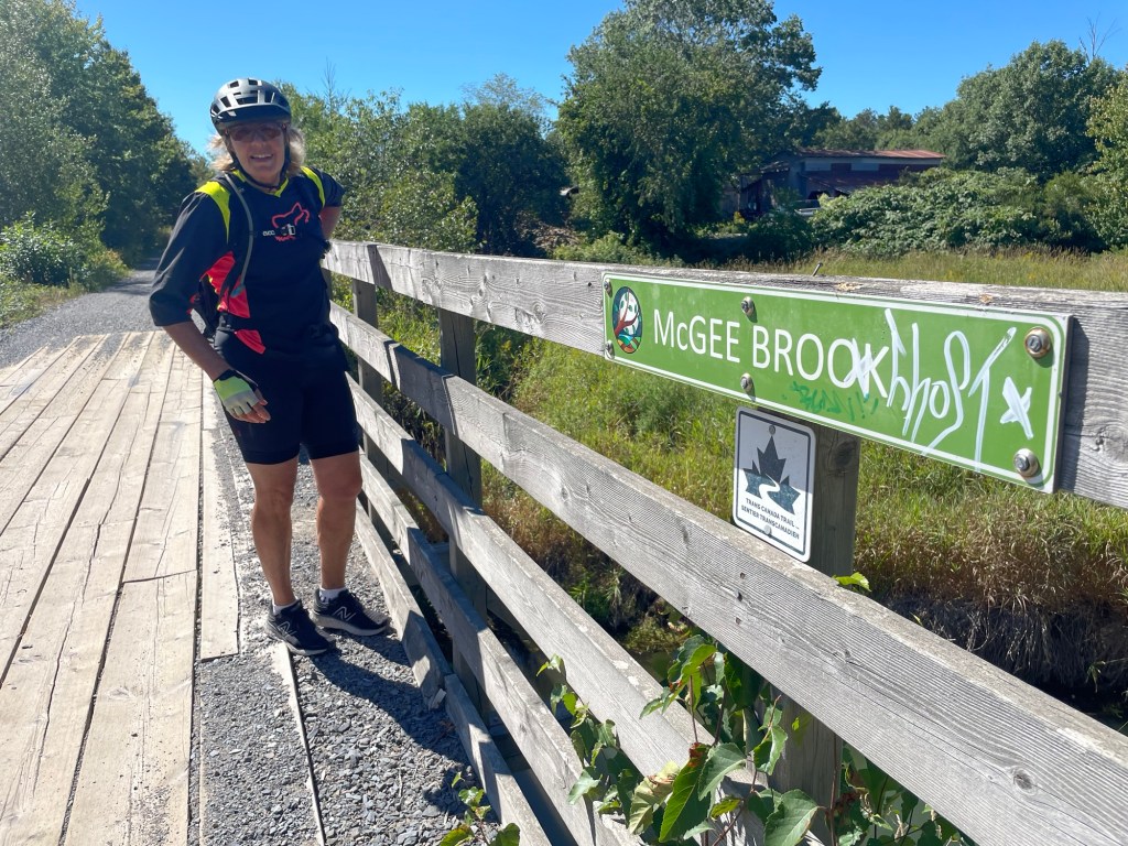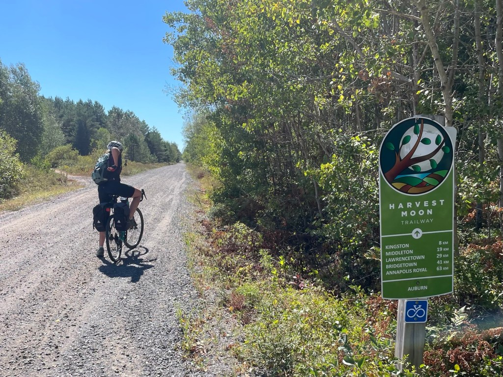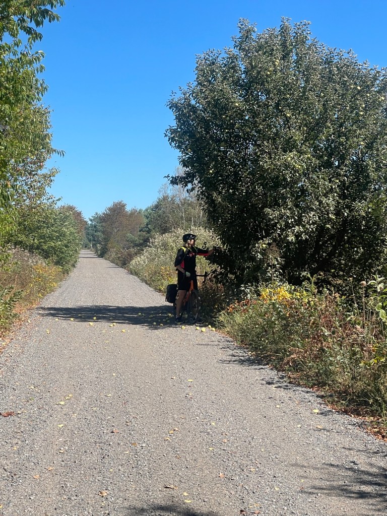 The Harvest Moon Trail was open from Berwick. It provided shade, shelter from the wind and lots of views of farm fields and orchards. We even ate apples from wild trees next to the trail.
