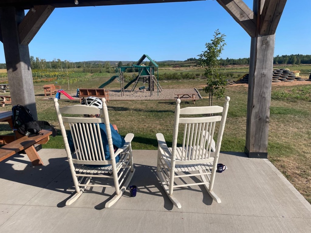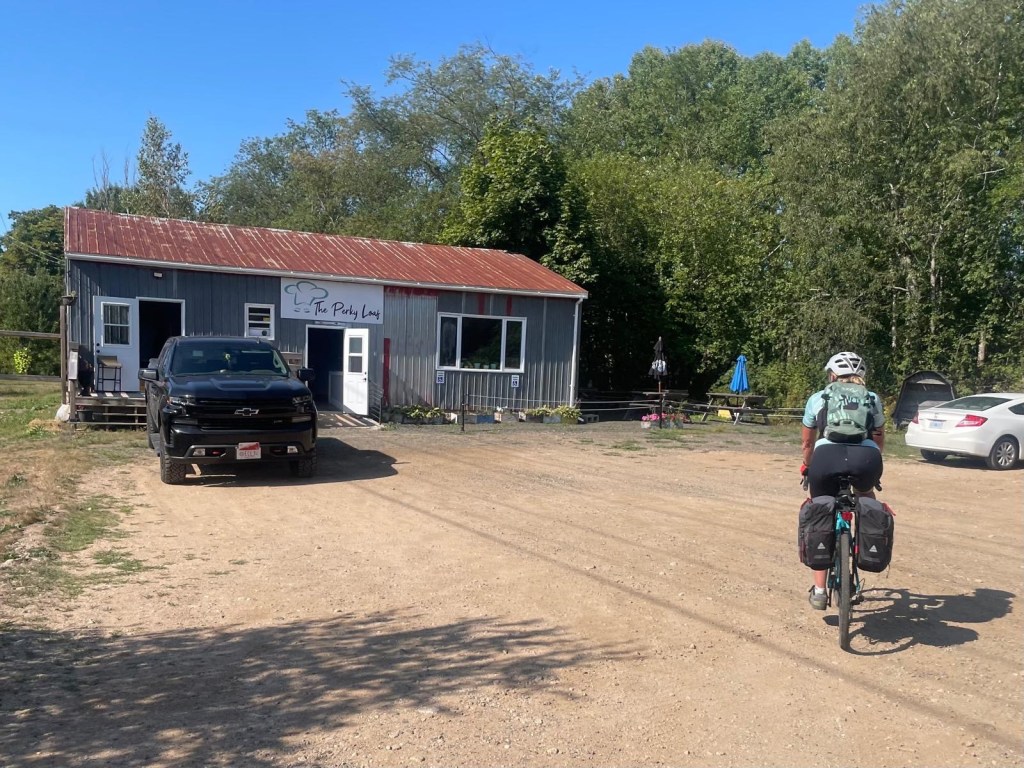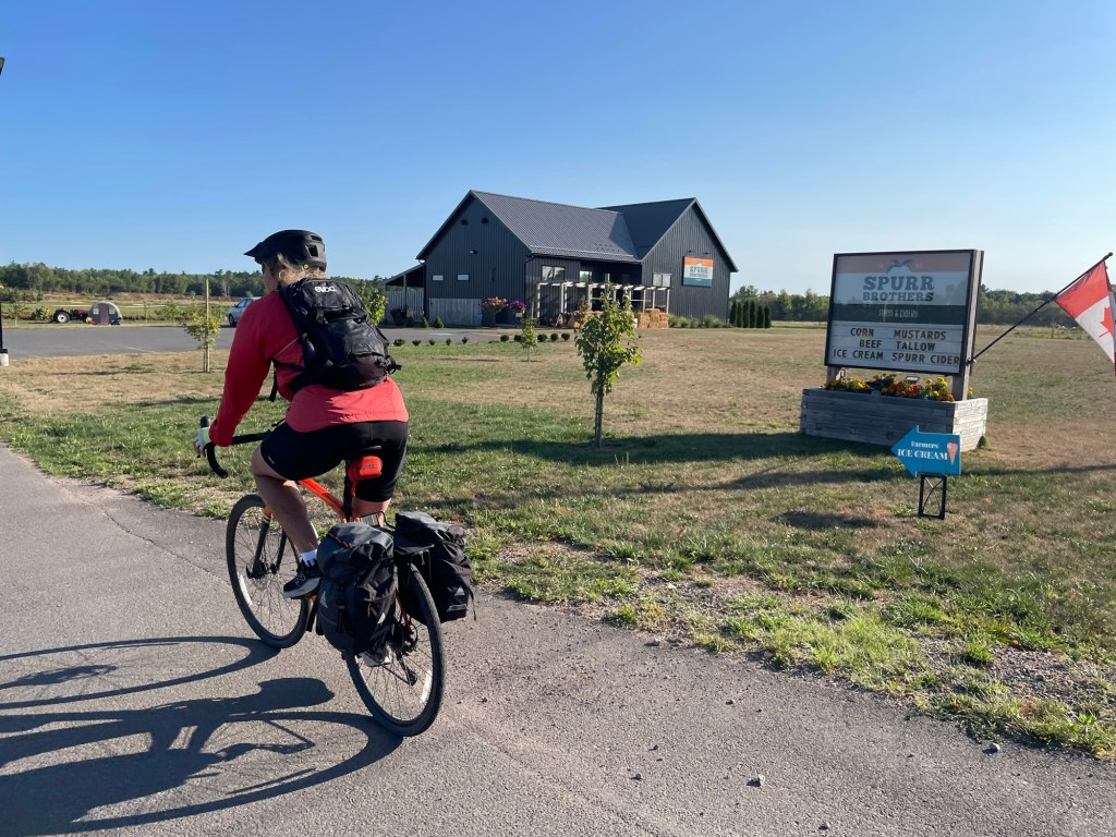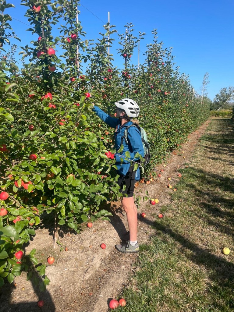 A crisp and early start out of Kingston took us to even crisper apples we picked from the orchards at Spurr Brothers’ farm about 10km away. We should have picked four each. We strolled through the orchards and flowers with our coffee, loving the thousands of fat bees going about their early morning business. Breakfast was another 10km down the trail at the Perky Loaf. The meal was great, but more impressive were the women who work here loading truckloads of freshly made packed lunches to take to the firefighters at the Long Lake fire a few kilometres away. They have been doing this daily since the fire broke out more than two weeks ago. It’s now over 8,200 hectares and, although no longer growing fast, is still considered out of control. But the air remained clear on the west coast of the province today and we cycled on to our next stop, for a cappuccino in Bridgetown.