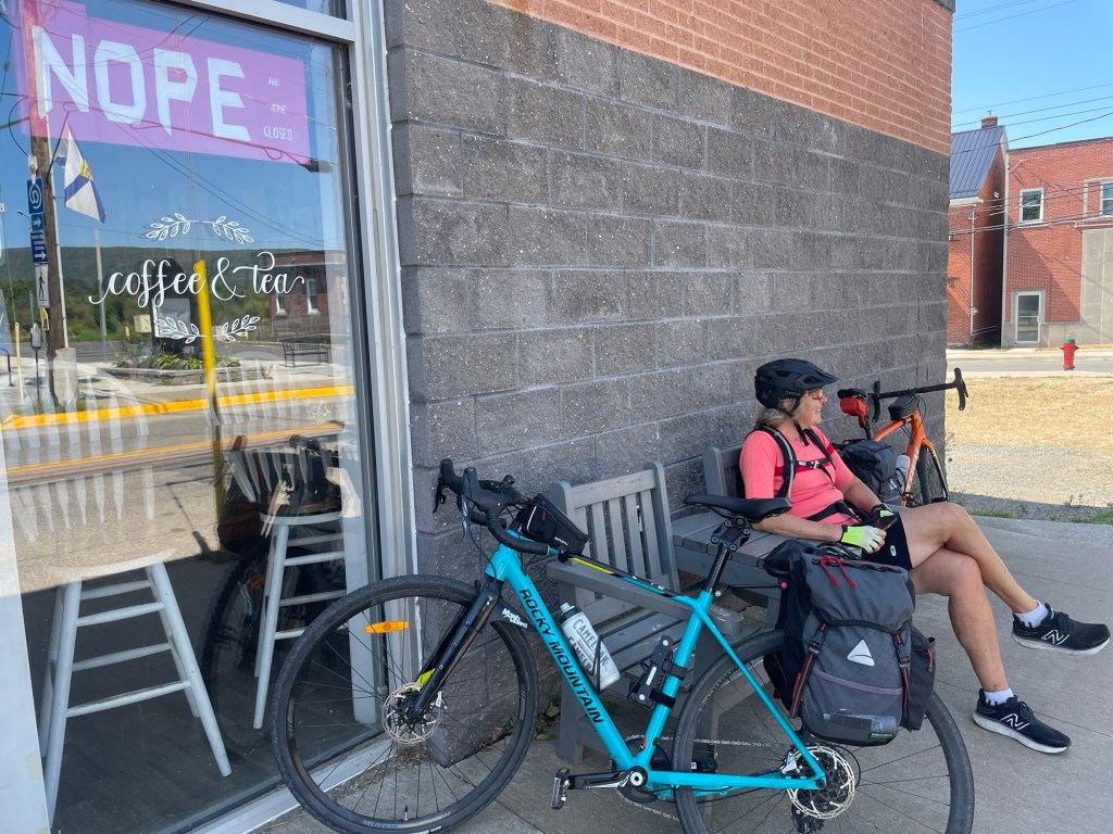 We were hot (it’s 29 degrees) and dusty when we pedalled into Annapolis Royal, but we still weren’t as grumpy as the man serving at Sissiboo cafe. Must be tough being one of the only open places for miles …
