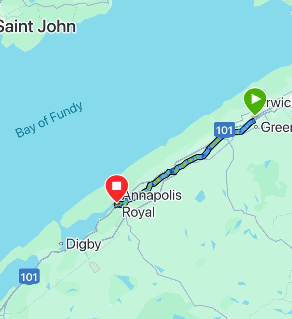 Annapolis Royal stews in history, and we were reminded again about the Mi’kmaq nation who sided with the French Acadians against the English for several centuries, but the English eventually got the better of both and shipped the Acadians off to other shores in the “Grand Derangement”. There’s still a lot of Acadian loyalty here in the tricolor flags but all the town names recall the far-away English and Scottish homelands of the victors.