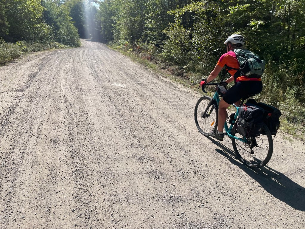 But the road was quiet and lovely. Soon we were on a gravel backroad that got more rustic – potholes – as the kilometres passed. Our only encounters in 26km were 1 bear, 2 cars and 1 local mountain biker. And we were out of the Tim Hortons radius for all towns – zero litter.