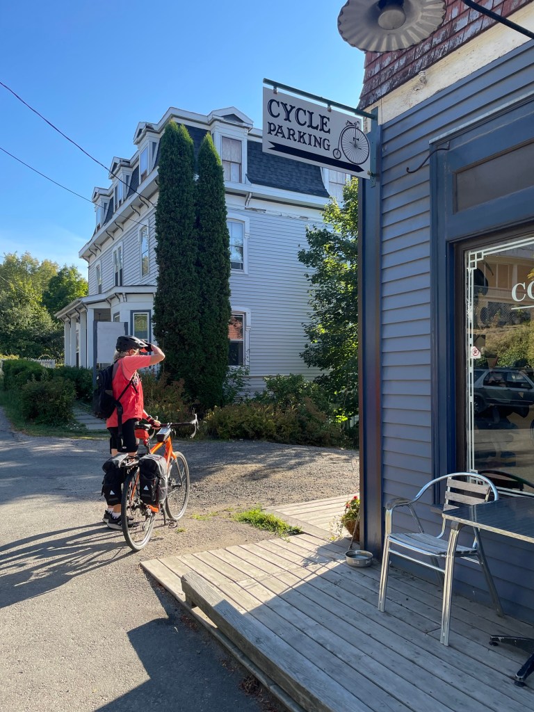Fortified by a handful of nuts we climbed out of Digby in the morning fog and towards breakfast in Bear River. The climb defied the laws of logic – Bear River is a hamlet at the head of the river; it’s on stilts to manage the huge tide swings, so the ridiculous climb made no sense. But just before the town the road fell off a cliff and we undid every metre of altitude gain in our legs flying down into town.