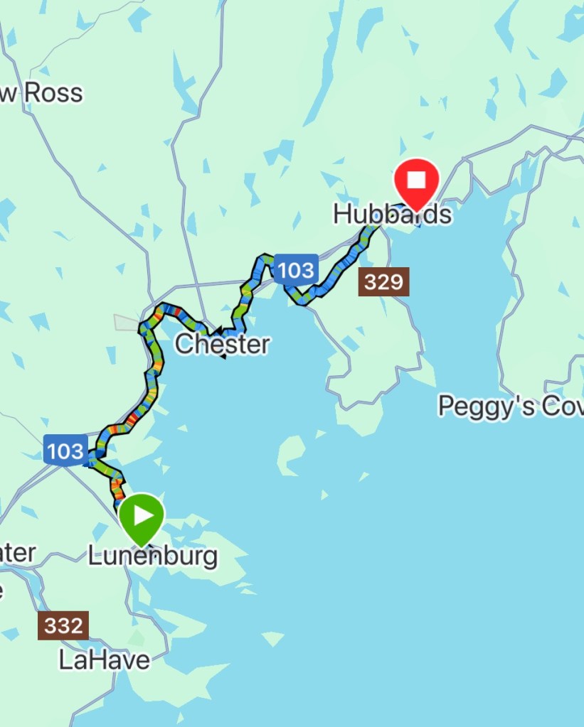 Then it was heavy rain out of Mahone Bay, which had us seeking shelter in a little wood-and-wisteria hidey-hole within the next 10km.