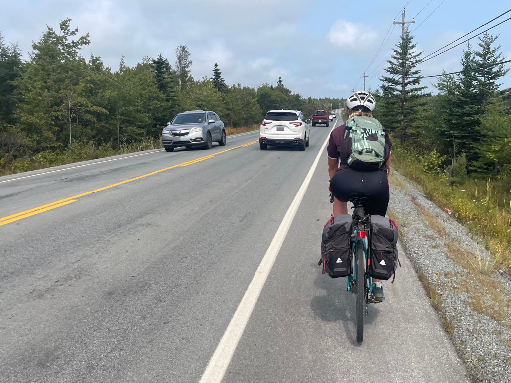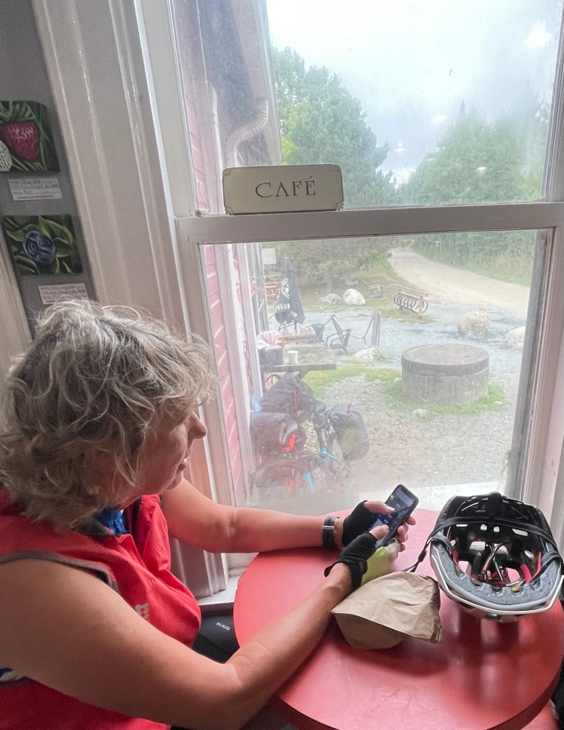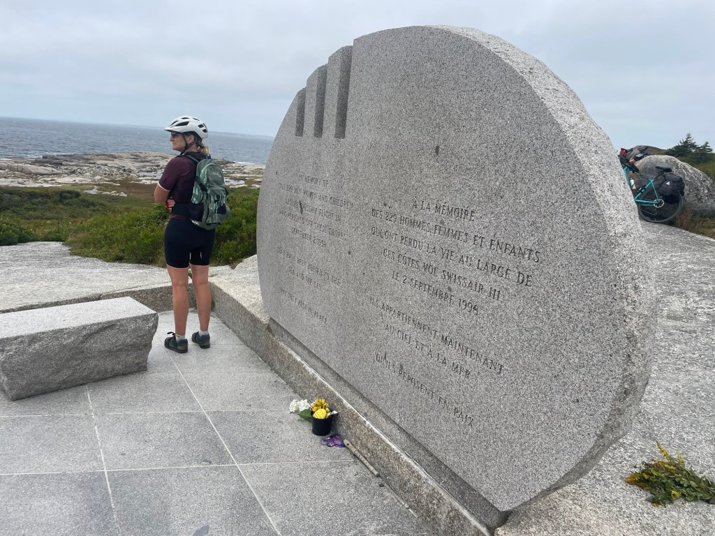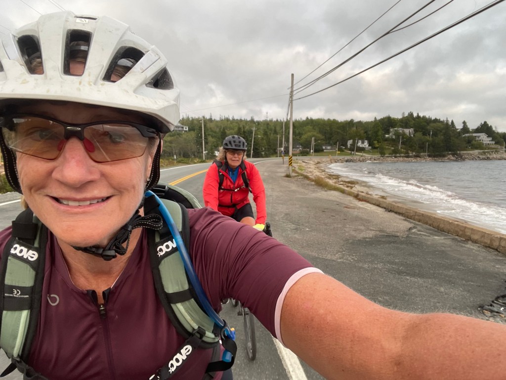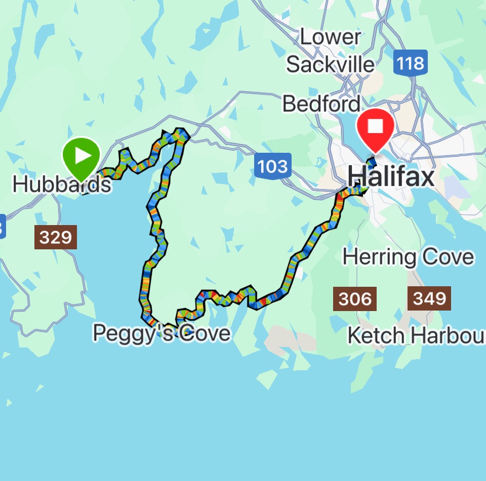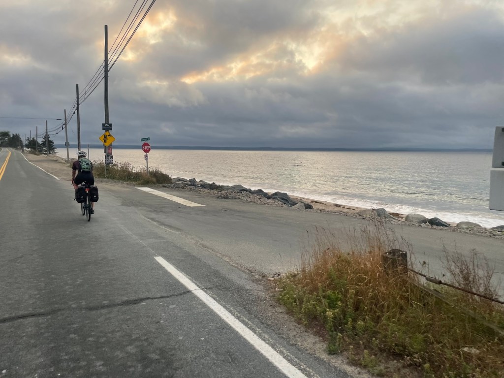 We had agreed yesterday that if the weather was foul we would skip the additional 45km down to Peggy’s Cove and head straight to Halifax. But here we were riding the “rolling hills” into the headwind around St Margaret’s Bay to Peggy’s Cove.